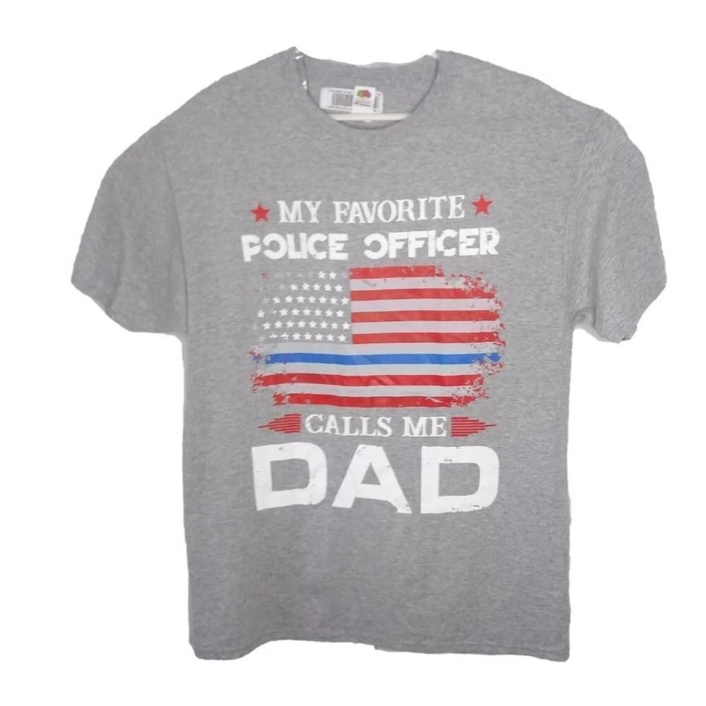Show your love and support with this unique graphic tee! This gray t-shirt proudly displays a distressed American flag design with a blue line, accompanied by the words "My Favorite Police Officer Calls Me Dad." It's a heartfelt way to honor the special police officer in your life and celebrate the bond between a father and child. Perfect for wearing to a police appreciation event, a family gathering, or simply as a comfortable everyday shirt to show your pride. Keywords: police officer dad t-shirt, father's day gift, thin blue line shirt, american flag tee, patriotic shirt, graphic tee, dad shirt, police support, gift for police dad, fruit of the loom, gray t-shirt, men's t-shirt, casual wear -Classic fit -50/50 preshrunk cotton/polyester Size - Large Chest (underarm to underarm)- 22" Length- 32" Please see pictures for more details. Condition: Excellent. Brand New SKU:570