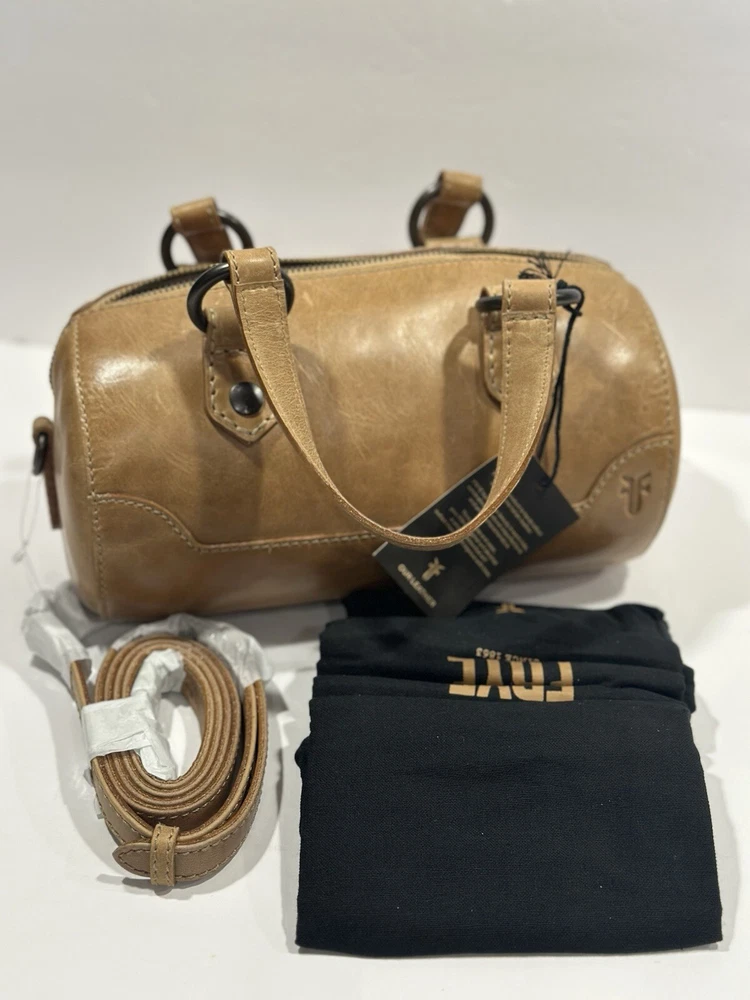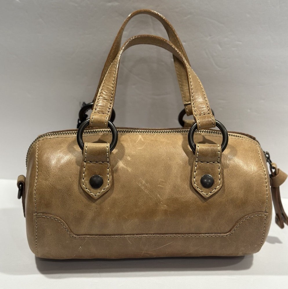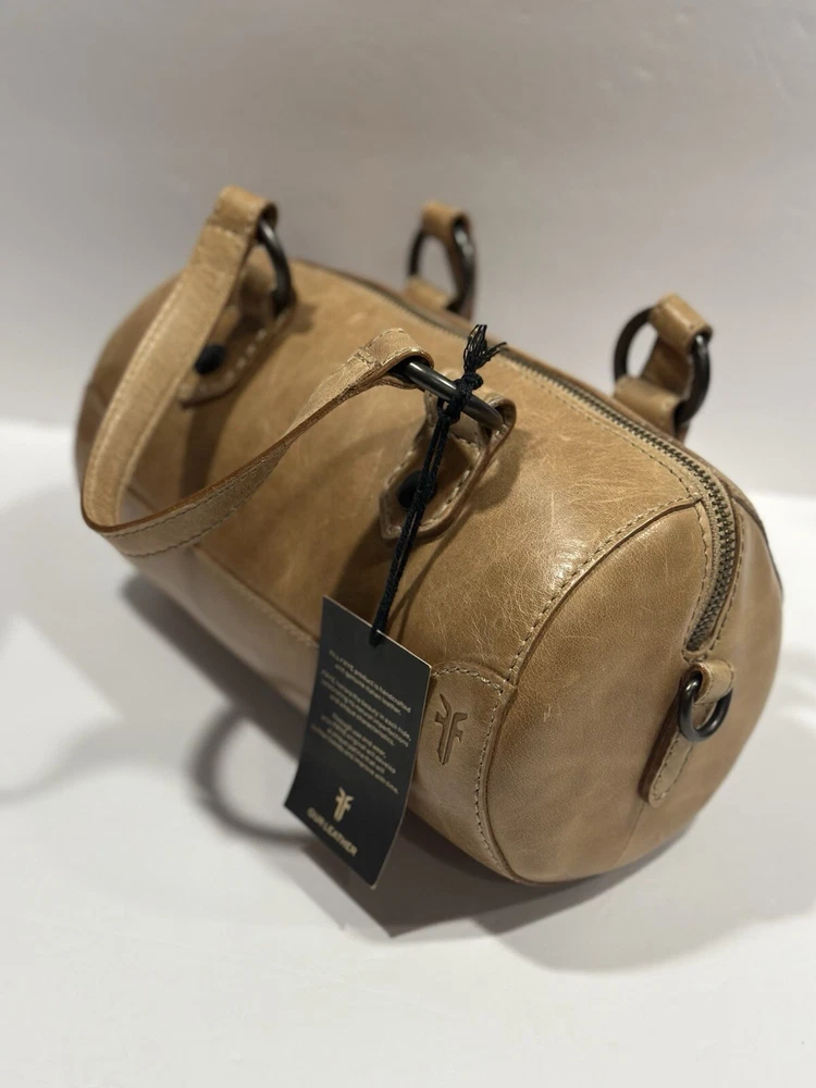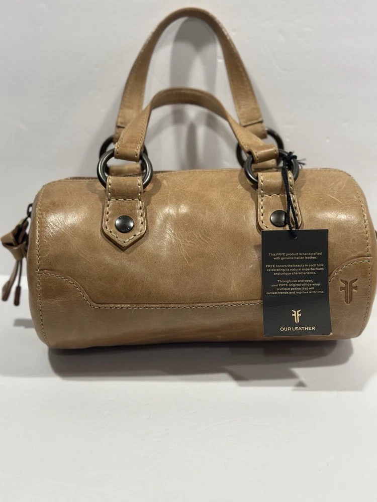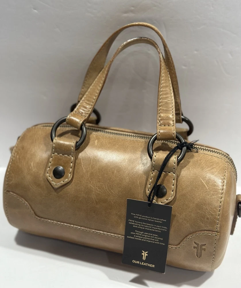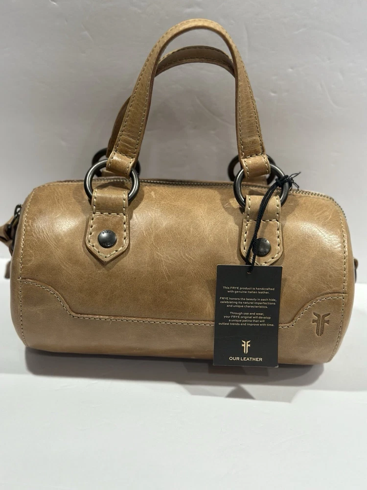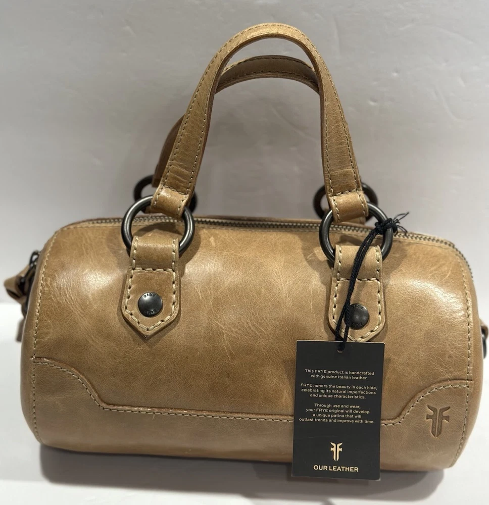 Frye Melissa Mini Barrel Crossbody / HandBag Frye Melissa Mini Barrel Crossbody Bag with adjustable leather crossbody strap and zipper closure Antique pull up leather and italian leather; Antique metal hardware 1 interior slip pocket Measurements: 9.25"H X 5.25"W; 23" Strap Drop