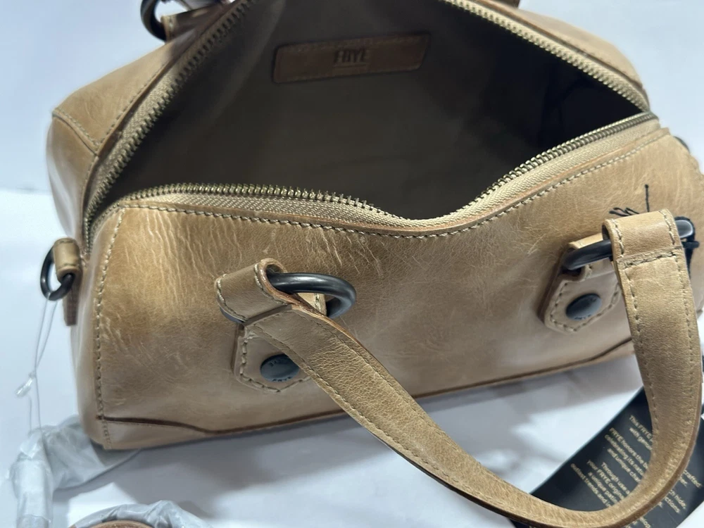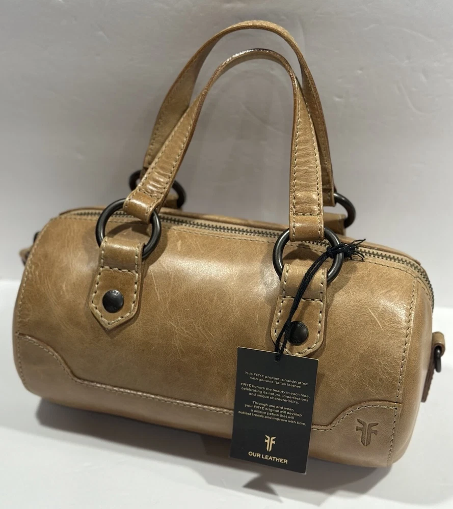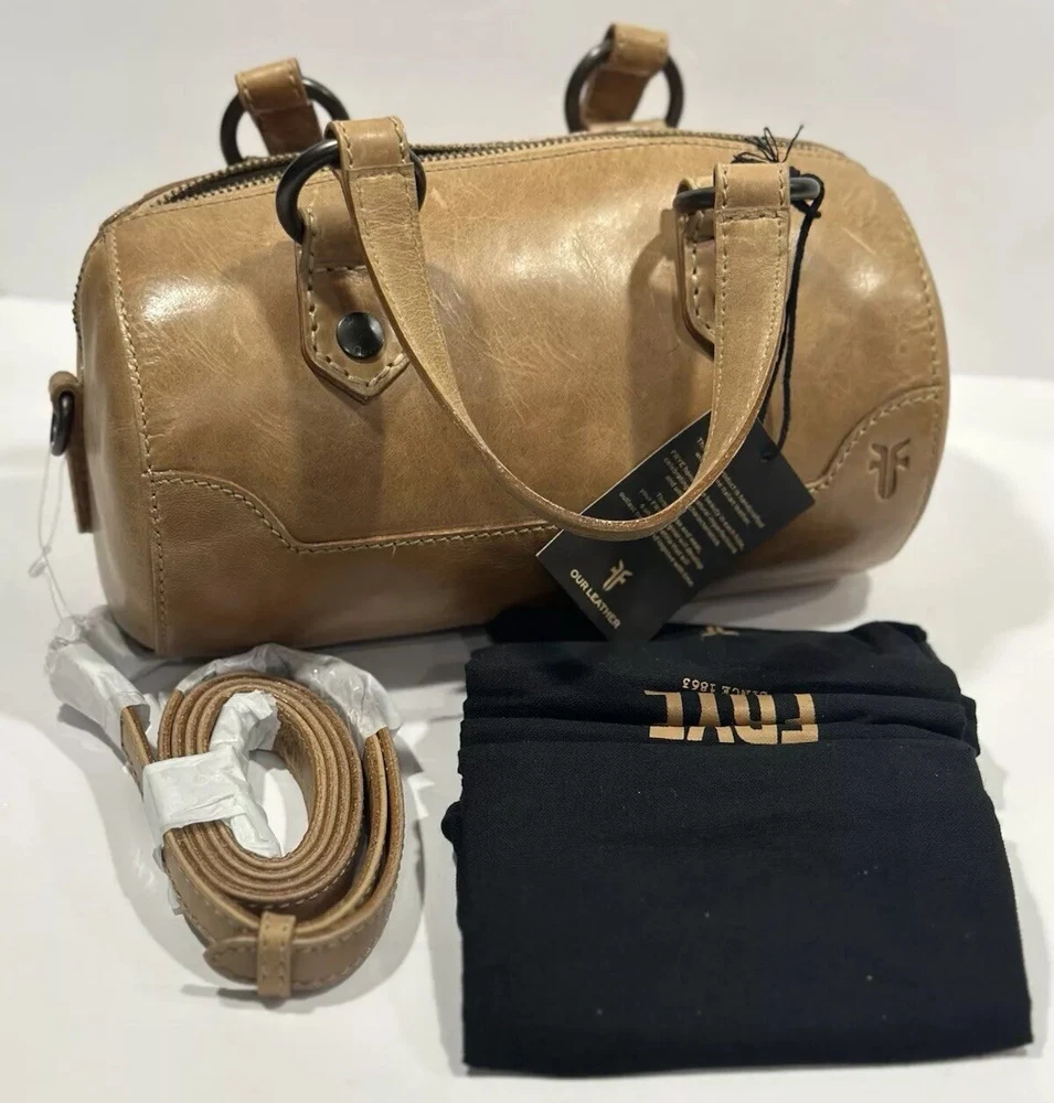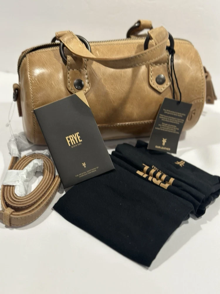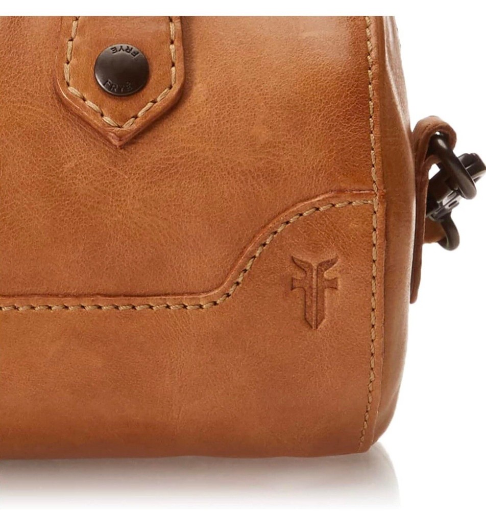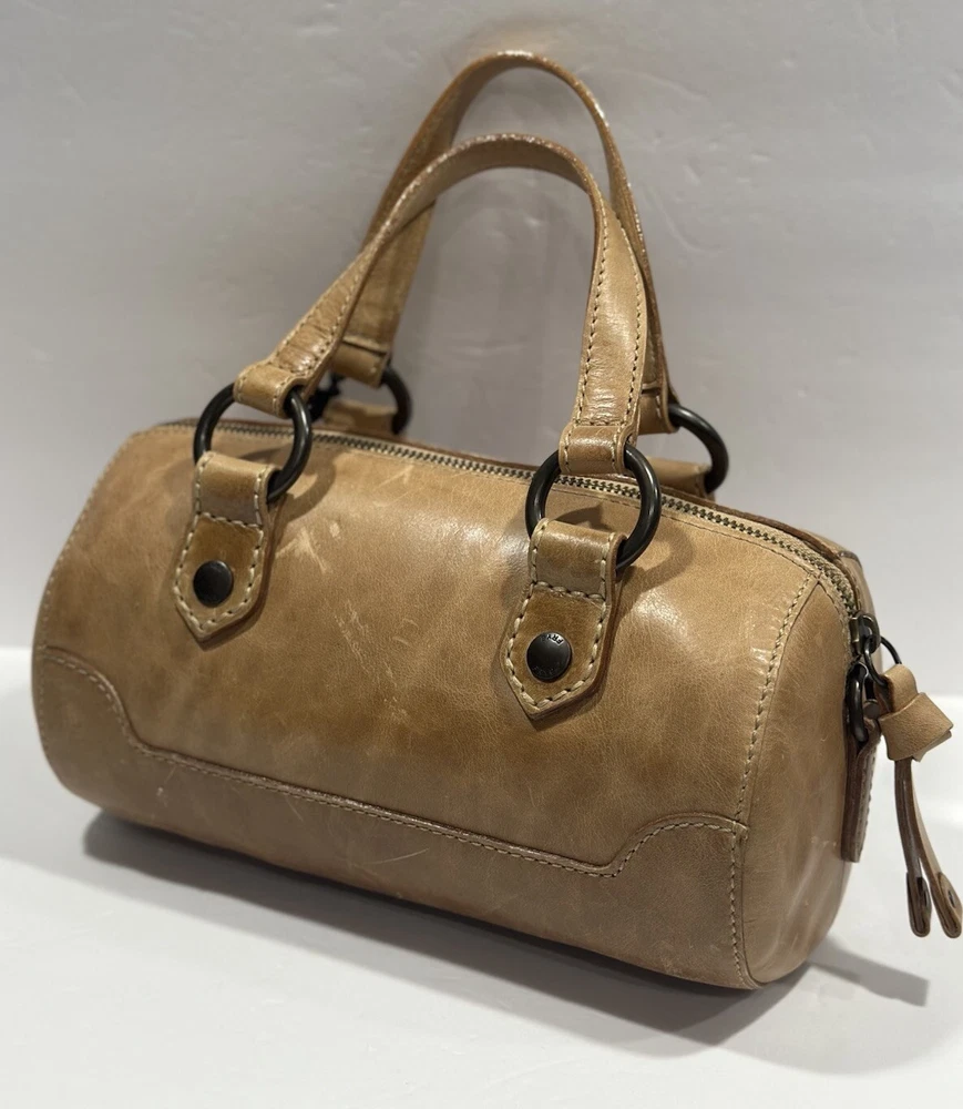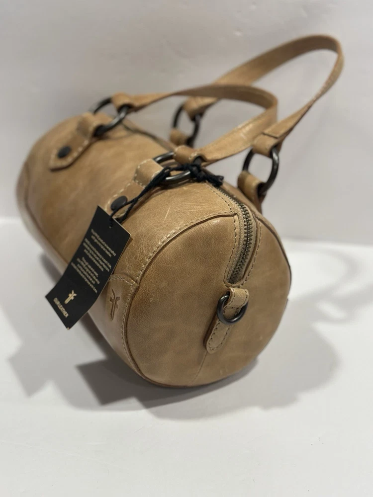 Frye Melissa Mini Barrel Crossbody / HandBag Frye Melissa Mini Barrel Crossbody Bag with adjustable leather crossbody strap and zipper closure Antique pull up leather and italian leather; Antique metal hardware 1 interior slip pocket Measurements: 9.25"H X 5.25"W; 23" Strap Drop
