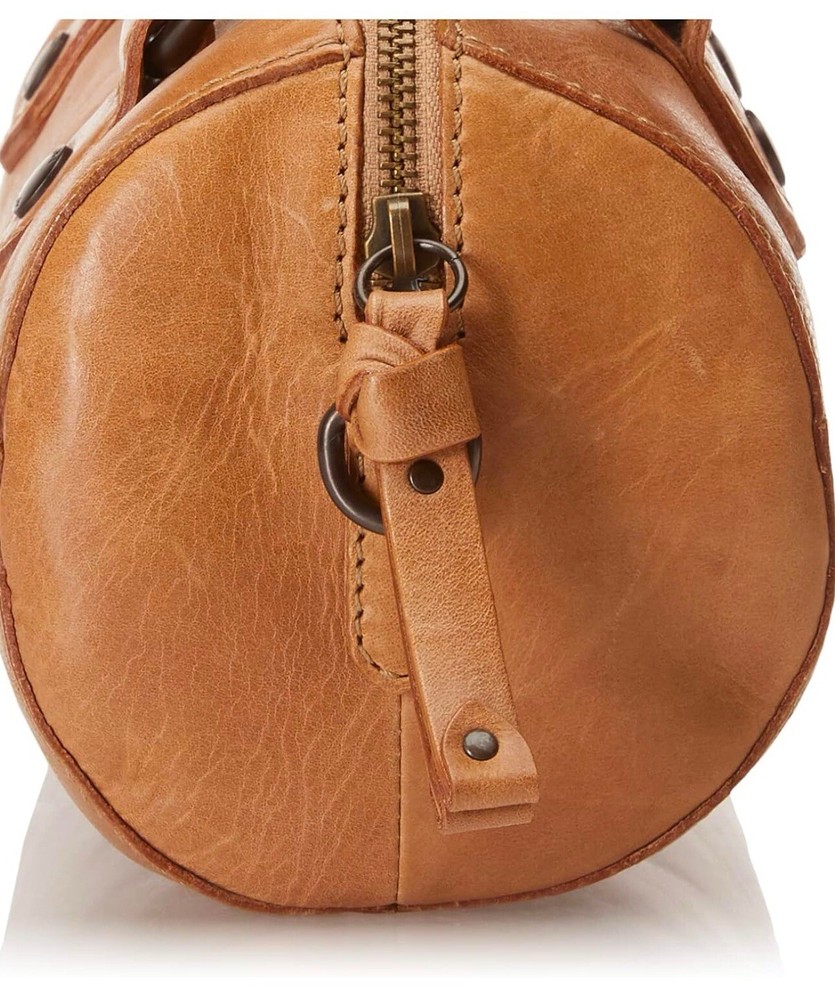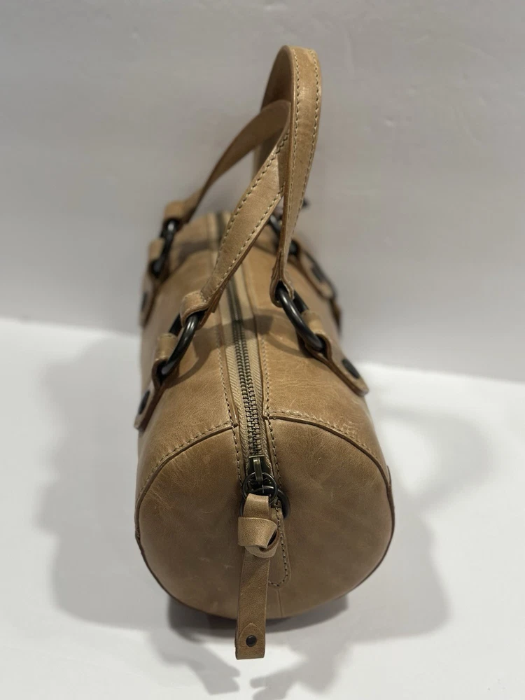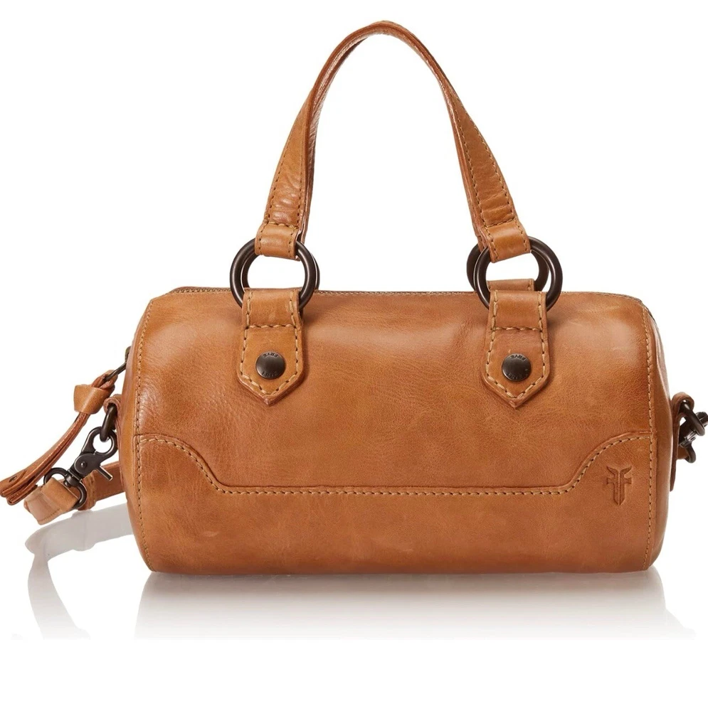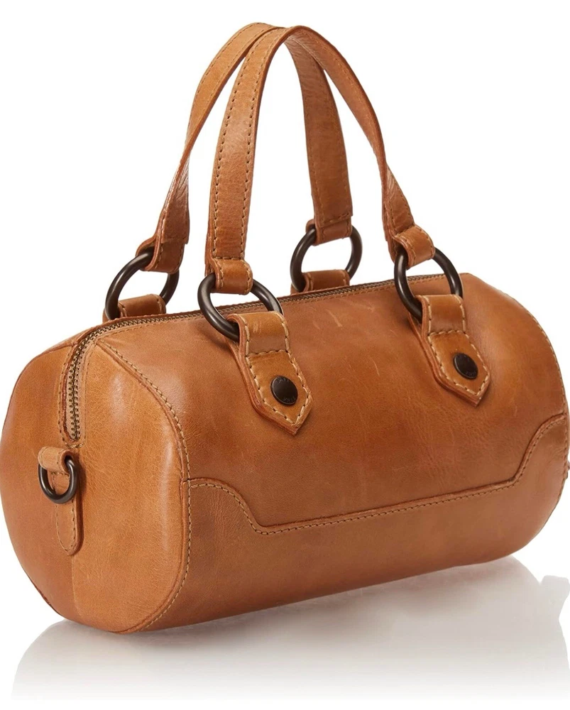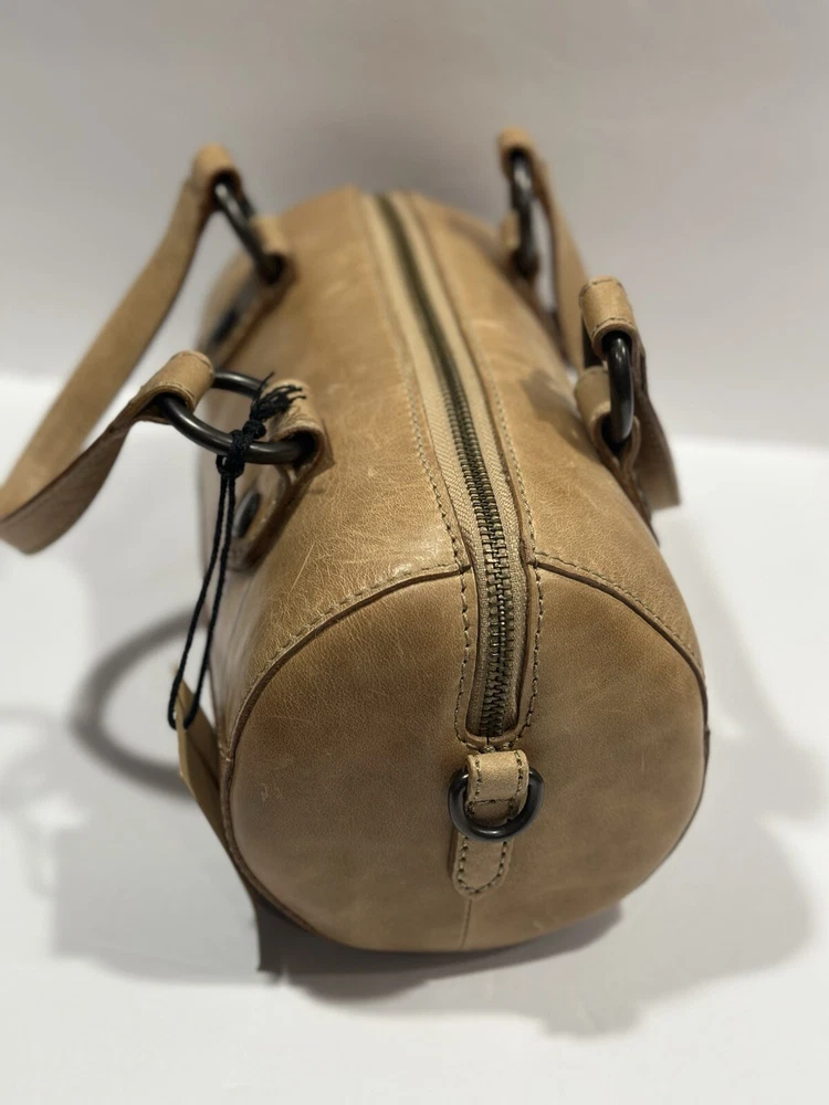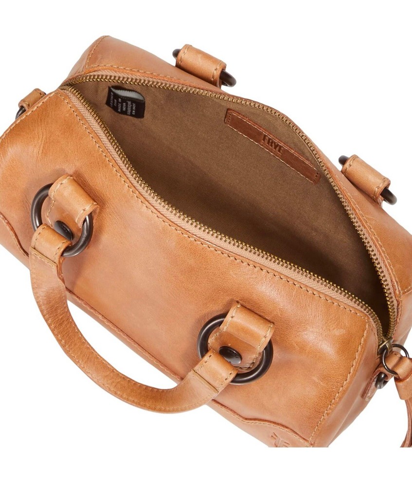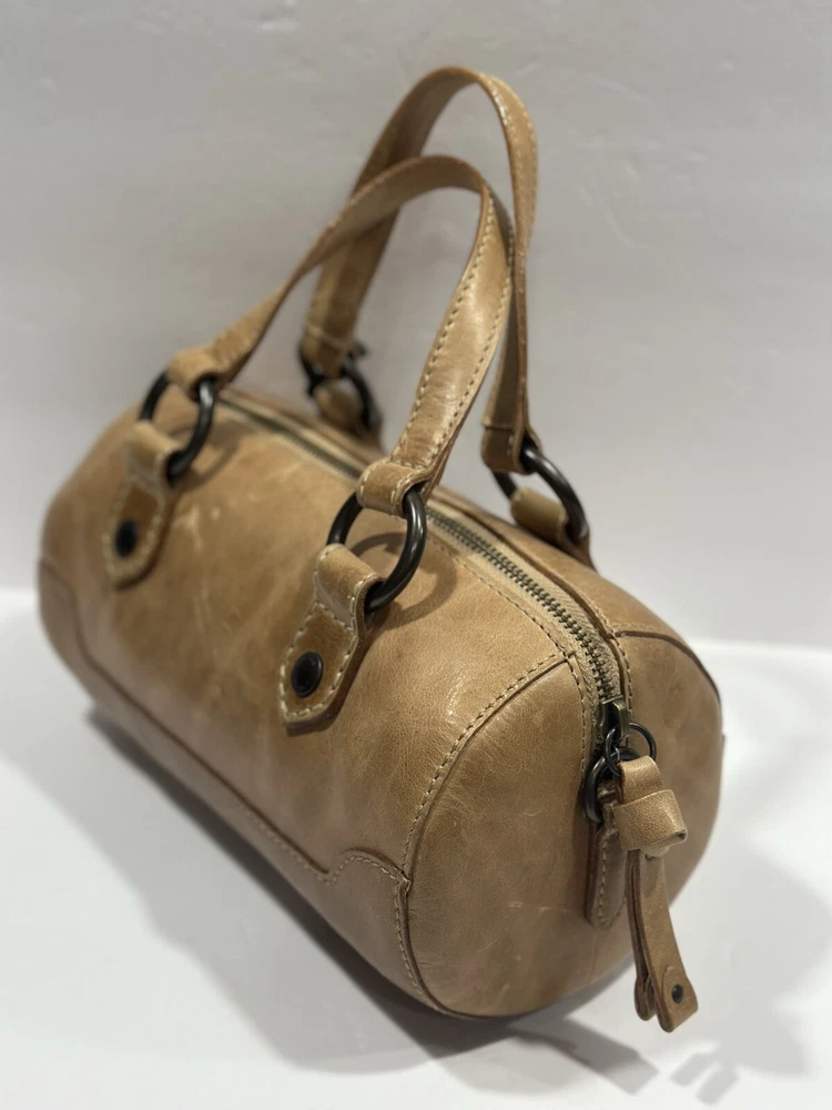 Frye Melissa Mini Barrel Crossbody / HandBag Frye Melissa Mini Barrel Crossbody Bag with adjustable leather crossbody strap and zipper closure Antique pull up leather and italian leather; Antique metal hardware 1 interior slip pocket Measurements: 9.25"H X 5.25"W; 23" Strap Drop