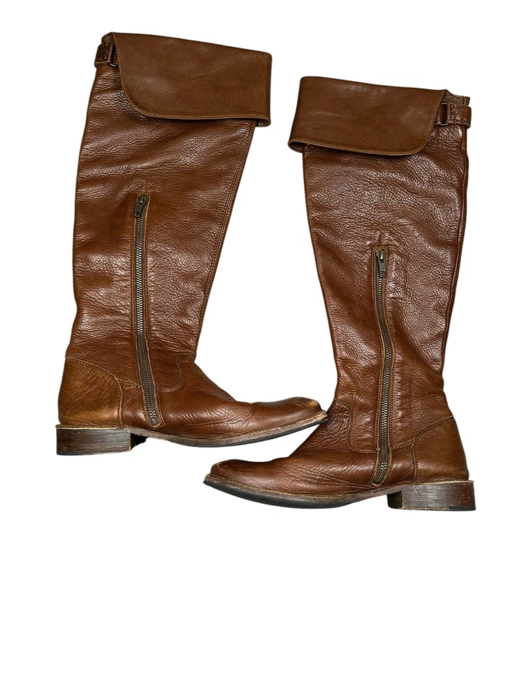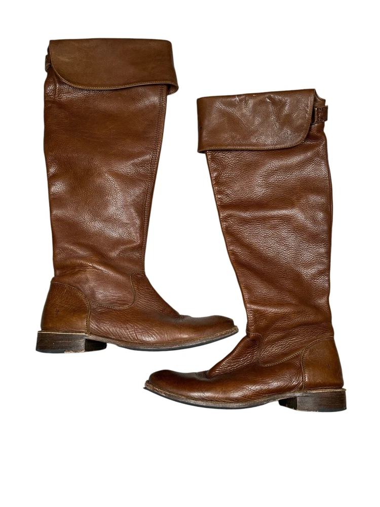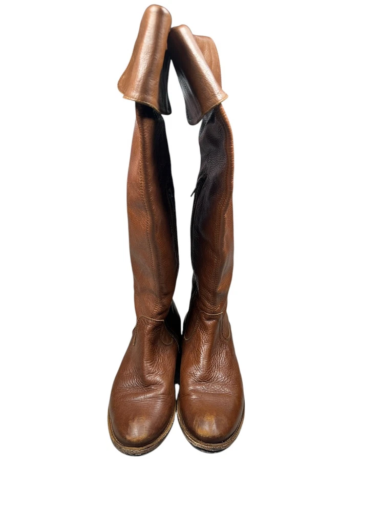 Frye Shirley Boots Leather Brown Sz 8 B Over The Knee Tall Riding Side Zip stain on fold over part - see photo Please reach out with any questions or if you are wanting additional photos!