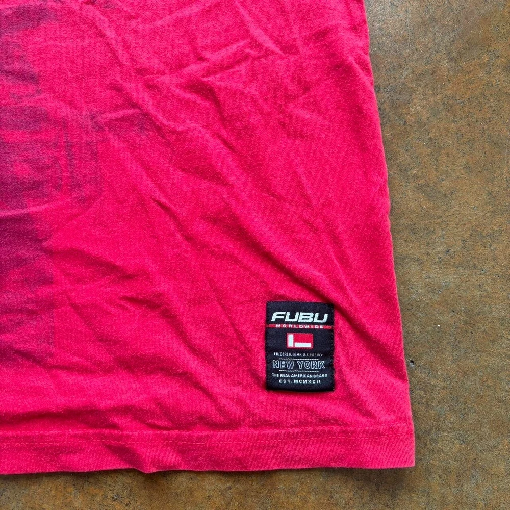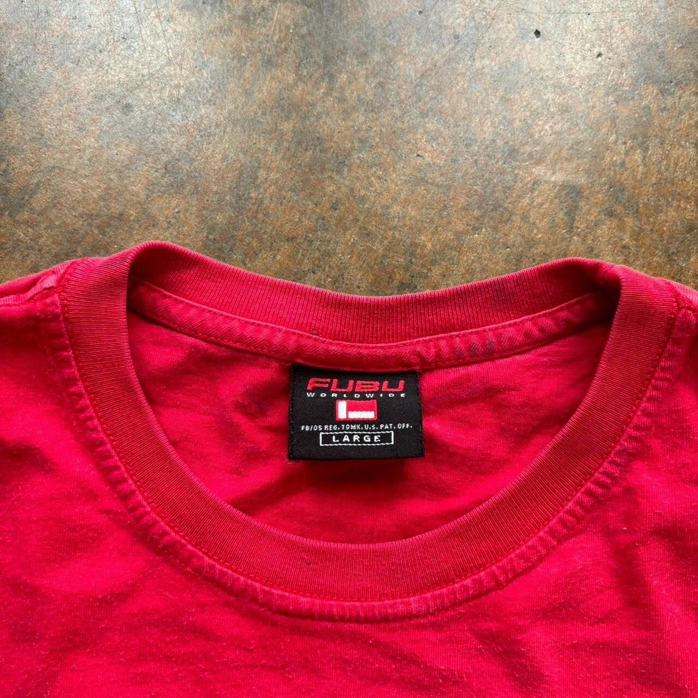 Theme: 90s, Hip Hop, Sports, Transportation Vintage: Yes Year Manufactured: 2000-2009 Country/Region of Manufacture: United States Fit: Regular Color: Red Brand: FUBU Season: Fall, Spring, Summer, Winter Handmade: No Garment Care: Machine Washable Accents: Logo Neckline: Crew Neck Department: Men Size Type: Regular Pattern: Graphic Print Sleeve Length: Short Sleeve Size: L Personalize: No Type: T-Shirt