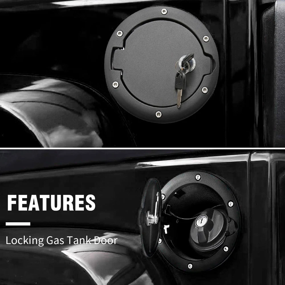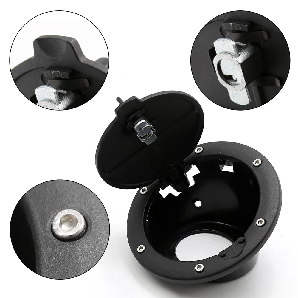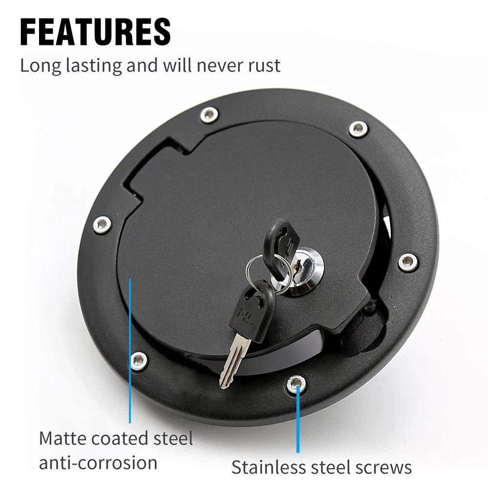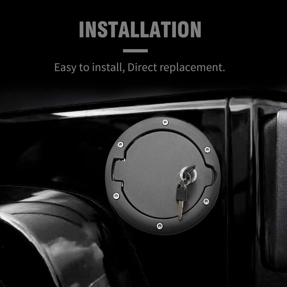 Specification: Color: Black Material: Aluminum alloy and ABS plastic Diameter: 6.5 inch Fitment: Only replacement for Jeep Wrangler JK 2007-2018(not fits Jeep Wrangler JL) Feature: Rust; wear; corrosion; oxidation resistant Direct replacement, no drilling required or cutting required Hardwearing, beautiful appearance, effectively preventing scratches, not easy to get dirty Package Includes: 1X Fuel Tank Gas Cap 2X Keys Fitment: The fuel filler door locking gas tank cover only replacement for Jeep Wrangler JK 2007-2018(not fits Jeep Wrangler JL) Reliable Material: Fuel filler door cover is made of aluminum and ABS, reliable, rust and corrosion resistant, effectively preventing scratches Easy Installation: You can directly install the old damaged gas cap with screws, which looks beautiful and sturdy Package Content: 1 piece of Fuel Tank Gas Cap, 2 piece of key Warm prompt: Please pay attention to check the applicable models, which are not suitable for Jeep Herder JL