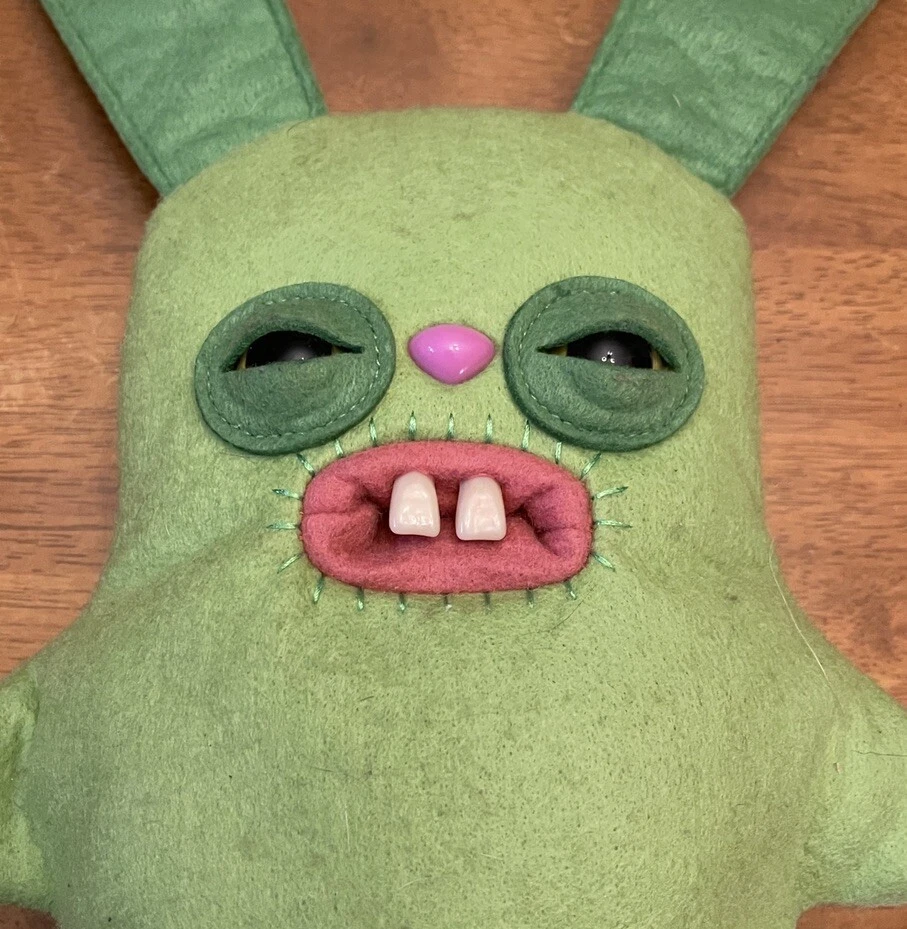 Get ready to cuddle with this adorable Fuggler Rabid Rabbit plush toy! This green monster rabbit has big teeth and a scary appearance, but don't let that fool you. This plush toy is perfect for kids aged 4 and up, and it's made with high-quality materials that ensure it will last for a long time. The Fuggler Rabid Rabbit plush toy is small in size, measuring between 6-14 inches, and it's recommended for kids aged 4+. It's also washable, which makes it easy to keep clean. This toy is part of the Fugglies character family, and it's made in China. With its unique design and cute features, this plush toy is sure to become a favorite companion for any child. This plush is in good preowned condition with light signs of wear, please see ALL photos for a better idea on condition, any measurements, or details to the plush.