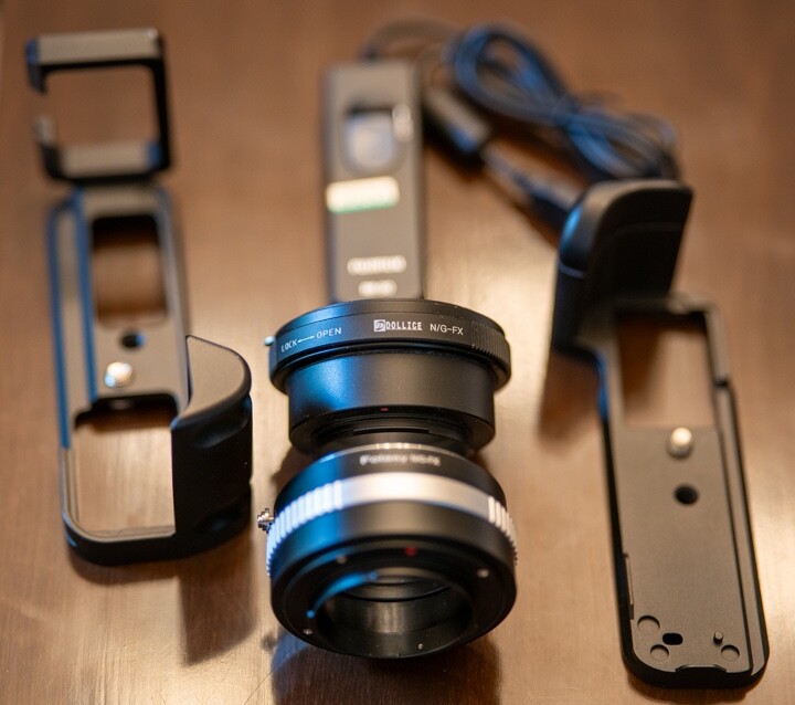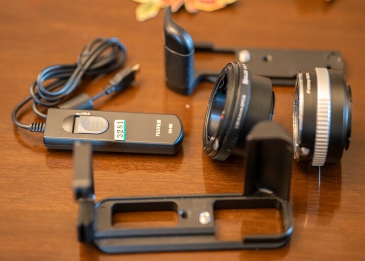Two grips one is JJC the other is misc. brand. Two lens adapters for Nikon lens to Fuji x-mount. One is Fotasy other Dollie both have aperture control. Wired remote is Fujifilm RR-90. Grips and remote release is for Fuji X-T30. The lens adapters will fit any sony X-mount cameras. All like new