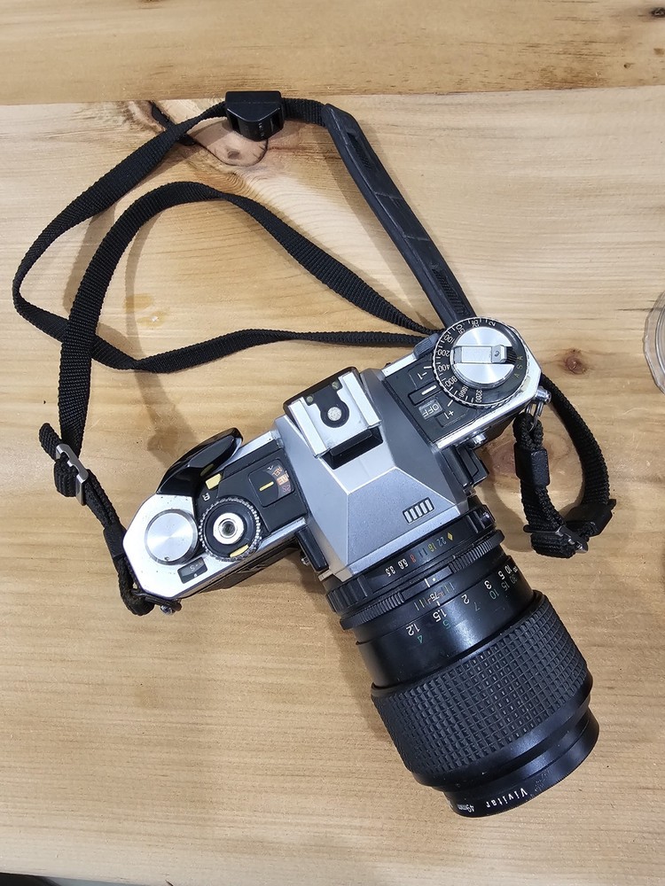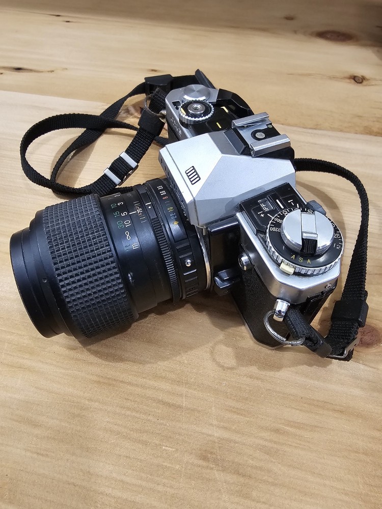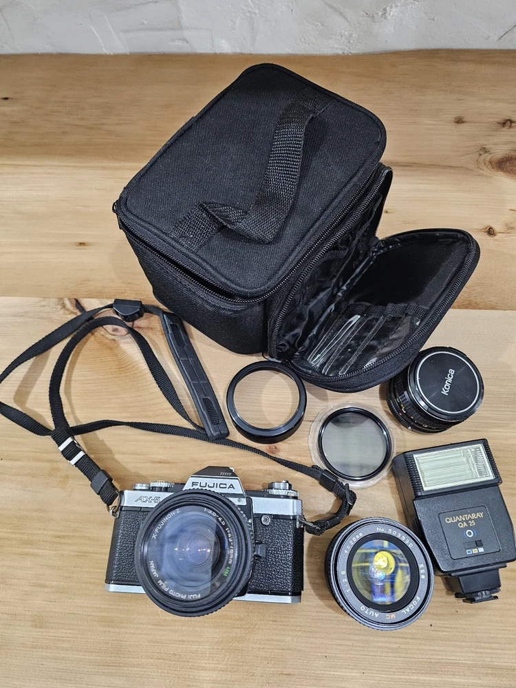 The Fujica AX-5 is a 35mm SLR camera manufactured by Fuji in the early 1980s. It belongs to the film photography category and is a classic piece for collectors or enthusiasts of vintage cameras. With its manual controls and sturdy SLR design, the Fujica AX-5 offers a retro photography experience with a modern touch. Perfect for capturing timeless moments and experimenting with the aesthetics of film photography, this camera is a reliable choice for those who value quality craftsmanship and classic design. Fujica AX-5 is a 35mm SLR camera manufactured by Fuji in the early 1980s. It is one of three cameras, including the AX-3 and AX-1. These cameras share a similar body, but the AX-5 features more exposure program modes and was the top-of-the-range model. It has a silicon exposure meter and exposure modes: programmed, shutter priority, aperture priority and manual. The focal plane shutter is electronic, with a maximum speed of 1/1000 and a v