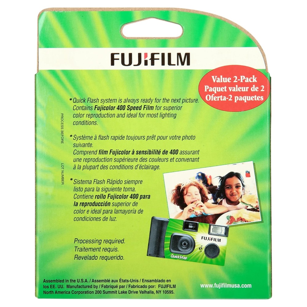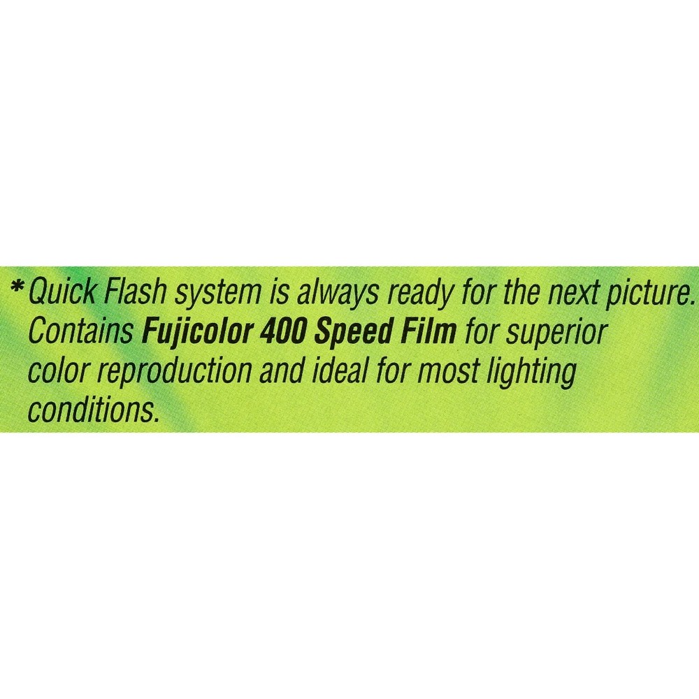 Product details The Fujifilm Disposable 35mm Camera enables you to take pictures anytime and share the fun with your friends. It features 27 exposures to help you capture a variety of photos. The Fujifilm Disposable Camera comes complete with Superia X-TRA 400 film that provides you with quality images when developed. This item offers you an economical way to supply all your guests with a camera to capture special moments at significant events. The camera comes complete with a flash so it can be used in all conditions. You can put it on tables at weddings or other special occasions so your guests can take photos. Fujifilm Disposable 35mm Camera with Flash 2 Pack: re-loaded with Superia X-TRA 400 film 27 exposures Available in single or double pack Shoot and share your favorite fun-packed moments Clear, sharp images upon developing Economical way to supply guests with photo-power Use on tables at special events for guest entertainment or on vacation Disposable camera with flash, 2 Pack