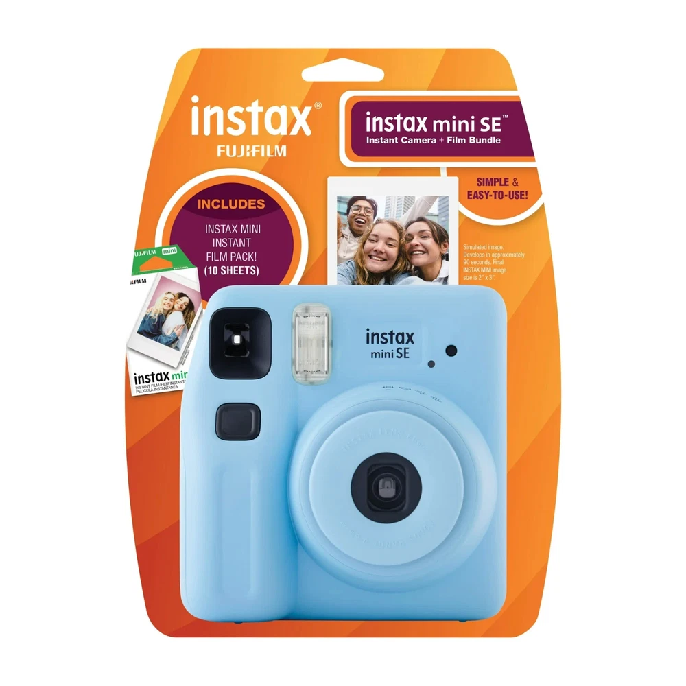Fujifilm instax Mini SE Instant Camera with Bonus 10 pack Mini Film, Light Blue (Exclusive Value Pack) The new Fujifilm Instax Mini SE Instant Camera is stylish, colorful, and compact. With its exposure control adjustment and easy point-and-shoot features, the Fujifilm Instax Mini SE will no doubt quickly become a favorite. Superior images are just an instant click away with the camera's high-quality FUJINON lens in combination with the Fujifilm Instax Mini Film. Just point, shoot, and let the fun start immediately. The new Instax Fujifilm Mini SE instant camera is available in five trending colors: Lavender, Light Blue, Light Pink, Seafoam Green, and Light Gray. This Blister Pack comes with a 10 Pack of Fujifilm Instax Mini Film. The Fujifilm Instax Mini SE Instant Camera gives you high picture quality that is simple to operate. Walmart Exclusive Fujifilm instax mini Bundle, LightBlue Fujifilm instax mini Camera Comes with 10 pack of film New Condition Manufacturer Part Number 000000000600023857 Brand Fujifilm Features Built-in Flash Assembled Product Dimensions (L x W x H) 4.00 x 2.00 x 5.00 Inches