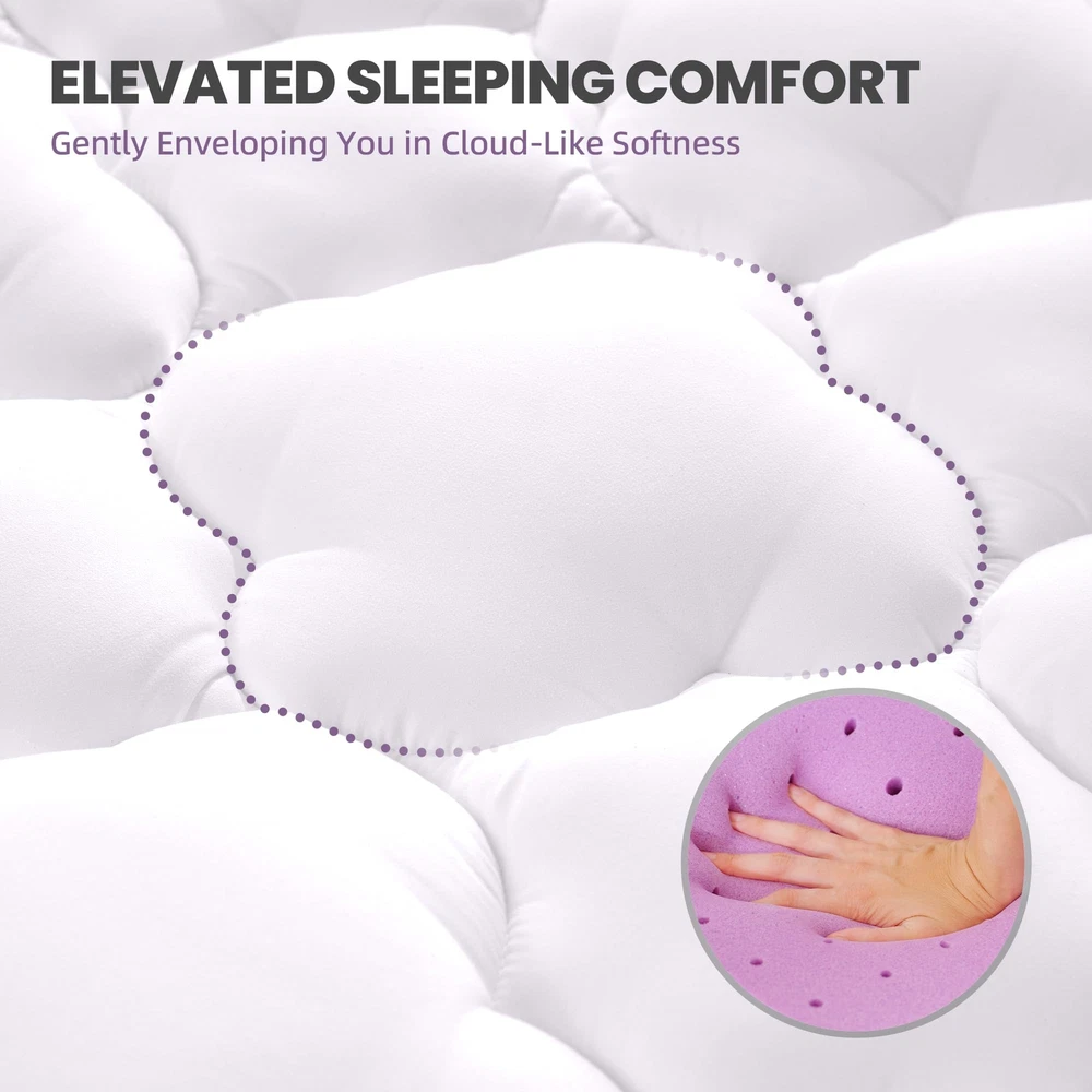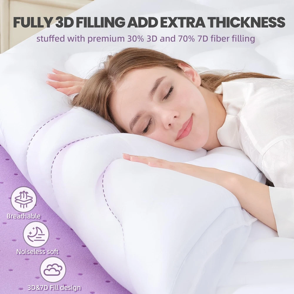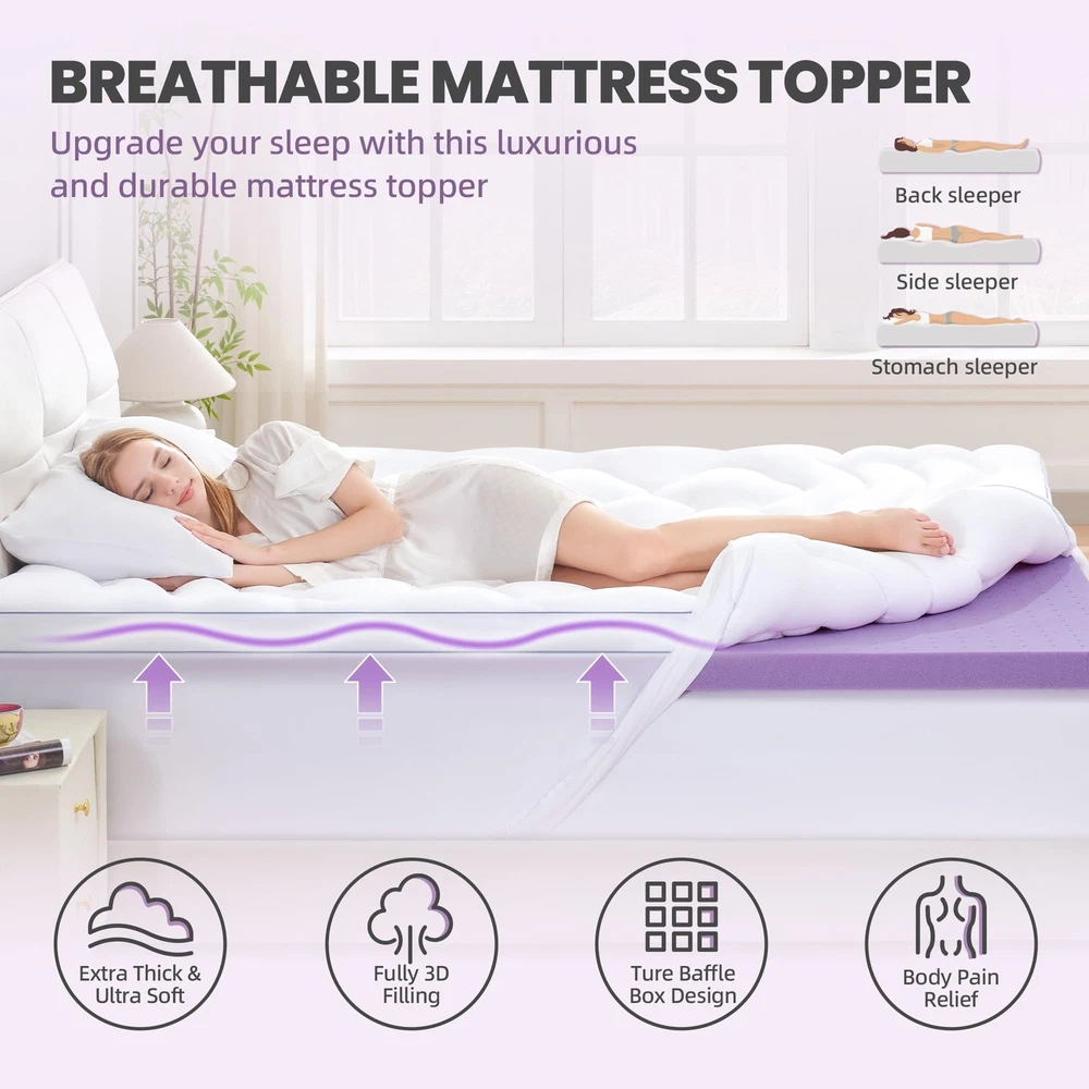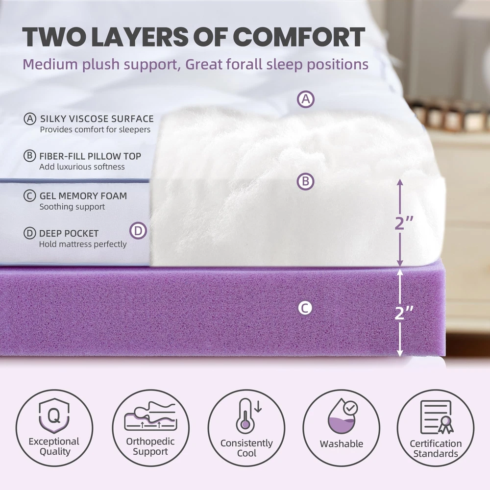 [4in Dual-Layer Comfort & Support]: Featuring a 2 inch cooling gel memory foam combined with a 2 inch microfiber mattress cover, overfilled with GSM 1450 soft down alternative brings you extra softness and ergonomic support to align your spinal perfectly, When combined, it can become a 4-inch thick mattress topper, which not only has strong support, but also provides a cloud-like comfortable experience. [Flexible Temperature Control]: The mattress cover offers flexible temperature control in different seasons. In the colder seasons, the two can be layered for both warmth and support, while in the warmer seasons, the gel-infused memory mattress topper can be used alone. It uses 3D&7D fiber made Three Dimensional Structure that makes the air circulate, gives superior comfort and cooling to keep the surface breathable and cool, brings you a refreshing night! [Relieve Pressure and Certified Quality]: Our soft memory foam mattress topper boasts high-quality construction gives you ergonomic support from head to foot. Fit the body curve, so that your shoulder, neck, back and spine can be in the most relaxed state, so as to relieve pain and CertiPUR-US certification. Skin-friendly materials secure your purchase. Each memory foam undergoes stringent pressure rebound testing to guarantee long-term durability without any collapsing issues. [Removable & Washable Down Alternative Cover]: The microfiber top layer can be cleaned easily. Machine washable in cold water, gentle cycle only, tumble dry low. Deep pocket design, which fits mattress between 8''-21''. And a 360° all-around elastic skirt, the bed topper clings steadfastly to your mattress fix the mattress all night and better your sleep. [Easy to unroll]: The topper is delivered to you compressed and needs 24-48 hours to fully expand (may take longer in low temperatures).We offer 12-hour customer support. Feel free to contact us with any questions, and we'll provide a satisfactory solution.