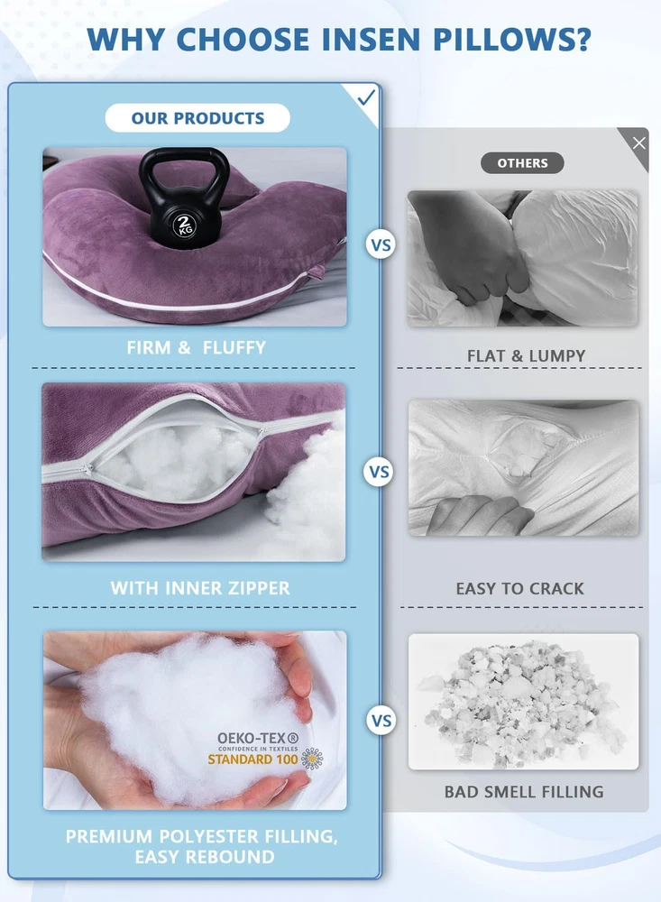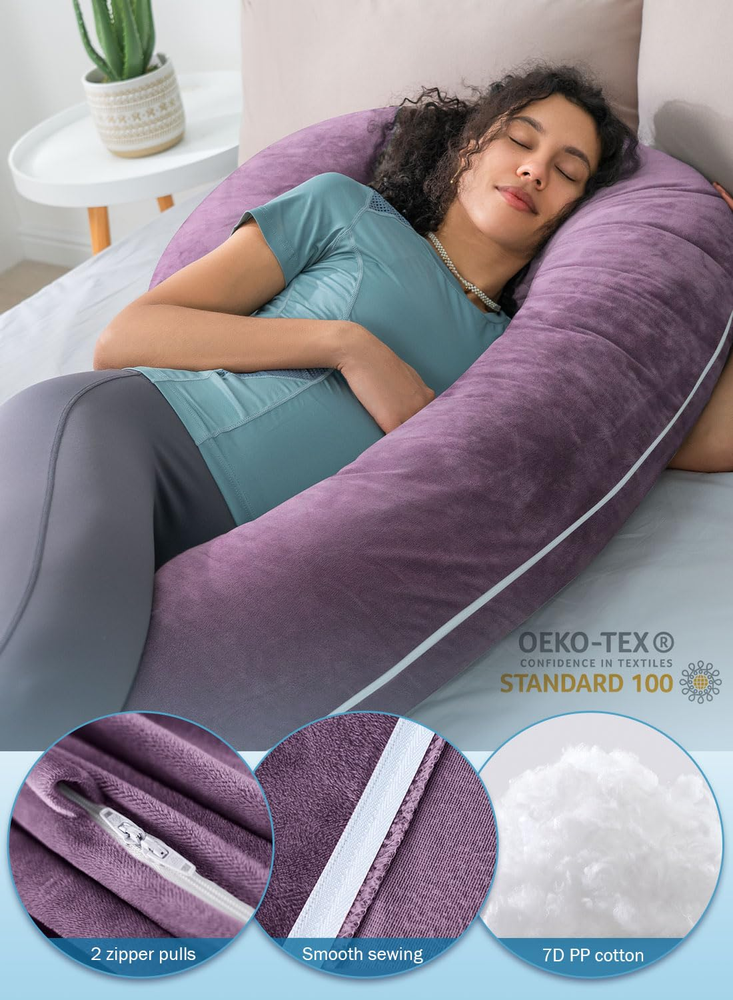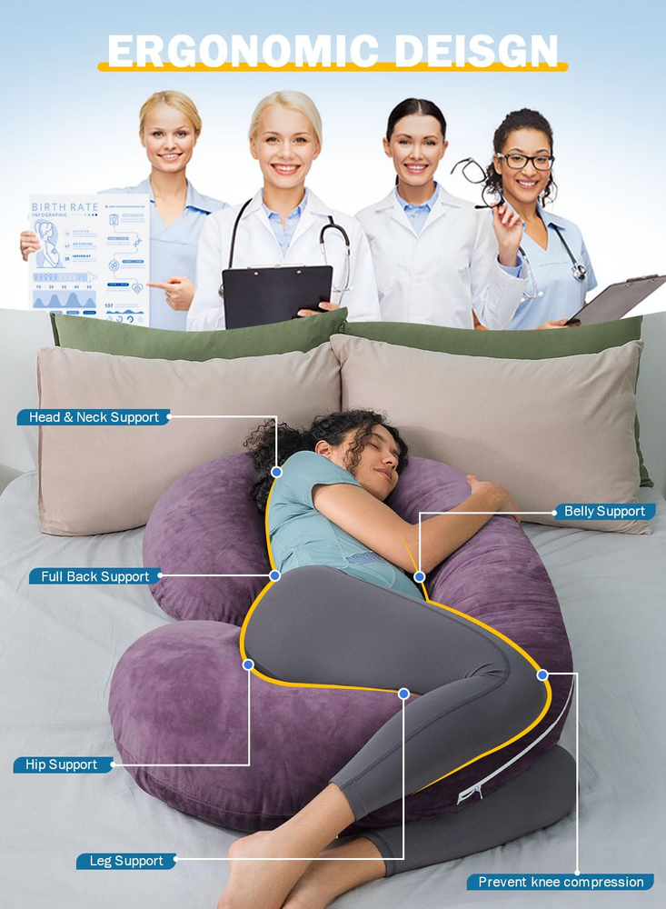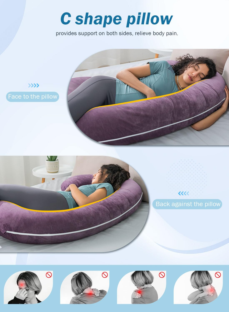 PRODUCTS DESCRIPTION AZ/46 100% Polyester Comfortable Pregnancy C Shaped. INSEN 58’’ Pregnancy C-shaped pillow comfort follows the contour and shape of your body and helps you relieve back pain, neck stiffness, and lower back pain. C-shaped is perfect for pregnant women with a full body surrounding support such as back, lower back, hip, leg, and feet support. This pregnancy C-shaped maternity support can relieve your pregnancy pain and pressure and improve sleeping and feeding. Premium fiber Filling. High-density soft fiber is not like other filling. We use long silk fiber that will stay smooth and stable inside the pillow providing comfort for side sleeping. Soft and full support pregnancy body pillow is based on a premium fiber filling. The breathable and hypoallergenic material cover is easy to clean and machine washable. Maternity Multifunctional Pillow. The flexible shape is adjustable when reading, watching TV/Movies, or playing games. You can fold it into a wedge pillow that helps you relax and elevate your leg to improve blood circulation. Relieving pregnancy swelling is so important for pregnant women. Full Body Support Pillow for Your Family. This C-shaped pillow is not just for pregnant moms or women. It can be widely used. Men or children who have experienced a day's work or cannot sleep stably. They need full relaxation and body support. Surrounding support is great for their sleeping to relax their work or study pressure Warmly Tips: Both outer and lining case have independent zippers to unpick and wash. Product Description C-shaped pillow relieves body pain while improving whole-body support. C shaped pillow design is combining ergonomics, each pillow has a corresponding functional area. The pillow conforms to the body's curves and each area functions to help relieve body pain. This pregnancy pillow helps to relieve these physical discomforts, body pressure, leg swelling or abdominal or back pain. Fits your body curved shaped C-shaped pillow provides more tightly support as increasing a body shape design. Total body support replaces the need for multiple pillows and supports your head, neck, spine, belly, back, hips, and legs. Belly and hip support Keeps the perfect balance between comfort and support for your belly and hips. Surrounding support is great for back and side sleeping. Multi-purpose use Position this pillow in a number of configurations on your bed, couch, sofa, or even the floor! Also, you can fold it into a wedge pillow for back support and elevation. When you try this C-shaped full body pillow, you will refresh your sleep experience! C-shaped pillow provides full body support during pregnancy. It fits your body and relieves discomfort during pregnancy. It calms unstable sleep emotions during pregnancy and improves the quality of sleep during pregnancy. Flexible and versatile, the pillow can easily change shape, suitable for a variety of scenarios and people! The C-shaped pillow can be easily changed into an S-pillow, allowing 2 people to use it at the same time. The pillow combines multiple functions, for example, it can be folded up to become a wedge body pillow, can be used as a back pillow, or as a leg pillow. The pillow is lightweight and easy to turn over and get out of bed even during the night. This C shaped full body pillow is also a bedrest pillow when you are watching a movie! It is a good movie time partner!