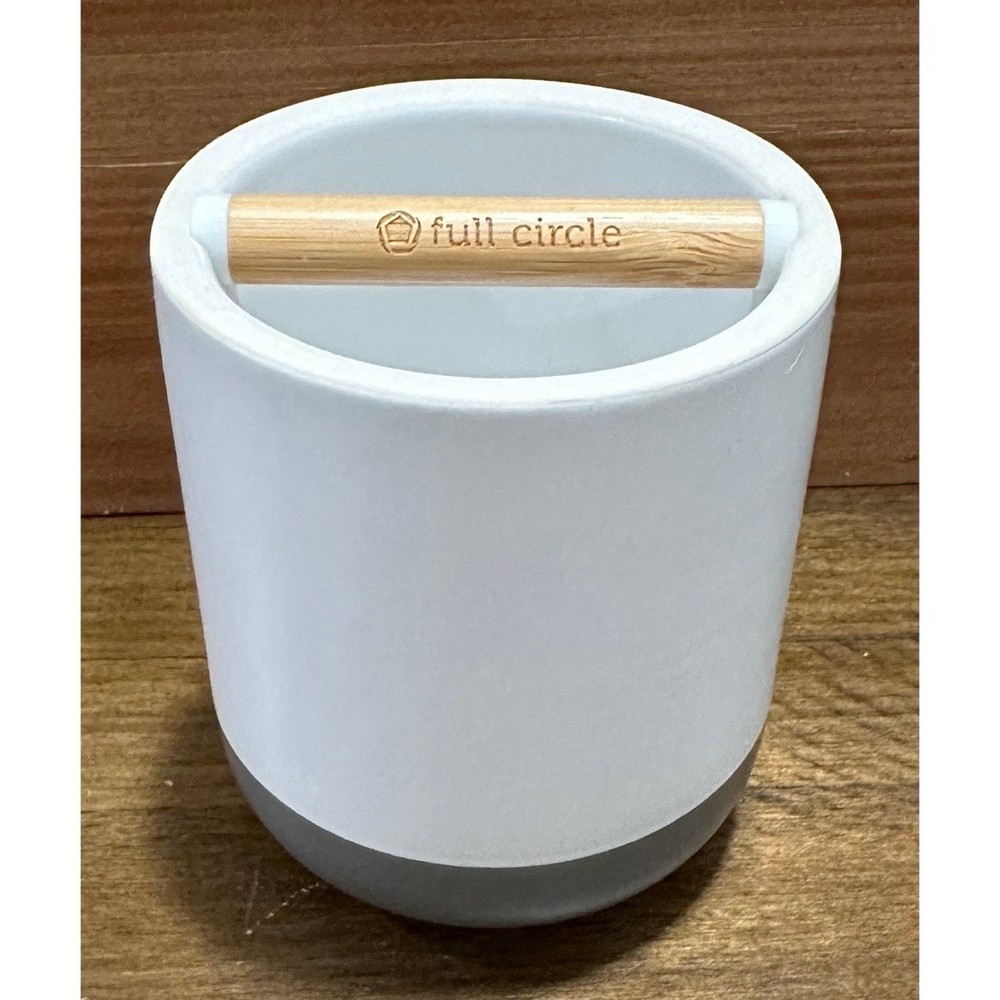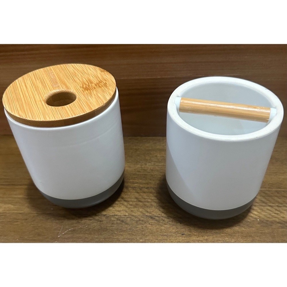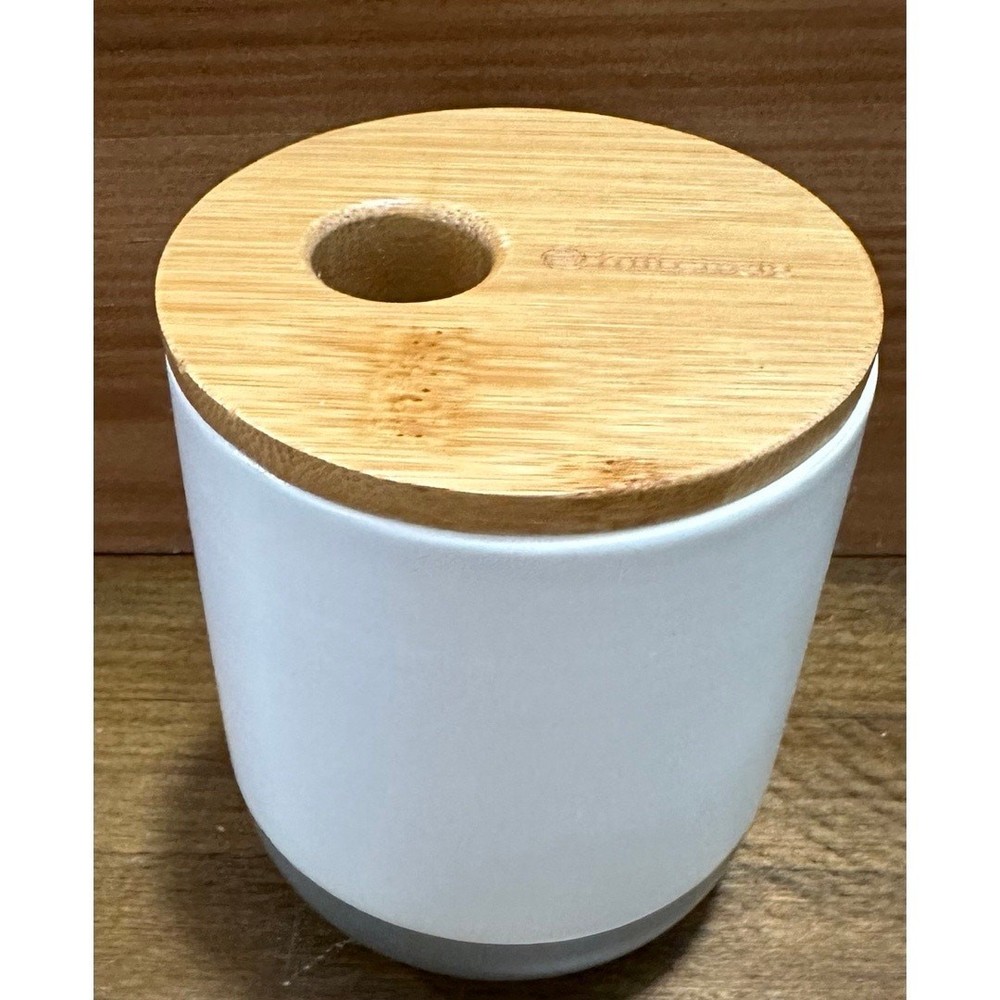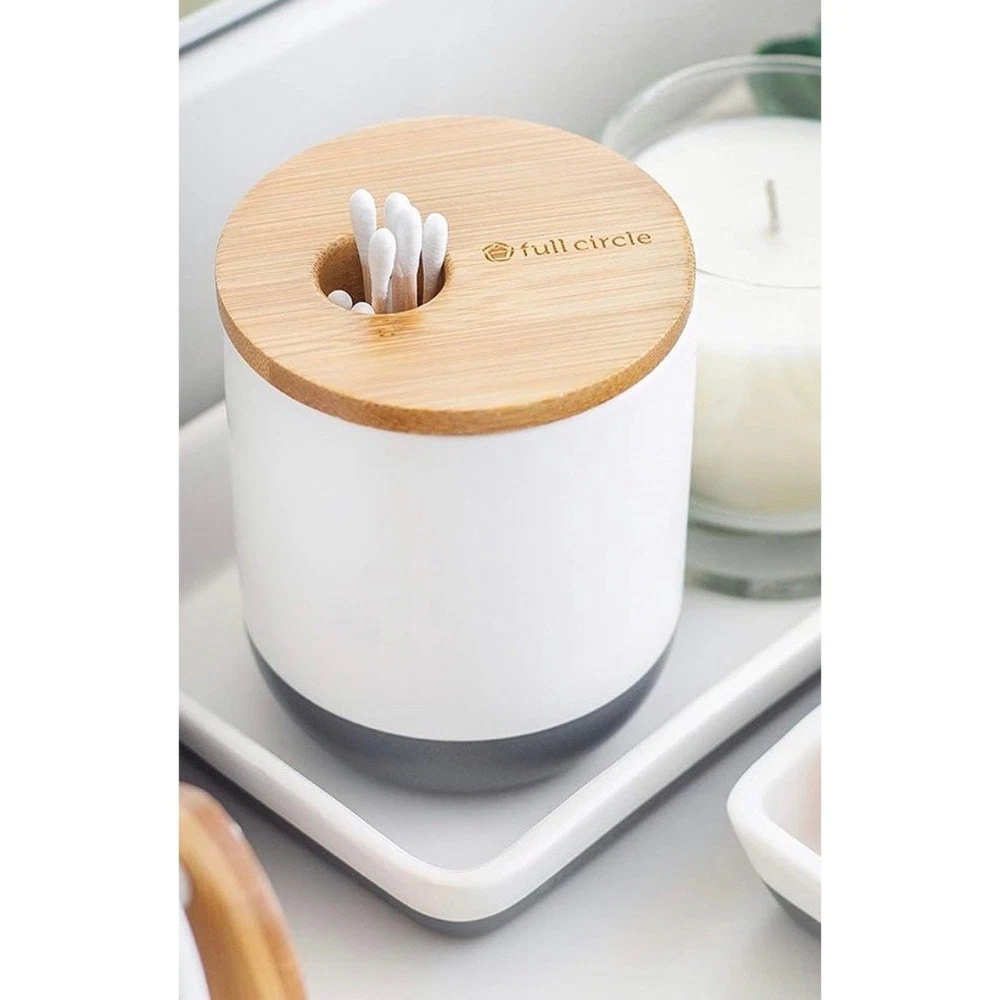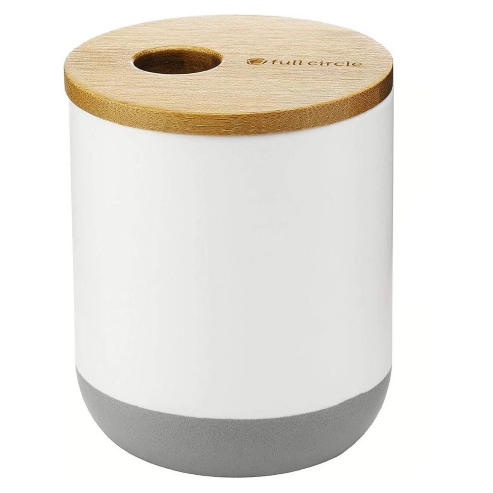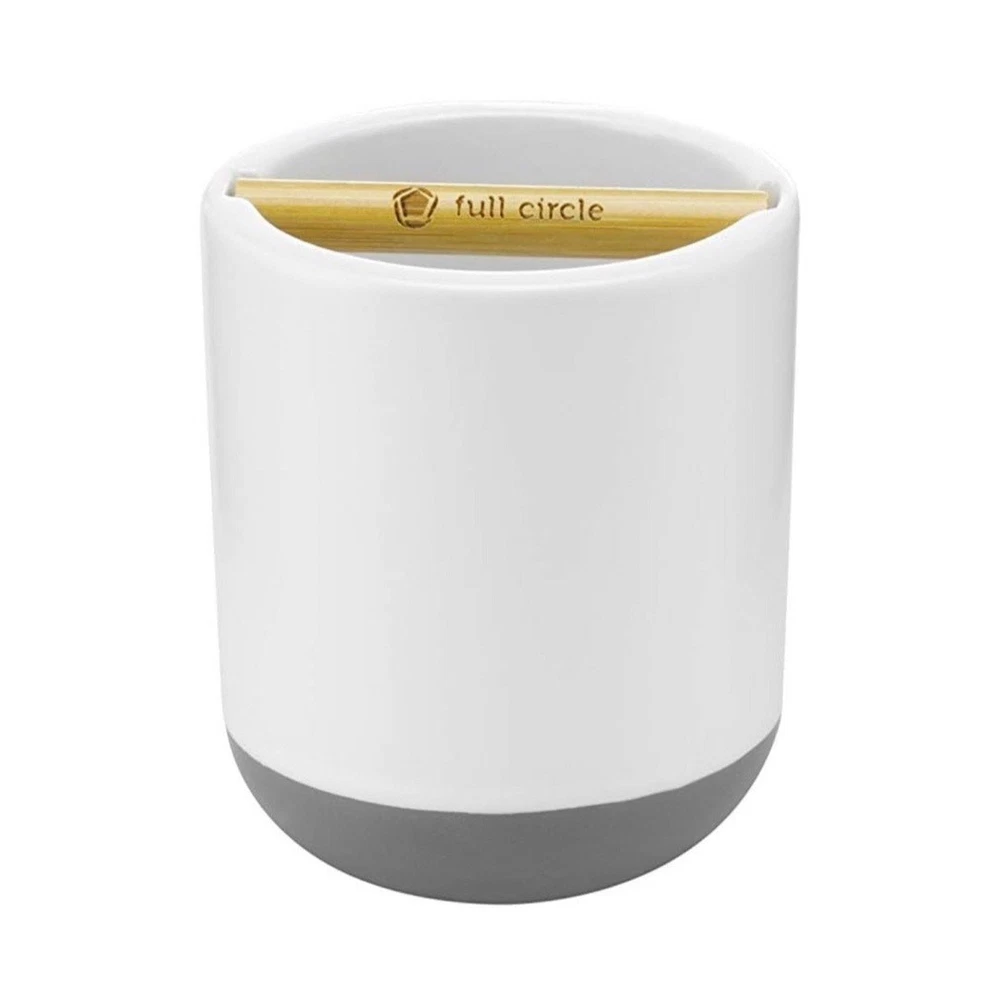 Brand: Full Circle Market: Home Goods - Bath Size: - Toothbrush holder: 3.4" x 3.4" x 3.75" - 1.2 pounds - Q-tip holder: 3.4" x 3.4" x 4.2" - 1 pound Color: White with dark grey bottom and light bamboo detailing Materials: Bamboo and ceramic Condition: Never used - in excellent condition. Style: Bridging the gap between environmentally conscious and intelligently designed products that are also stylish, Full Circle combines sustainability and function without sacrificing beauty. This set includes both a toothbrush/ toothpaste holder and matching q-tip holder. The bamboo and Ceramic design compliments any bathroom and the absorbent disk at its base eliminates stagnant water, mildew and bacteria. A specially fitted hole at the top q-tip holder dispenses cotton swabs, letting you grab one or two—not fifteen. The bamboo divider in the toothbrush holder is removable and keeps toothbrushes from touching.