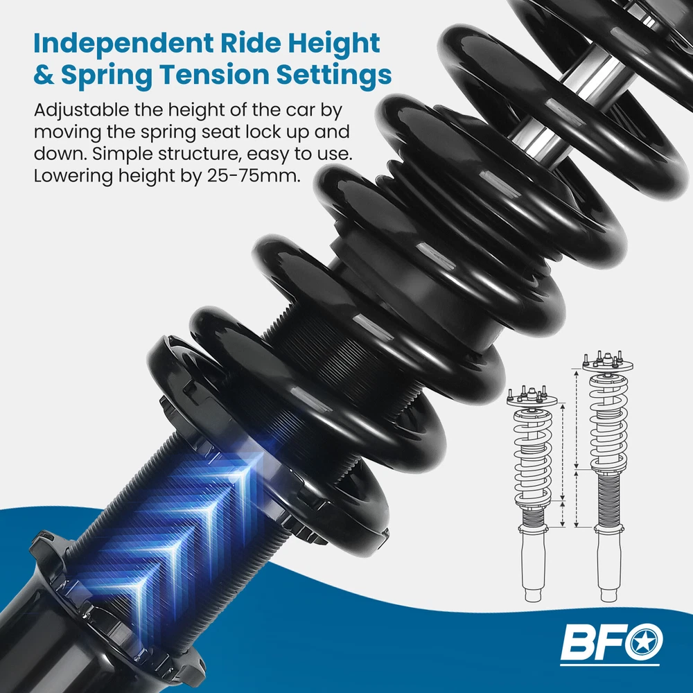 carpartsharehouse Home | Contact us | Promotion Fast hipping International Shipping 30 Days Return Policy Secure Shopping Full Coilovers Suspension Kit For Mitsubishi Eclipse 1995-99 Adj. Height Struts Most Competitive Price Manufacturer We know our products Easy Return Quick, Simple Guaranteed Fitment Always the correct part DESCRIPTION BFO coil-overs strike the perfect balance between aesthetics, performance, and comfort. The coilovers from BFO are a street-friendly and affordable option for those not looking to explode their bank accounts for mods. Features 1. Self design structure and new manufacturing system to give more customers good coilovers without breaking your bank. 2. Full length height adjustable---lower your car 1-3 inches to get performance ride 3. Independent Ride Height and Spring Pre-load Adjustments 4. Twin-Tube System for Comfortable Ride on Streets 5. Coated finish to avoid rust 6. Heavy Duty Steel Lower Mounts 7. Simple install, Easy to adjust. Application For MITSUBISHI ECLIPSE 1995-1999 D38A CONVERTIBLE, 4CYL/TURBO For MITSUBISHI ECLIPSE 1995-1999 D33A 4CYL/TURBO For MITSUBISHI ECLIPSE 1995-1999 D32A 4CYL/TURBO For MITSUBISHI ECLIPSE 1995-1999 D31A 4CYL/NON TURBO Specifications - Front top mount: Pillow ball - Rear top mount: Rubber - Height adjustable: Yes, lowering 25-75mm depending on the vehicle models - Spring Rate Front: 12 kg/mm (672 lbs/in) - Spring Rate Rear: 9.5 kg/mm (532 lbs/in) - Spring length Front: 200 mm - Spring length Rear: 230 mm - Spring Preload advised: 7-10 mm - Color: Black body with black spring Package included 2x Front coil-overs 2x Rear coil-overs 1x Allen wrench 2x C spanners ★ 30-day Money Back & 12-Month Replacement Guarantee. Please feel free to contact us if there is any question. Height Adjustable Lowering Kit; Independent Ride Height And Spring Tension Settings; High Rigidity 55CrSi Steel Cold-bent Springs; Anodized Shock Body With Anti-Corrosion Coating; Top Pillow Ball Mount Provides More Precise Feel From Suspension And Steering; Full 1 Year Limited Warranty From Date Of Purchase. SHIPPING US Domestic Shipping Notice - All items will be dispatched within 24hrs(Mon-Fri) Our carrier collects all the parcels at 4:30am PDT, any payment paid after 5:00am PDT will be shipped the next day at 4:30am PDT. If you paid Item Shipped On Est.Delivery Time Before Apr. 1st at 4:30am Apr. 1st at 5:00am Apr. 5th - Apr. 7th After Apr. 1st at 4:30am Apr. 2nd at 5:00am Apr. 6th - Apr. 8th If our estimated delivery time and eBay’s are contradictory,please refer to the standard delivery time of ours. Estimated Delivery Time From To Service Est.Delivery Time US US UPS or Fedex Ground 3-5 Business days Outside of US DHL FedEx 4-7 Business days Please provide the following shipping information for your order Otherwise your shipment will be deferred. We are not responsible for any shipping lost caused by wrong shipping information International Shipment For international shipment, we do not cover any import taxes or duties. Import tax is charged by the government, not us. Our item price and shipping cost do not include any import tax which will be charged by the shipping company when you got the parcel. Please be noted that is not the extra shipping fee. WARRANTY We aim to provide you the good buying experience, 30 days return policy is offered in our store. Please follow our return policy before you return any item(s): If you are unhappy with your purchase for any reason, you can return it to us in an un-used condition in the original packaging within 30 days of purchase and we'll give you a refund or exchange. The refund/Exchange will not include postage/eBay costs. Please note you MUST contact us to obtain a Return Authorization Number before returning any part. Any parcel without the Return Authorization Number will be rejected. If your item is faulty or was incorrect, you must contact our sales representative before returning the parcel and we will endeavour to solve the problem effectively. Video or picture is required to show the item condition before we issue the Return Authorization Number. All VehicalPartsLearder products have 2 year warranty (unless otherwise stated) Important notice: 1. Any returned item(s) without Return authorization number will be rejected. 2. Please return your item(s) in original packaging and ensure that all packages are securely wrapped 3. We will not accept responsibility for loss or damage of goods during transit, please ensure that the insurance cover option is taken where possible 4. Upon receipt, all products will be inspected at our discretion in 3-5 business days. Then, the updated result will be informed. If you have made a mistake on purchase and wish to cancel the order before it is dispatched please contact us by ebay message as quickly as possible. Note: All parcel will be collected by carrier at 8:00am on Monday to Friday. F A Q Will this fit my car? We have used the eBay compatibility list as a guide for buyers to use, but the eBay data system is not accurate and incomplete sometimes. Please make sure you have read through the whole listing and paid attention to “note” and “notice”. If there is any uncertain, please use the eBay message to check with our sales first. How much does delivery cost and how long will it take? You can check the delivery cost in the listing “Shipping and payments” section by selecting your country and entering your zip code. If it is not specified, please provide us your shipping address and zip code via eBay message. For UK domestic shipping, the delivery time is around 2-3 business days. The international shipment delivery time is around 4-7 business days. What payment methods do you accept? We currently only accept payment via PayPal. You can also use PayPal as a guest and pay using a debit or credit card. When will my order be dispatched? We will arrange the shipment in 1 business day after the payment is cleared. The tracking number will be updated on eBay 