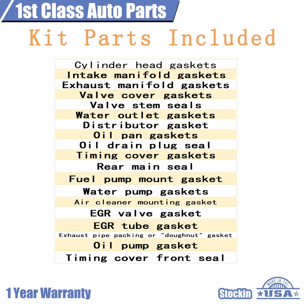Welcome to my Ebay Store ! Store home About us Contact us Feedback STORE HOME ALL NEW ARRIVAL Others STORE CATEGORIES Air Cleaner Filter Air Intake Hose Air Intake Manifold & Parts Alternator Alternator Clutch pulley Ball Joint Battery Cable Belt Tensioner Blower Motor Brake Boost Brake Light Switch Camshaft Camshaft Position Sensor Carburetor Clock Spring Clutch Clutch Slave Cylinder Column Switch Consoles Parts Control Arm Coolant Tank Crankshaft Position Sensor Cylinder Head Stud Kit Dimmer Switch Distributor Door Handle Door Latch Assembly Door Lock Actuator Door Lock Switch Drive Shaft EGR Tube EGR Valve Emission Modules Fan Clutch Fan Control Module Fan Controller Filler door lock actuator Flasher & Hazard Switch Fuel Pressure Regulator Fuel Filter Fuel Injector Fuel Shut Off Solenoid Fuel Tank & Parts Fuel Tank Filler Neck Fuse Box Gaskets Gear Box Stabilizer Bar Glove boxes Harmonic Balancer Headlamp Switch Heater Blend Door Actuator Hinge Hood latch Hood Release Cable Hydraulic Lifter Idle Air Control Valve Ignition Switch Lift Support Mass Air Flow Sensor Mirror Switch Mirrors Motor Mount Oil Cooler Oil Pan Oil pump Oxygen Sensor Parking Brake Cable Power Steering Pressure Hose Power Steering Pump Radiator Cooling Fan Roller Rocker Arm Shock Spare Tire Carrier Speaker Sender Suspension Kit Sway Bar Temperature Vent Door Actuator Thermostat Thermostat Housing Throttle Body Tie Rod End Timing Chain Kit Timing Components Trans Oil Cooler Transfer Case Linkage Transfer Case Shift Motor Transmission oil pan Valve Lifters Variable Valve Timing Solenoid Water Pump Wheel Hub Window Regulator Window Switch Windshield Washer Pump Full Engine Gasket Set For Ford Bronco LTD E-100 F-100 150 260 289 Lincoln V8 click thumbnails above to enlarge DESCRIPTION Product description Fits Vehicles: For 1963-1982 Ford 260 289 302 For Ford 302 Full Gasket Set Fits Ford 302 V8 2 Piece Rear Seal 1968 - 1982 P/n F302-4 Quality: Unless noted otherwise, these are new aftermarket parts. They are manufactured to align with Original Equipment (OE) specifications and act as a direct replacement for the factory part, not as an upgrade or improvement. They will fit and function as the original factory part did. OE Number: 260-1125,ks2328,F302-4 Kit Parts Included : Cylinder head gaskets Intake manifold gaskets Exhaust manifold gaskets Valve cover gaskets Valve stem seals Water outlet gaskets Distributor gasket Oil pan gaskets Oil drain plug seal Timing cover gaskets Rear main seal Fuel pump mount gasket Water pump gaskets Air cleaner mounting gasket EGR valve gasket EGR tube gasket Exhaust pipe packing or "doughnut" gasket Oil pump gasket Timing cover front seal WARNING WARNING: Cancer and Reproductive Harm - www.P65Warnings.ca.gov. PAYMENT DELIVERY DETAILS TERMS OF SALES ABOUT US CONTACT US payment WE ACCEPT PAYPAL PAYMENTS ONLY You can link your Visa, Mastercard, Discover or American Express card to your paypal account and use it to pay what you want,make it quick and safe! Warm reminder: If the package you received is damaged during transportation, please provide three or more photos. After being certified by our after-sales department and claiming compensation from the logistics provider, we will agree to your full refund . DELIVERY DETAILS FREE SHIPPING IN THE LOWER 48 STATES Monday-Friday(excluding weekend and holidays)tracking number will be provided once items are shipped. Overnight or expedited shipping available upon request. Free local pick-up. Please contact us through eBay messaging or call us to schedule your local pickup Warm reminder: If the package you received is damaged during transportation, please provide three or more photos. After being certified by our after-sales department and claiming compensation from the logistics provider, we will agree to your full refund . TERMS OF SALES 1 YEAR PARTS WARRANTY No reimbursements will be given for delay,labor,mileage,or any other cost involved in installation or re-installation of the auto parts in question. Customer is responsible for shipping parts back for inspection and replacement. We provide part numbers and high resolution pictures.Please check part numbers and pictures for compatibility. Warm reminder: If the package you received is damaged during transportation, please provide three or more photos. After being certified by our after-sales department and claiming compensation from the logistics provider, we will agree to your full refund . ABOUT US OE QUALITY AND COMPETITIVE PRICE Many of the products we buy come from the OEM manufacturer. Where necessary we make improvements to the original design to correct issues with the original part. All of our products undergo rigorous testing to assure they meet or often exceed OEM quality. All of our parts, be it suspension parts, electrical parts, engine parts, body panels, drivetrain parts are ISO/TS16949 certified by quality manufactures from all across the globe. We have a 100% satisfaction goal.If you have had less than 100% positive experience,please contact us so we can work out a resolution. Warm reminder: If the package you received is damaged during transportation, please provide three or more photos. After being certified by our after-sales department and claiming compensation from the logistics provider, we will agree to your full refund . CONTACT US FEEL FREE TO CONTACT US If there is an issue with shipping or the item you purchased please contact us via ebay message or call us before opening a case or leaving feedback.We will try our best to resolve any kind of issue. Call our hotline with any questions Monday-Friday 8am-5pm(MST) Warm reminder: If the package you received is damaged during transportation, please provide three or more photos. After being certified by our after-sales department and claiming compensation from the logistics provider, we will agree to your full refund . uesfullinks About us Contact us Add to FAVS Feedback Store home contactinfo Our hours of operation are: Mon