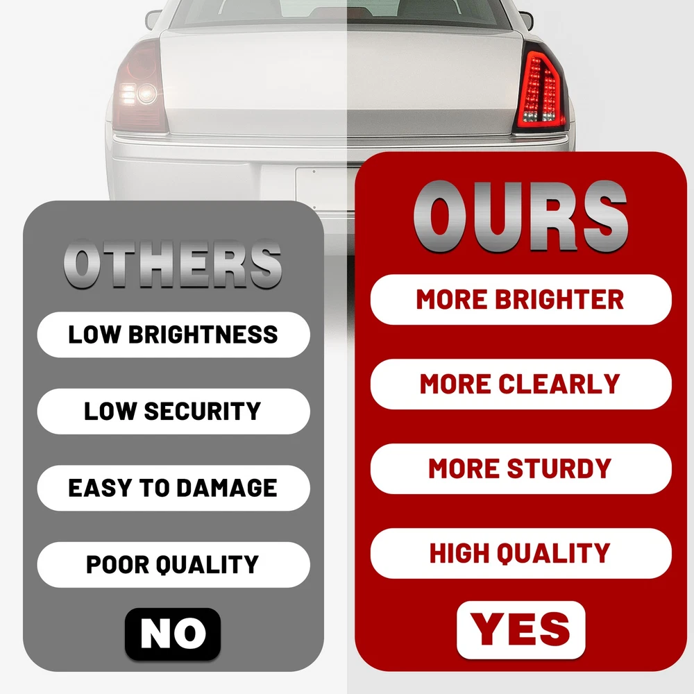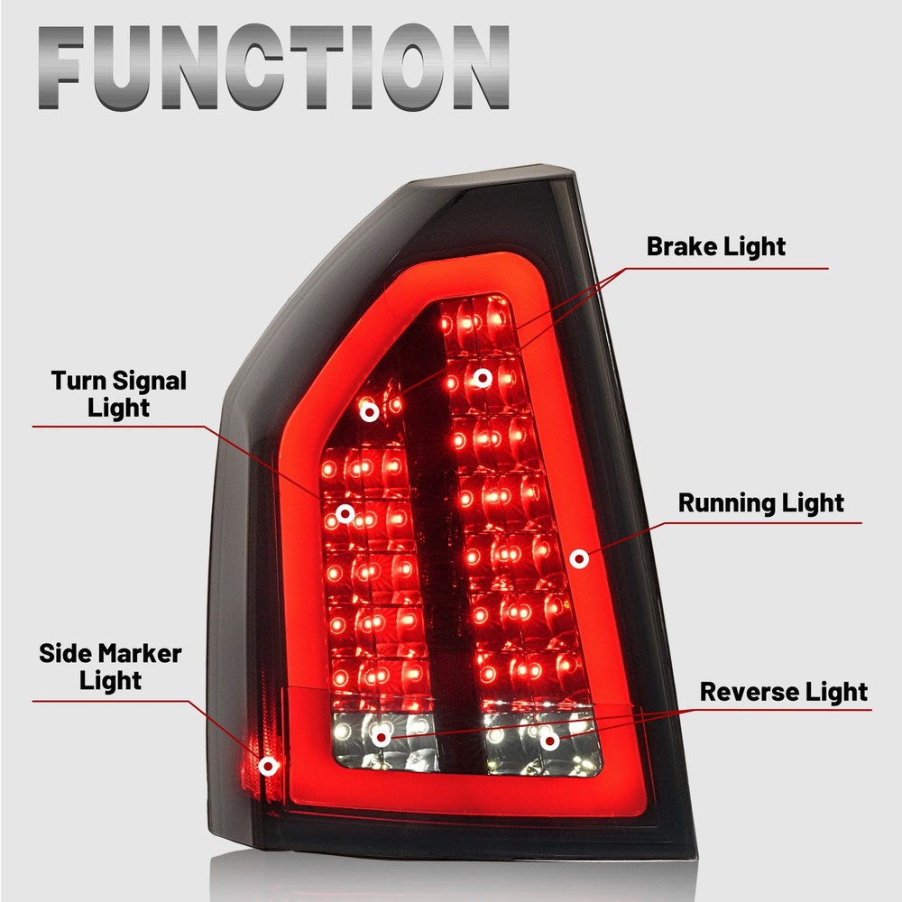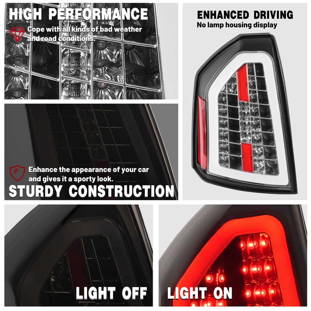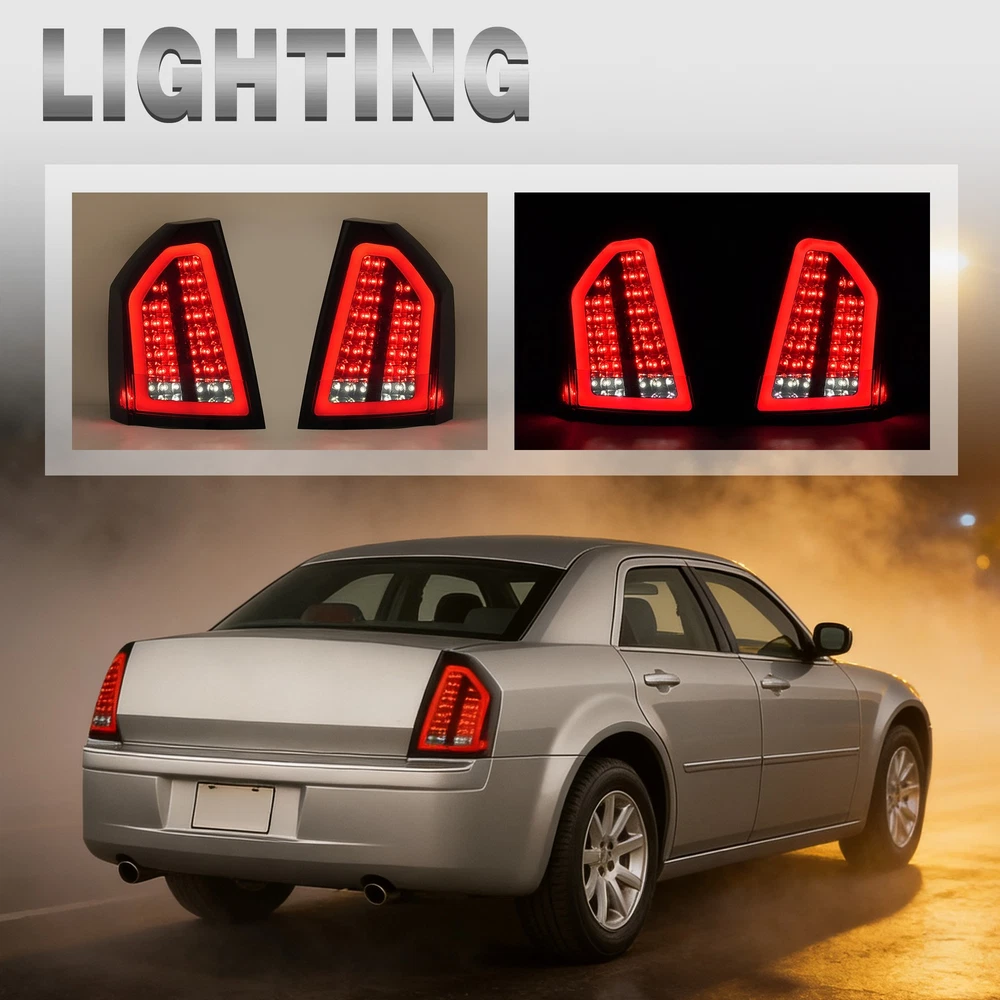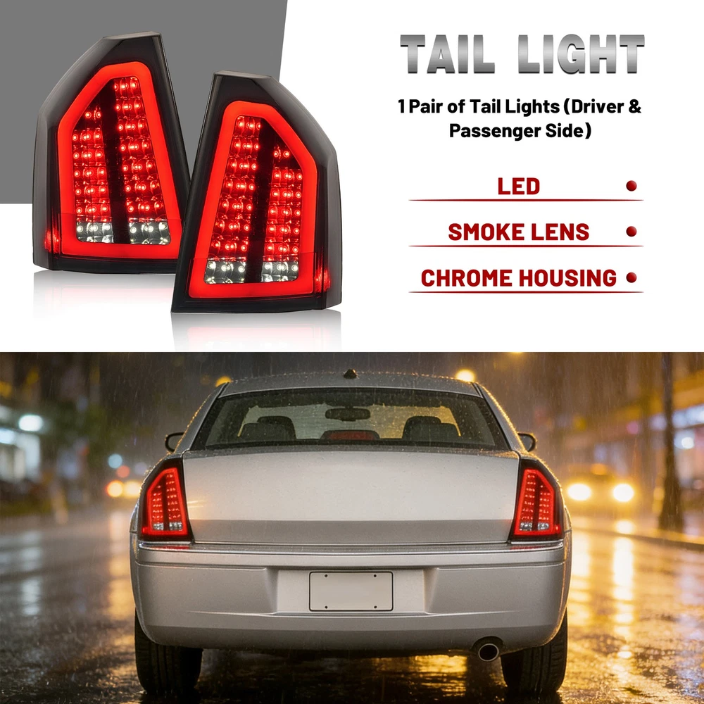 Headlight Assemblies Tail Light Assemblies Fog Light Assemblies Turn Signal Light Assemblies Side Marker Light Assemblies Park & Combination Light Assem Light Bulbs & LEDs Other Type Light Other Product Display Product Description Full LED Smoke Lens Tail Light Brake Lamp For Chrysler 300C 2008-2010 FIT FOR: For Chrysler 300C 2008-2010 Product Specifics: Type:Tail Light Lighting Technology: LED Lens Color:Smoke Lens Housing Color:Chrome Housing Light Color:Red & White Items Included:Structural and Functional Guidelines Placement on Vehicle:Front,Left,Right Installation Method:Screw-On Features:DOT-Certified Material:Plastic Structural and Functional Guidelines Included: Yes Replaces Part Number:Replace for 4806381AC,4806380AC,CH2818118,CH2819118 Features: Clear Vision: The high-density taillight assembly has tightly sealed edges to help protect against water and dust. High-quality materials: High-strength plastic structure to extend the life of the taillight assembly. Can withstand outdoor severe cold, rain and snow. Safe Driving: When you drive at night or in other bad weather, this taillight provides a longer light range. When you step on the brakes, it can give the driver behind enough reaction time to avoid accidents. Easy to Install: Professional user-friendly design, it can be installed on your car quickly, absolutely no delay! Taillights are sold in pairs, including driver and passenger sides. Carefully designed to perfectly match your vehicle. Package Includes: 2 X Tail Light(Left & Right Side) Structural and Functional Guidelines are Included Shipping: All items will be shipped out in 1 business day, no expedited service available. We ship our items to USA only(Does NOT include Hawaii, Alaska or Puerto Rico, PO Boxes/APO's). Shipping Notes: We use multiple warehouses and will select the nearest warehouse for delivery according to your order address and our inventory, Thank you for your cooperation. Contact us: Any Questions, Just feel free to contact us on eBay. We will reply you in 24 hours. Brand Story Autolighting—Guiding with Light, Protecting with Craftsmanship. In an era where machinery and technology intertwine, reliability and innovation are the cornerstones of progress. Autolighting was born from a pursuit of unparalleled quality—we are not just a manufacturer of car lights, but also a guardian of safety and convenience. We pay attention to every detail of daily driving. With professionalism and craftsmanship, Autolighting provides solid protection for every journey. On Dec 25, 2025 at 00:44:38 PST, seller added the following information: On Dec 30, 2025 at 00:19:08 PST, seller added the following information: