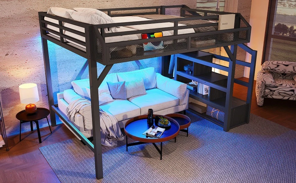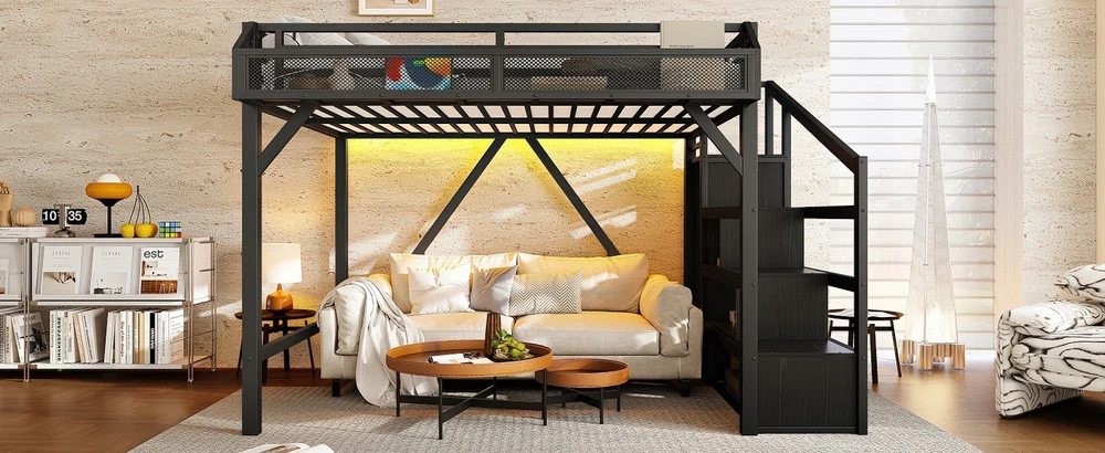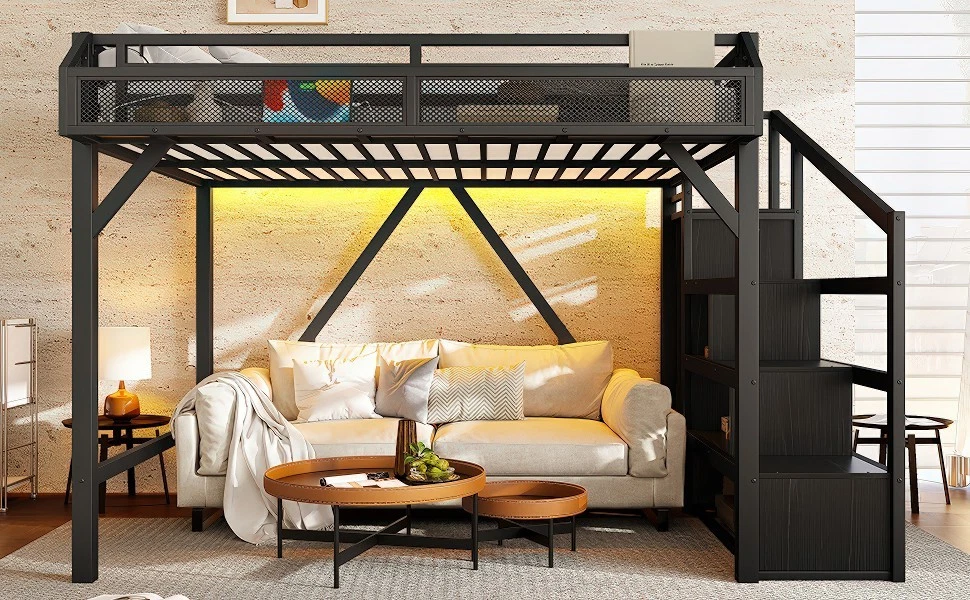 Full Loft Bed Metal Loft Bed Frame w/ Storage Stair,Shelves & Wardrobe Black Features 【Maximized Storage with Built-in Wardrobe & Shelves】This full loft bed with storage is designed for organization and function. It includes a built-in wardrobe, open shelving, and storage stairs — perfect for storing clothes, books, toys, or essentials while saving space in your bedroom. 【Convenient USB Ports & LED Light Strip Included】More than just a bed — this metal loft bed features built-in USB ports and LED lighting, making it ideal for late-night reading, studying, or charging devices without leaving your bed. A great choice for teens, students, or dorm living. 【Safe Climb Design with Full-Length Guardrails】Stay secure with full-length guardrails on the top bunk and sturdy stairs that double as storage. This loft bed with stairs offers both safe access and added functionality, giving you peace of mind for older kids or young adults. 【Sturdy Metal Frame with Noise-Reducing Structure】Crafted with a heavy-duty metal frame, this full loft bed is reinforced with premium hardware for durability and stability. Special noise-reducing connectors help minimize squeaking, offering a smoother, quieter sleeping experience. 【Easy Assembly with Complete Kit Included】This space-saving loft bed includes all necessary tools and a detailed illustrated manual for hassle-free setup. Whether you’re a DIY beginner or experienced, you can assemble it confidently and quickly without professional help. Descriptions Description Upgrade your bedroom with this all-in-one Full Loft Bed with Storage and Built-in Features, designed to maximize space while offering convenience, safety, and style. Ideal for teens, students, or anyone in need of vertical storage, this space-saving loft bed turns your sleeping area into a multifunctional living solution. Built with a durable metal frame, this loft bed features a smart layout that includes storage stairs, open shelves, and a built-in wardrobe — perfect for organizing clothes, books, toys, and essentials without taking up extra room. It’s a complete storage solution built right into your bed. Designed for modern living, the bed comes equipped with USB charging ports and LED strip lighting, making it easy to charge your devices or read at night without needing extra furniture or cords. Convenience and style come together in one streamlined setup. Weight & Dimensions Product Type Metal Loft Bed Color Black Woodgrain Size Full Material Metal+MDF Overall Product Dimension 90.94”L*56.7’’W*63.4”H Overall Product Weight 153.22 LBS Weight Capacity 350LBS Recommend Mattress Thickness 6'' Number of Package 2 Package Dimension & Weight Please refer to the Specification Level of Assembly Full Assembly Needed Eligible for Hardware Packs Yes Country of Origin China Note All the pictures are taken by actual samples, slight chromatic aberration may occur due to lighting or display.