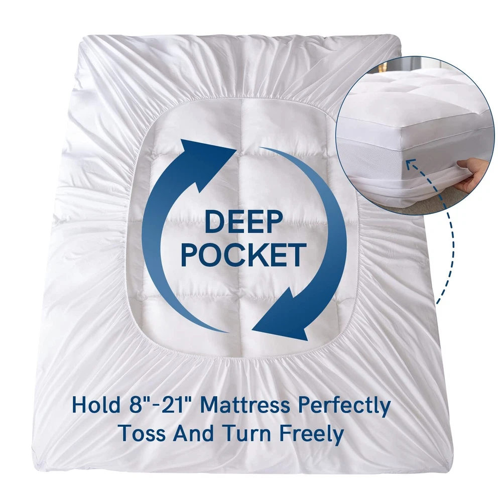 【PREMIUM MATERIAL&SOFT FILLING】Tightly woven and thin brushed microfiber fabric is exceptionally soft, breathable and comfortable. It's also durable, no risk being ripped even with frequently washing. Compared with traditional mattress topper, it's double filled with 3D snow down alternative filling, enough soft, plush and warm. Materials are clean, helps diminish the negative outcomes of a person who has sensetive skin. 【ULTRA THICK&MAXI COMFORT】With overfilled down alternative filling, mattress topper is extra thick and supportive, offering pressure-relief properties that provide greater support for your hips, shoulders, back, and knees. Down alternative filling retains less body heat than memory foam, causing less uncomfortably warm or hot during the night. This mattress pad can improve your quality of sleep and leave you feeling well rested when morning comes. 【DEEP POCKET&BOX SEWING PATTERN】8"-21" elastic deep pocket will wrap your mattress perfectly so the pillow top will stay in place and you can toss and turn freely during the sleepy nights. Unique box sewing pattern leaves box pockets to hold the filling and keep it evenly distributed. The morden stylish designed bed skirt and sewing pattern add more appealing visual aesthetic to your bedroom. 【MACHINE WASHABLE&EASY CARE】Unlike expensive mattresses, this thick mattress pad can be washed in a large machine with cold water, mild detergent and gentle cycle. It remains fluffy after drying on low heat, saving you time and energy. Available Sizes: Twin 39"x75"/Twin XL 39"x80"/Full 54"x75"/Full XL 54"x80"/Short Queen 60"x75"/Queen 60"x80"/Super Queen 66"*80"/RV King 72"*80"/King 78"x80"/Cal King 72"x84" 【100% CUSTOMER SATISFACTION】aims to provide satisfying pre-sales and after-sales service. service team will always offer immediate answers to customers and fix relevant issues. Here what you'll get is not only superious products but excellent service. Purchase one as gift for yourself or your beloved. All of you are deserve the super comfortable mattress topper.