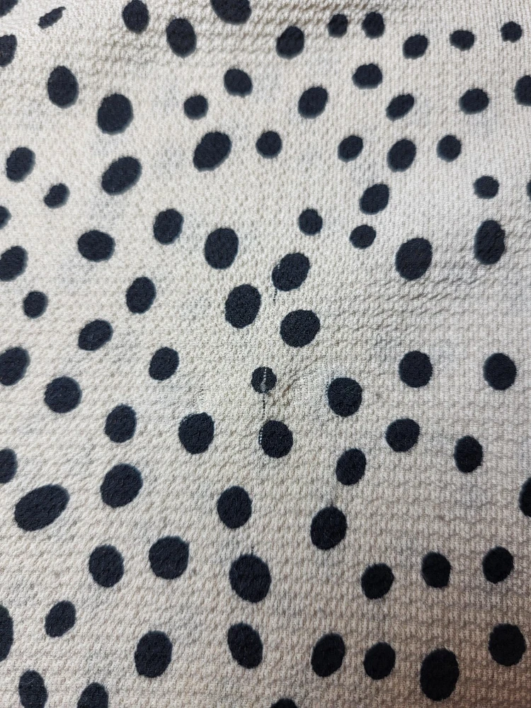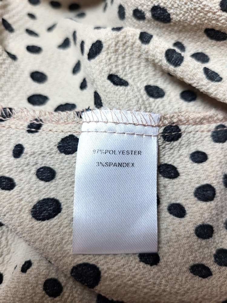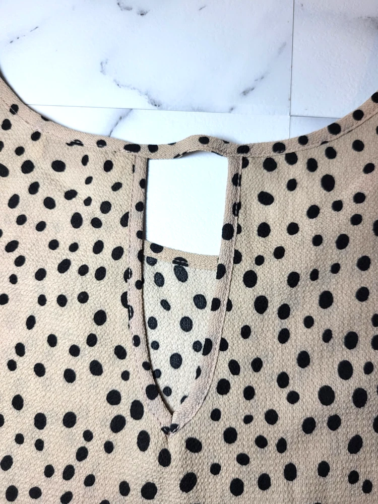 Full Moon Maternity Tan And Black Textured Polka Dot Tunic With Flutter Cap Sleeves, A Keyhole Back And Ties At The Waist. The Tie Is Not Attached To The Tunic. Size Small Measurements: Sleeve Length 3 1/2" Armpit to Armpit 19" Length 28"