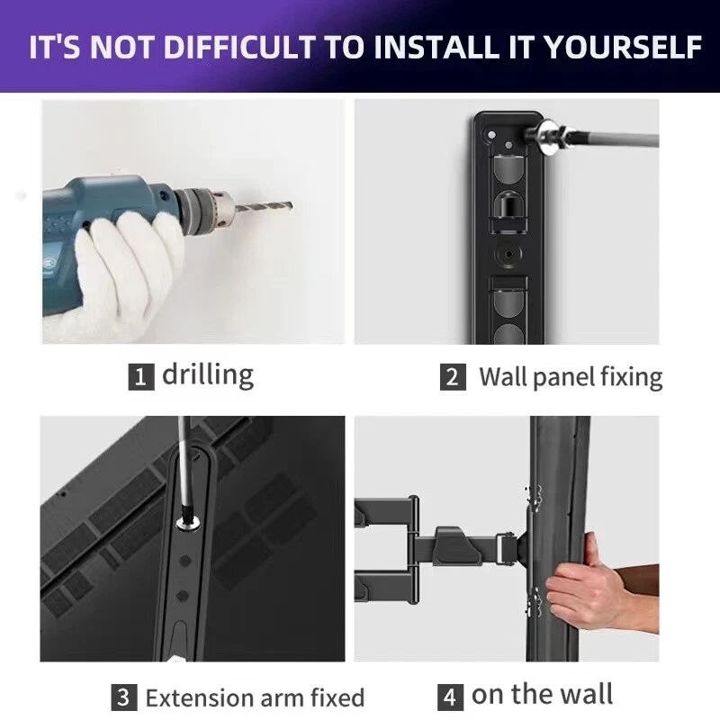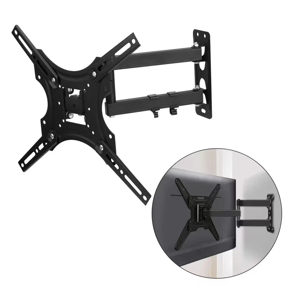 Specifications: Type: Full Motion TV Wall Mount Bracket Color: Black Material: Cold-rolled Steel Suitable TV Sizes: 32"-55" Load Capacity: 44kgs Adjustable: Tilt (-15 degrees, +5 degrees) | Swivel (-90 degrees, +90 degrees) Max VESA Mounting Pattern: 200 x 200 mm Use for: TV, Monitor, Projector, LCD, LED, OLED, Plasma Features: • This heavy duty TV stand has high standards and can fix the screen up to 44 inches, the largest. • Compatible with VESA • Mounting hole Pattern (200mm x 200mm) • Tilt 180°: the VESA board can be removed for easy Installation of one person. • Reliable Quality: This heavy-duty bracket, made from premium cold-rolled steel, means your TV will stay sturdy and stable. It's designed for flatscreens TV's and can carry a load of up to 44kgs. You can be confident that your TV won't run into any "whoopsies" while viewing. Just install the bracket on the wall, mount your TV, and choose a corner to enjoy it. It's that easy! • Full Motion for Optimal Viewing: Full motion Mount your TV on this bracket to watch your favorite movie at the most comfortable angle. With a 180° left to right range of motion and upward and downward tilt of +5~-15°, this TV mount puts your screen at the perfect position for you or anyone to enjoy. • Save Space: This TV wall bracket has an adjustable wall space from 400mm. Planning to have company over for the evening? Simply retract the moveable arms to place into a fixed position to save space for your guests. • Easy Installation: Step-by-step instructions and all the necessary hardware is provided, single stud installation simplifies the placement of the TV/monitor on the wall. Removable TV plate designed for single-person installation which helps you to install this TV wall mount without any hassle Will this mount fit your TV? 1. Check the VESA of your TV whether it is under 200mm x 200mm; 2. Check the weight of your TV whether it is lighter than 44kgs; 3. Check whether your TV is within 32" to 55"; Available VESA range: • 200mm x 200mm (8"x8") Package Included: • 1 x Full Motion TV Mount Bracket • 1 x Assembly Manual • 1 x Complete Set of Screws and Other Fittings Required for Assembly