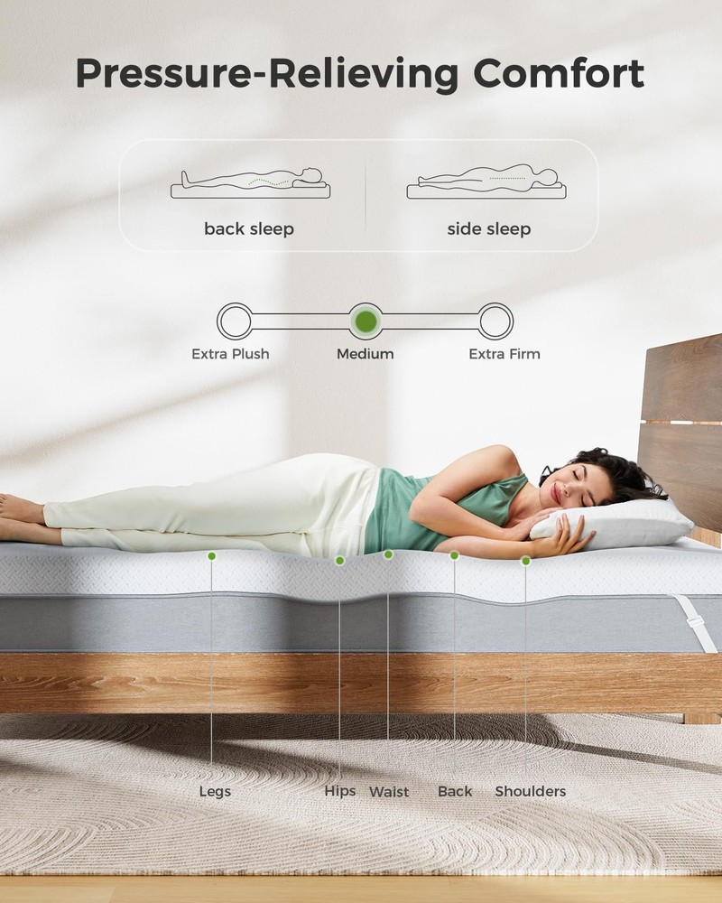 Introducing the full size mattress topper, combining comfort, durability and removability for easy quality sleep. Pressure Relief: The memory foam mattress topper is made from 100% pure memory foam, offering a perfect balance of softness and support. It keep you relaxed all night long. CertiPUR-US & Oeko-Tex Certified: The 3 Inch mattress topper full size is rigorously tested to meet CertiPUR-US and OEKO-TEX standards for content, emissions, and durability. Bamboo Fiber Cover:The bed topper full is crafted from skin-friendly and breathable bamboo fiber, providing enhanced comfort and improved airflow for a better night's sleep. Prolong Your Mattress Life: The cooling mattress topper is a smart, budget-friendly way to boost the comfort of your current bed without the need for an expensive replacement. Easy to Carry & Unroll: The full size foam mattress topper is versatile and perfect for various spaces and occasions, such as dorms, tents, RVs, and living room sleepovers. Comfortable Sleep: full size memory foam mattress topper provides a perfect balance of softness and support, which can help you relieve pressure. The 3 inch cooling gel mattress topper uses ventilation holes design and breathable mesh to accelerate air flow and heat exchange, allowing you to experience a relaxed and cool sleep all night Professional Certification: The Mattress Pad is CertiPUR-US certified to ensure that the memory foam does not contain harmful ingredients. The bed topper full is made of skin-friendly and breathable bamboo fiber material, and the fabric has passed the OEKO-TEX certification to ensure that it is skin-friendly Firm and Non-slip: This 3 inch foam mattress topper bottom is designed with non-slip silicone points and is equipped with four fixing straps to ensure that the mattress topper fits firmly with the gel mattress topper and stays in place for a long time, reducing the trouble of frequently adjusting the mattress position Machine Washable: The bottom of the full size bed topper is equipped with a zipper, which you can remove and wash at any time, while improving the comfort of the Mattress Pad, effectively extending the life of the mattress to compensate for the defects of the sleeping surface caused by the long-term use of the full topper for mattress ide range of uses: The bed mattress topper is suitable for various spaces and occasions, such as dorms, tents, RVs and living rooms for overnight stays. Tip: It arrives compressed, so place the bed foam topper in a well-ventilated area and wait for it to fully expand within 24-48 hours (maybe longer in colder conditions) before using it