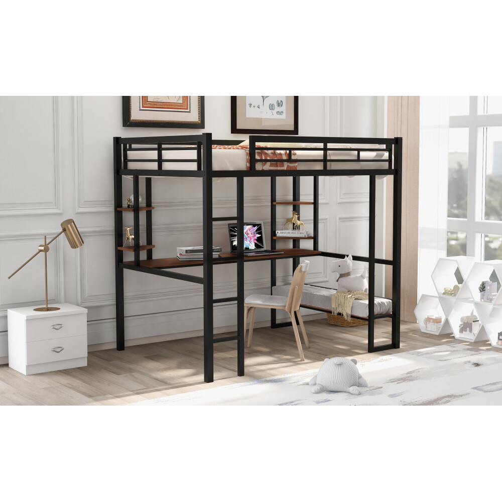 Made of heavy duty steel and high- quality MDF, the bed provides great support. Featuring desk and shelves under bed, this bed creates a personal workstation. Coming with full-length guardrail and built-in ladder that is of great stability, you can enjoy your bedtime with peace in mind. Assembly required Full Size Loft Metal&MDF Bed with Long Desk and Shelves,Black This loft bed features long desk under bed and 2-tier shelves on each corner which creates a personal workstation, making full use of space. The desk and shelves are made of thickened MDF board which provides better weight capacity. Slats are available for top bed, recommended 6'' mattress. Full-length guardrail guarantees safety for user and a built-in ladder offers easy access to top bed. With humanized design and solid construction, this bed will be the best addition to your bed. Description Material Metal+MDF Size Full Color Black Function Loft bed Decoration With desk and shelves Numbers of package 2 Spring box No need Assembly required Yes Dimensions Overall Product Dimension 78''x56.3''x71.6'' Loft Bed Dimension 78''x56.3'' Desk 15''x 75.6'' Total height 71.6'' Number of Slats 21pcs Overall Product Weight 120lb Bed weight capability 250lb Bed recommended mattress thickness 6''