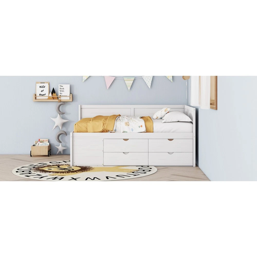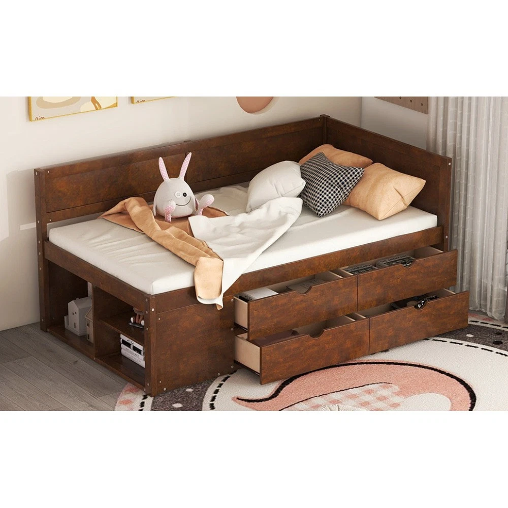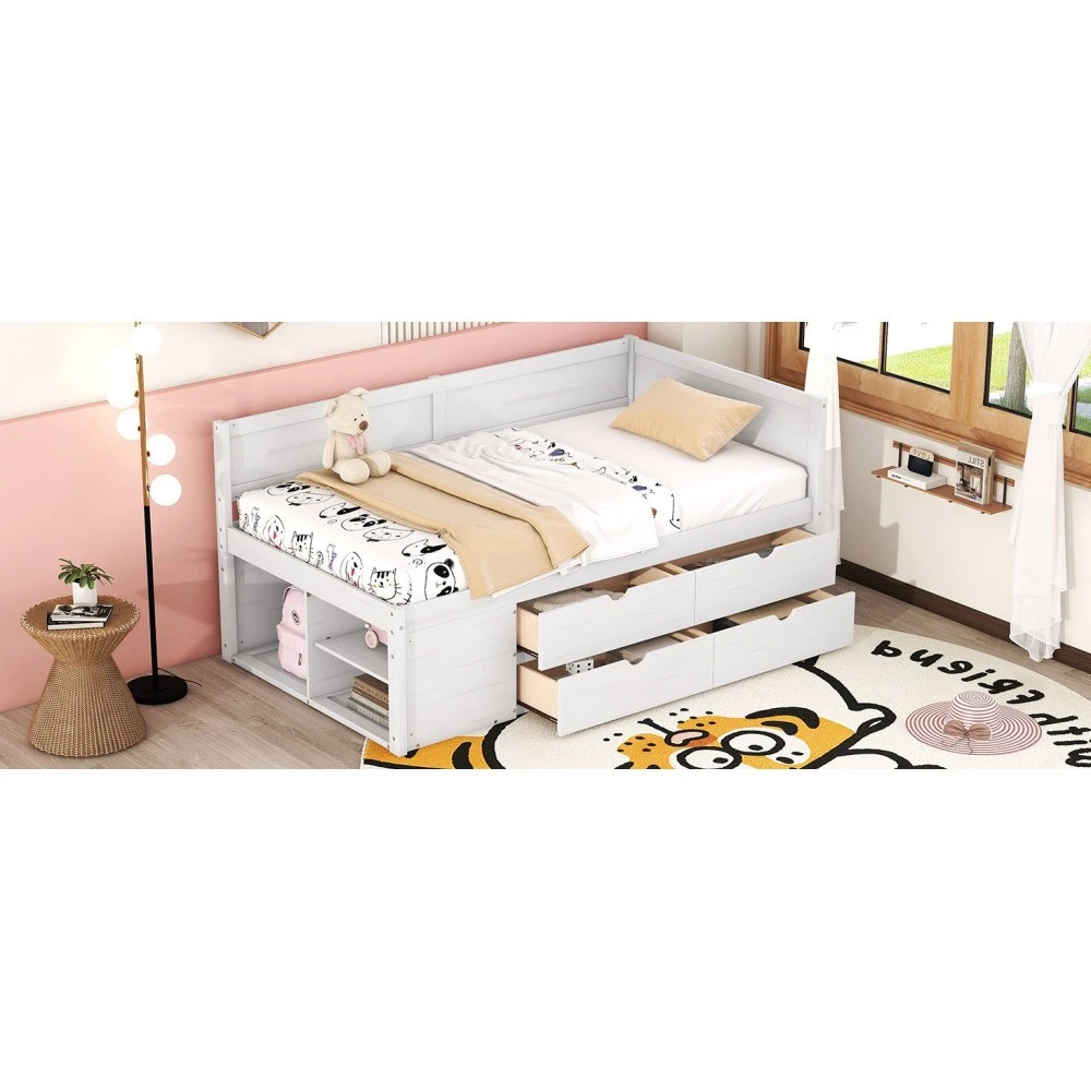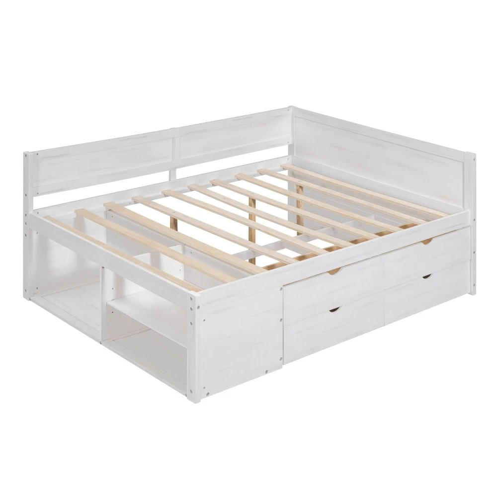 [Maximized space] The daybed with handy pull-out drawers and three functioning shelves takes up minimal space, perfect for organizing anything from clothes and bed linens to toys and games. Such a versatile piece, bringing functionality, versatility, and style to your home, perfect for those who have limited space. [Elegant design] This daybed with handy pull-out drawers is designed with a clean silhouette and a hue of elegance. It gives any room a spark of style that's both modern and timeless. [Solid Construction] The bed structure is crafted from high-quality and a strong, durable frame so that the bed is sturdy and durable. The simple yet elegant wood frame is sturdy and comes with wood slats for extra support and ensures air moves freely around your mattress to keep it fresh for years to come. [Health and Comfort] No box spring required, and without needing a foundation. Built-in smoothly sliders , easy for you to pull out of the drawers. [Dimensions] Overall Product Dimension: 77.8"L x 57.6"W x 34.3"H. Mattress not included. Some assembly is required, although we have provided clear instructions and tools. The daybed with handy pull-out drawers and three functioning shelves takes up minimal space, perfect for organizing anything from clothes and bed linens to toys and games. Such a versatile piece, bringing functionality, versatility, and style to your home, perfect for those who have limited space. High-quality, solid and a strong, durable frame ensures stability and durability for long-term use. Slat kit included so box springs are not required. This daybed is designed with a clean silhouette and a hue of elegance. It suits all styles of home decoration, and completes the look of any bedroom. Weight & Dimensions Overall Product Dimension 77.8"L x 57.6"W x 34.3"H Detail Product Dimension Please refer to the Size image Number of Package 2 Package Dimension Please refer to the Specification Overall Product Weight 145.63LBS Package Weight Please refer to the Specification Weight Capacity 350LBS Recommended Mattress Thickness 6" Specifications: Product Type Daybed Size Full Color White/Gray/Walnut Material Plywood+MDF+Pinewood Box Spring Required No Number of Slats 10 Assembly Required Yes Country of Origin Vietnam Notes: Manual measurement has been used,there may be some reasonable error. All the pictures are taken by actual samples, slight chromatic aberration may occur due to lighting or display.