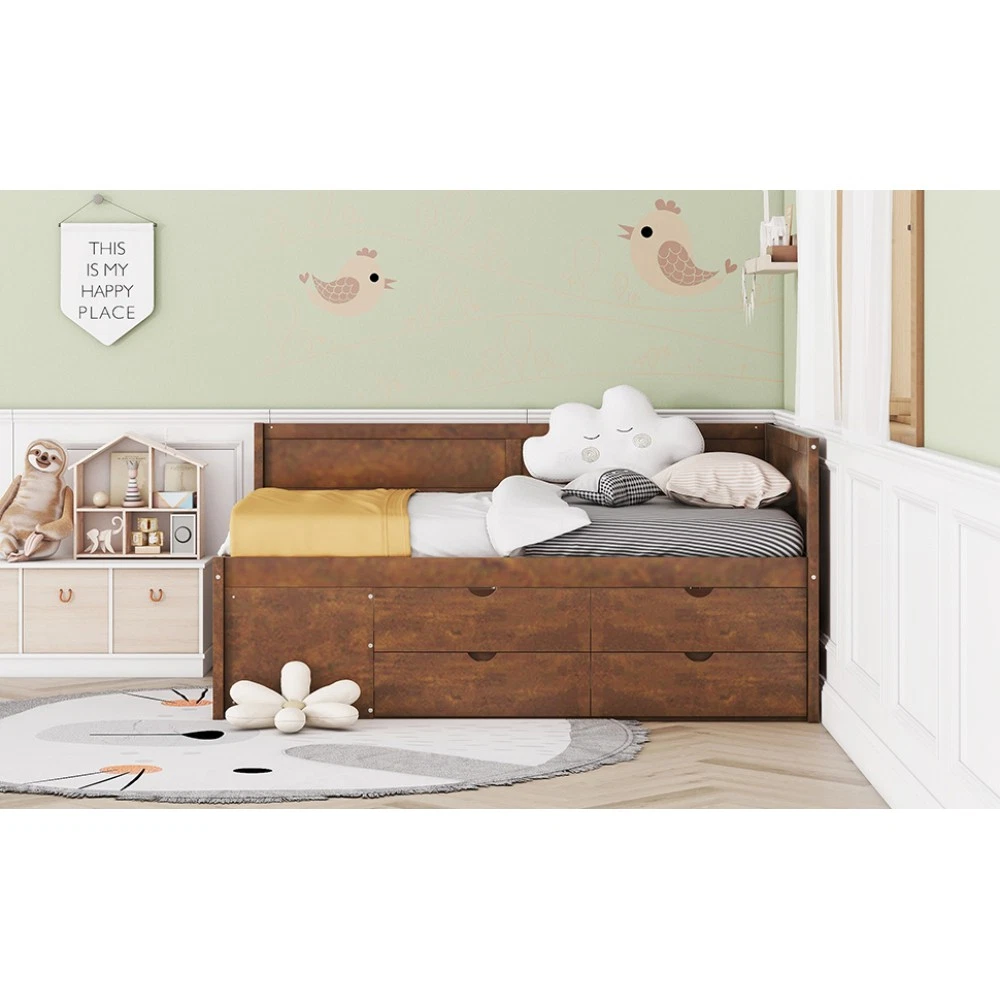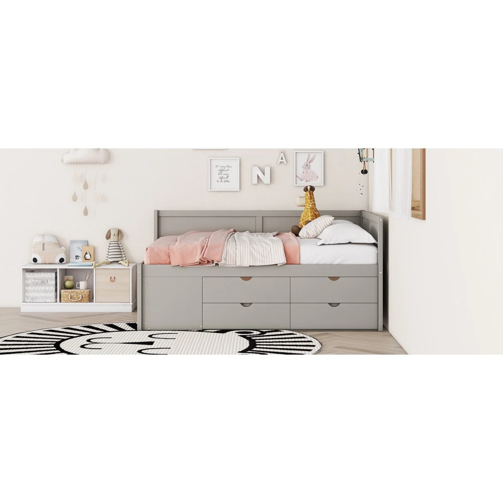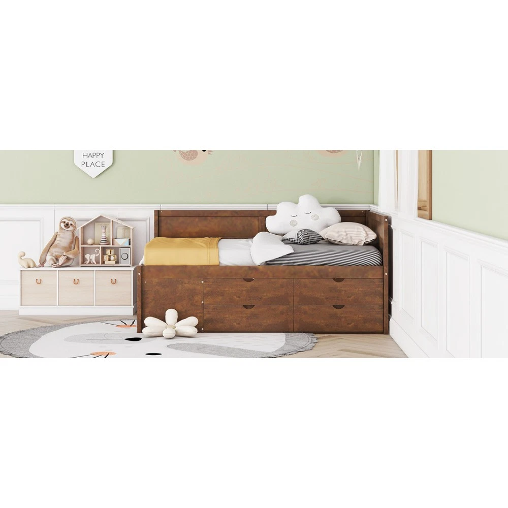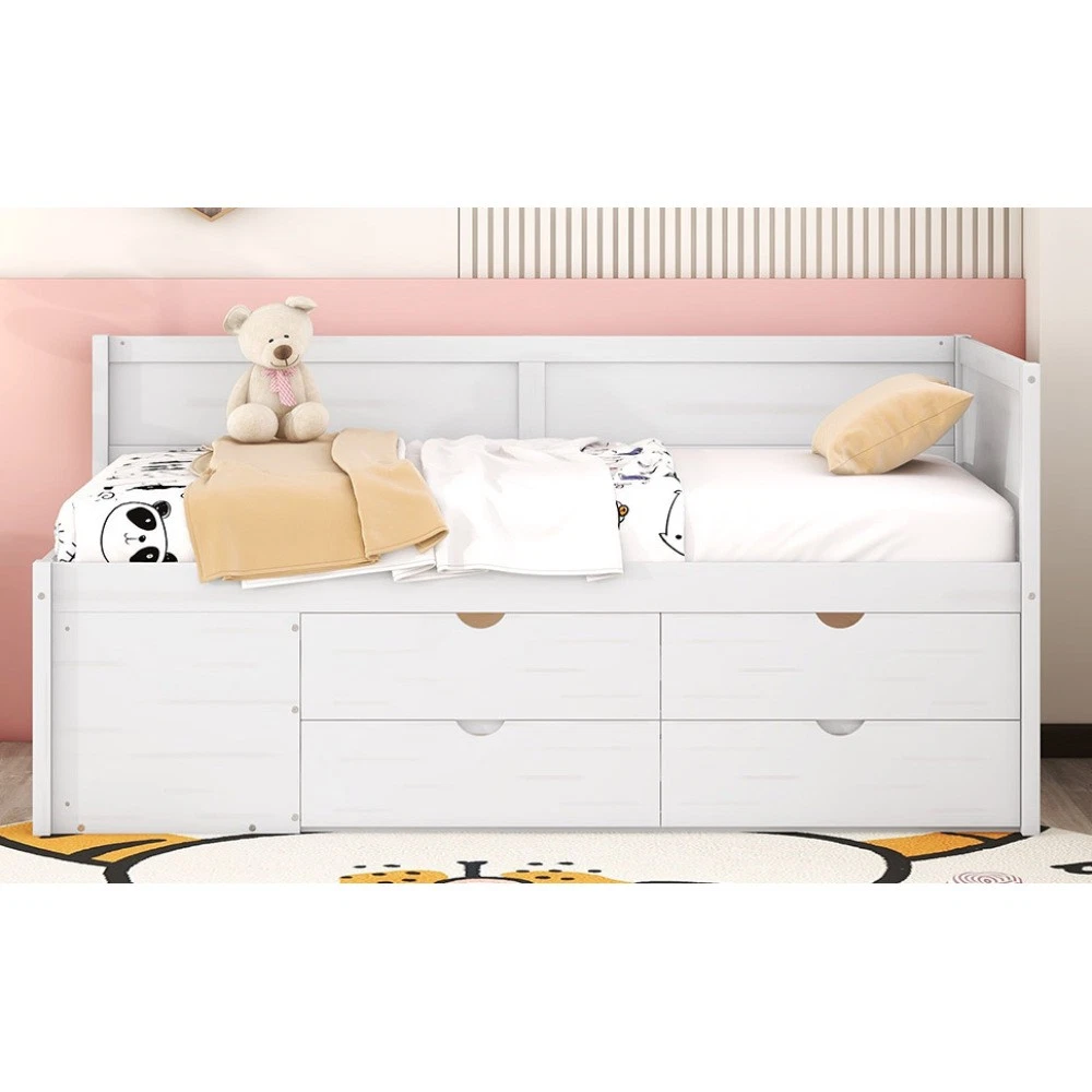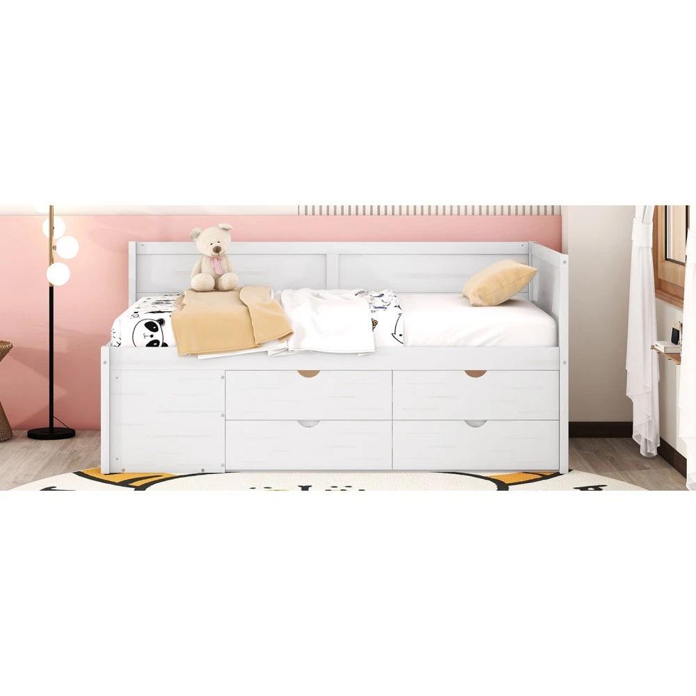 [Maximized space] The daybed with handy pull-out drawers and three functioning shelves takes up minimal space, perfect for organizing anything from clothes and bed linens to toys and games. Such a versatile piece, bringing functionality, versatility, and style to your home, perfect for those who have limited space. [Elegant design] This daybed with handy pull-out drawers is designed with a clean silhouette and a hue of elegance. It gives any room a spark of style that's both modern and timeless. [Solid Construction] The bed structure is crafted from high-quality and a strong, durable frame so that the bed is sturdy and durable. The simple yet elegant wood frame is sturdy and comes with wood slats for extra support and ensures air moves freely around your mattress to keep it fresh for years to come. [Health and Comfort] No box spring required, and without needing a foundation. Built-in smoothly sliders , easy for you to pull out of the drawers. [Dimensions] Overall Product Dimension: 77.8"L x 57.6"W x 34.3"H. Mattress not included. Some assembly is required, although we have provided clear instructions and tools. The daybed with handy pull-out drawers and three functioning shelves takes up minimal space, perfect for organizing anything from clothes and bed linens to toys and games. Such a versatile piece, bringing functionality, versatility, and style to your home, perfect for those who have limited space. High-quality, solid and a strong, durable frame ensures stability and durability for long-term use. Slat kit included so box springs are not required. This daybed is designed with a clean silhouette and a hue of elegance. It suits all styles of home decoration, and completes the look of any bedroom. Weight & Dimensions Overall Product Dimension 77.8"L x 57.6"W x 34.3"H Detail Product Dimension Please refer to the Size image Number of Package 2 Package Dimension Please refer to the Specification Overall Product Weight 145.63LBS Package Weight Please refer to the Specification Weight Capacity 350LBS Recommended Mattress Thickness 6" Specifications: Product Type Daybed Size Full Color White/Gray/Walnut Material Plywood+MDF+Pinewood Box Spring Required No Number of Slats 10 Assembly Required Yes Country of Origin Vietnam Notes: Manual measurement has been used,there may be some reasonable error. All the pictures are taken by actual samples, slight chromatic aberration may occur due to lighting or display.