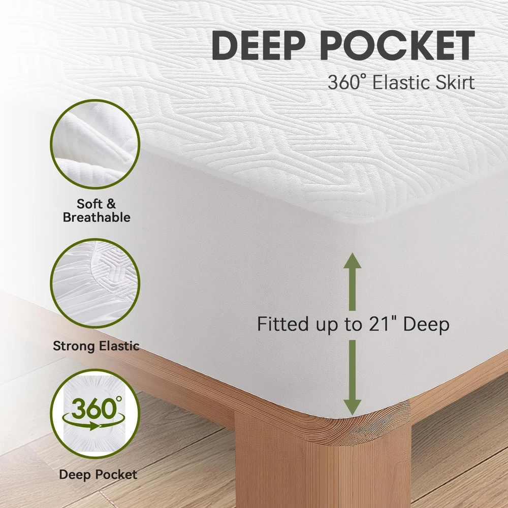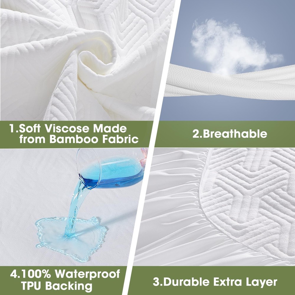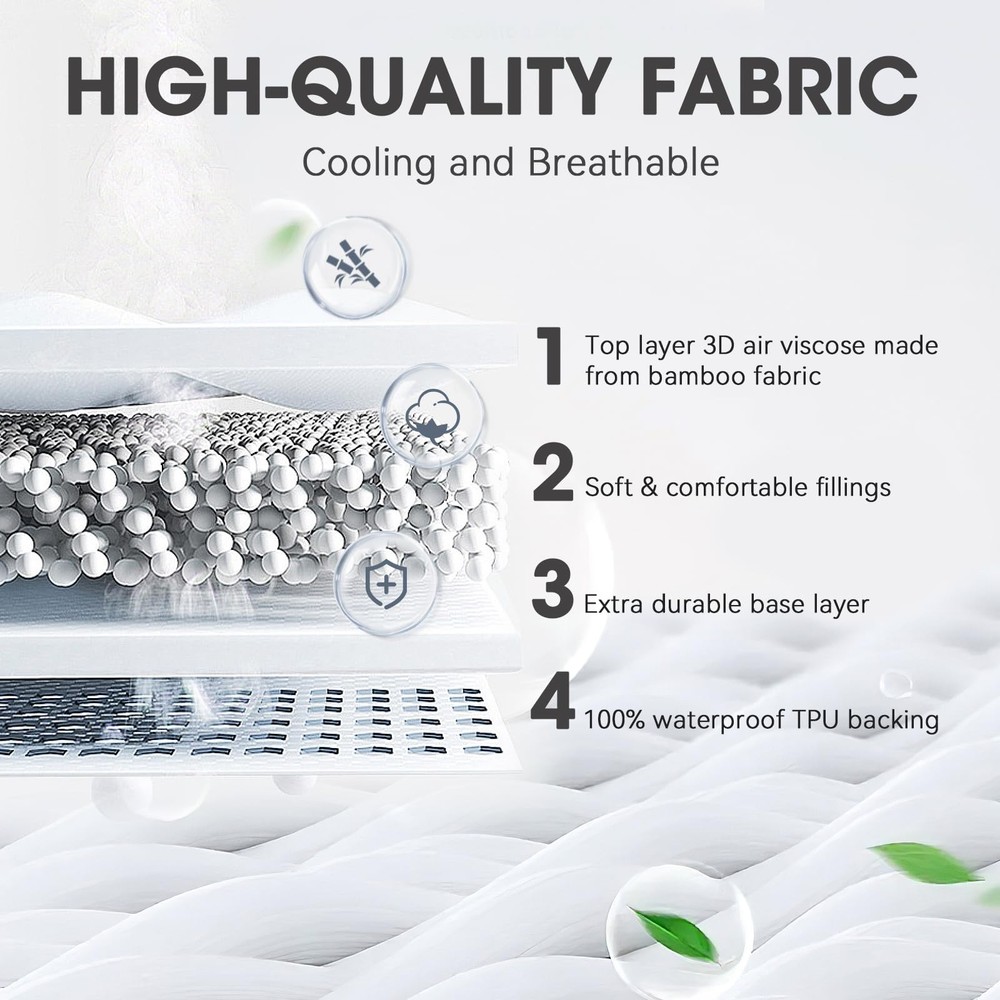 Full Size Waterproof Mattress Protector - White Cooling Bamboo-viscose Mattress Pad Cover, Breathable Soft 3D Air Fabric, Noiseless Washable Fitted Sheet with Deep Pocket Up to 21" π OEKO-TEX Certified Noiseless Bed Sheets - mattress pad with channel weave technology. Bamboo-Viscose surface reduce friction noise - Enjoying silent movement and luxurious softness against your skin π 100% Water Proof Mattress Protector Cover - TPU membrane blocks liquids (sweat, spills) for 100% mattress protection. Controls temperature to feel cooler in summer and warm & dry in winter - ideal for households with kids/pets π Breathable & Cooling Mattress Protector Pad for Bed - 3D air layer circulates air better than traditional fabrics, wicking away moisture for a dry, cloud-like feel. Soft enough for protect skin, compatible with latex or spring mattresses π 21" Deep Pocket with 360Β° Elastic Skirt - Stretchy skirt fits mattresses 8-21" thick, secured by strong elastic band for zero shifting. Elasticized 360Β° wrap fitted sheets ensures quick, tool-free installation-even for extra-deep beds π Washable Bed Protector Covers - Cold gentle wash, tumble dry low. No bleach or ironing. Buy 2+ for easy rotation β keep your bed fresh and extend mattress life. Multi-size options:Twin/Twin XL/Full/King/California King/Queen Mattress Pad Covers π Matress Cover Suitable for All - works perfectly with memory foam, latex, springs or air mattresses. Ideal for beds, bow up, ar, firm, cribs, car or camping RV mattresses, it's a versatile choice for every room in your home