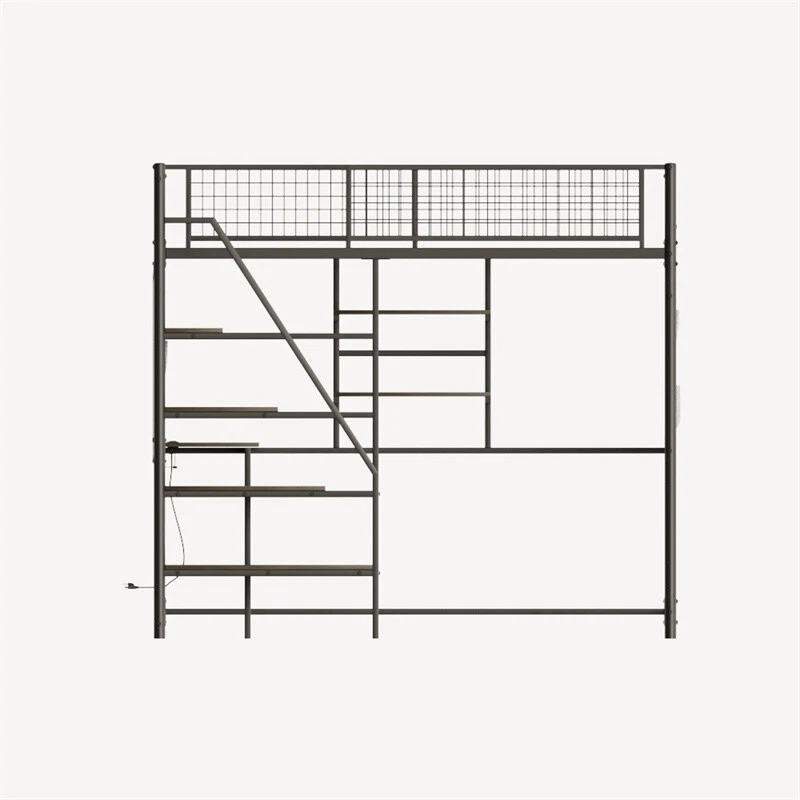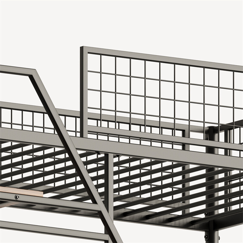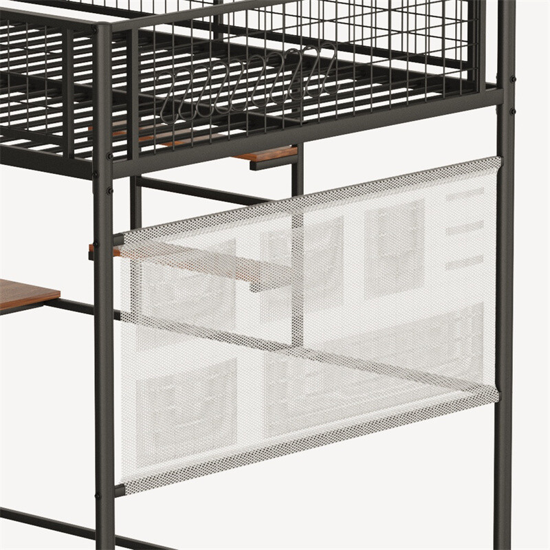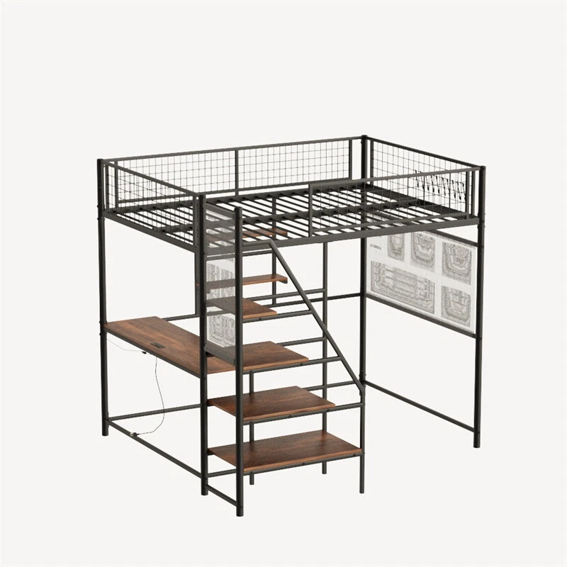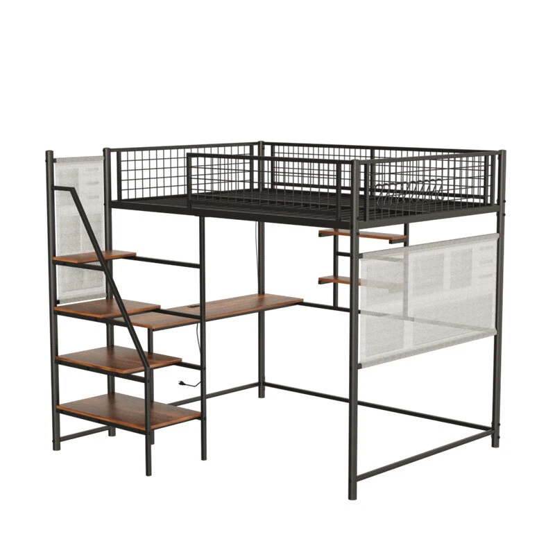 Full Size Metal Loft Bed w/Desk,Storage Stairs,Shelves & LED Light for Dormitory Features 【Loft Bed with Desk】The full size loft bed can be configured as two separate spaces. While satisfying rest, the under the top bunk bed provides more personal space for work or leisure. Built-in desk and a charging station in front of the desk,creates a productive, simple work,study or gaming area for your child. Perfect for space-saving needs. [Multi-functional storage design] It comes with two storable cloth bags to place trivial items. The stairs are lengthened and widened, and objects can also be placed freely. The FULL size also has shelves for you to place your items. Multiple storage functions improve storage efficiency. 【Sturdy and Durable】Adopt a stronger square heavy duty metal frame structure that includes closely packed metal slats. Each component is securely secure with heavy-duty screws and tested to ensure the loft full bed security and stability.No Box Spring is Needed.The maximum bearing capacity can reach 400 pounds. 【Safety Guaranteed】The top bunk is equipped with full-length and heightened guardrails that not only stabilize the structure of the twin bunk bed but more importantly protect your safety. Note:Make sure the top of the mattress is at least 5” from the edge of the guardrail. Recommended mattress 4-6inch.We provide strong Anti-Tipping Nails to securely fasten the bed to the wall for added safety. The full size bed leg's wear-resistant foot pads, prevent any unwanted sliding and eliminate noise. 【LED Lights】Full size loft bed frame with vibrant LED lights. Create your favorite bedroom atmosphere. Description