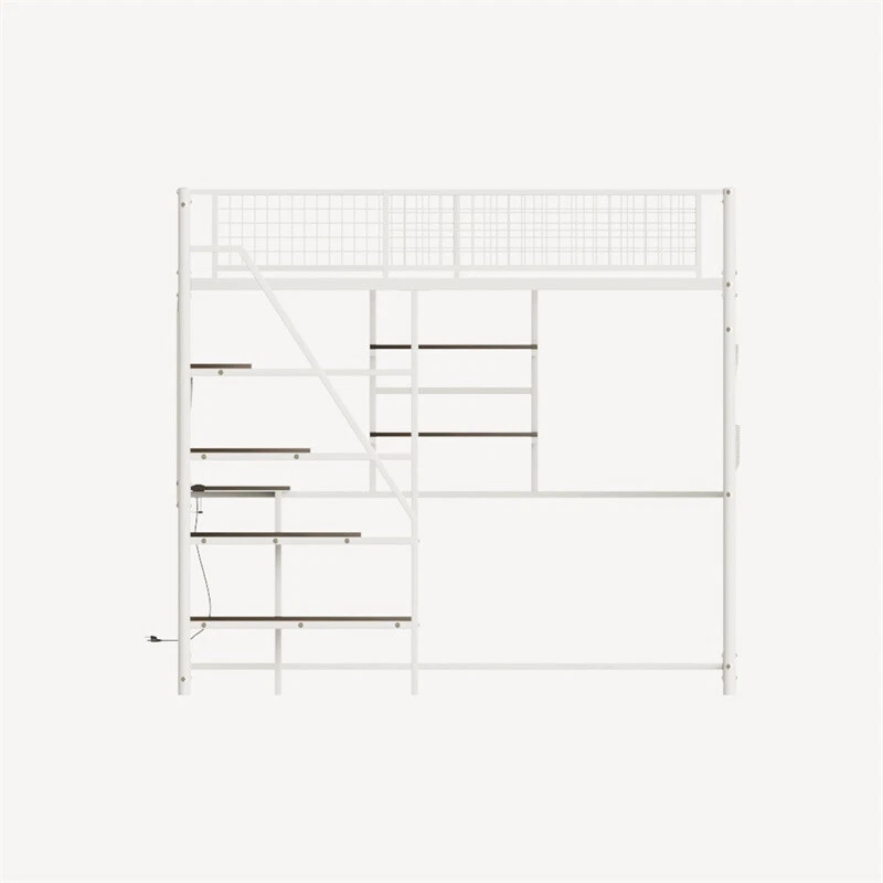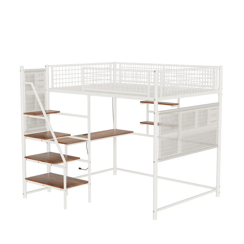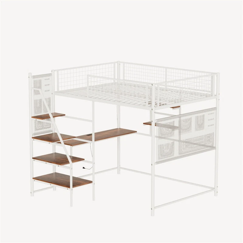 Full Size Metal Loft Bed with Desk,Storage Shelves & LED Light for Teens Adults Features 【Loft Bed with Desk】The full size loft bed can be configured as two separate spaces. While satisfying rest, the under the top bunk bed provides more personal space for work or leisure. Built-in desk and a charging station in front of the desk,creates a productive, simple work,study or gaming area for your child. Perfect for space-saving needs. [Multi-functional storage design] It comes with two storable cloth bags to place trivial items. The stairs are lengthened and widened, and objects can also be placed freely. The FULL size also has shelves for you to place your items. Multiple storage functions improve storage efficiency. 【Sturdy and Durable】Adopt a stronger square heavy duty metal frame structure that includes closely packed metal slats. Each component is securely secure with heavy-duty screws and tested to ensure the loft full bed security and stability.No Box Spring is Needed.The maximum bearing capacity can reach 400 pounds. 【Safety Guaranteed】The top bunk is equipped with full-length and heightened guardrails that not only stabilize the structure of the twin bunk bed but more importantly protect your safety. Note:Make sure the top of the mattress is at least 5” from the edge of the guardrail. Recommended mattress 4-6inch.We provide strong Anti-Tipping Nails to securely fasten the bed to the wall for added safety. The full size bed leg's wear-resistant foot pads, prevent any unwanted sliding and eliminate noise. 【LED Lights】Full size loft bed frame with vibrant LED lights. Create your favorite bedroom atmosphere. Description