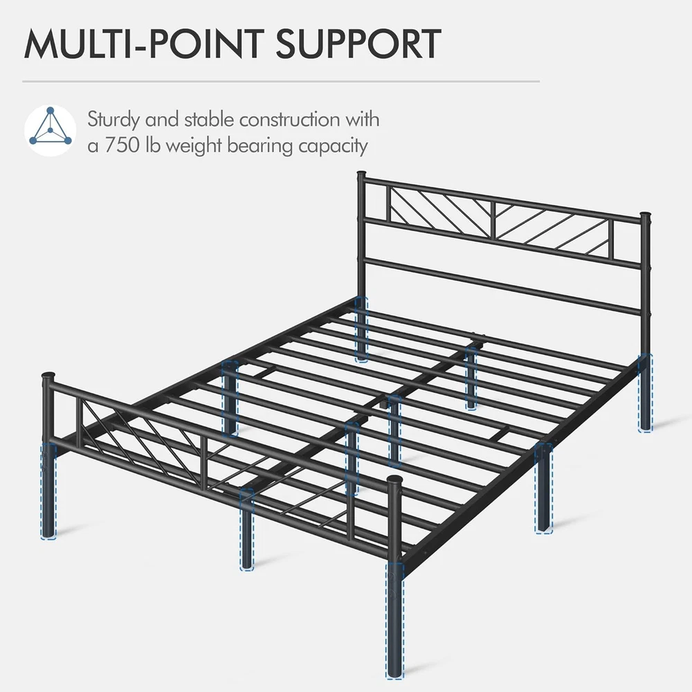 Store New Arrivals Add to Favorite View Feedback Contact Full Size Platform Bed Frame with Arrow Design Headboard, 13 Inches Metal Mattress Foundation for Storage, No Box Spring Needed, Easy Assembly, Modern, Black Description Item model number YT-00120349-001 Finish Type Powder Coated Material Iron Style Modern Assembly Required Yes Color Black Form Factor Platform Bed Product Dimensions 77.5"L x 56"W x 35"H Furniture Finish Black Country of Origin China Maximum Weight Recommendation 750 Pounds Item Weight 39.2 Pounds Compatible With Mattress Size 75" L × 54" W Item Weight 39.2 pounds Age Range (Description) All Ages Ground To Item Distance 13 Inches Included Components Headboard, Slat, Footboard, Instruction Manual Size Full Special Feature No Box Spring Needed, Under Bed Storage, Sturdy, Squeak Resistant ARROW DESIGN HEADBOARD AND FOOTBOARD: The stylish head and footboard of this metal-framed full bed are embellished with chic arrow patterns, bringing artistic temperament and character to your bedroom. Aesthetic but practical, they provide extra protection to your body and keep the covers or blankets in place. RELIABLE SUPPORT: This full size bed frame is built of metal slats, side rails and 6 sturdy legs, with a maximum weight capacity of 750 lb, ensuring a peaceful night's sleep without being bothered by squeaky sounds. 12 built-in metal slats provide optimal support for your mattress and bedding (no box spring required). OPTIMUM OFF-GROUND HEIGHT: The iron platform bed stands 13’’ off the floor, allowing easy access to the boxes and baskets underneath, also making you effortlessly get into or out of the bed, which is perfect for sleepers of all ages. SECURE YOUR MATTRESS: The side rails of this metal bed frame are thoughtfully designed to be higher than the inserted slats, preventing the mattress from significantly sliding around. FAST & EASY ASSEMBLY: All the necessary parts, handy tools and easy-to-follow instructions are included in one efficiently packed box for simple set up within an hour, saving you time and hassle. Product Description Modernize your sleeping space with this full metal platform bed with arrow design headboard and footboard. With a nod to minimalist design, this metal bed plactform embraces a clean-lined appearance, stylish arrow design and sleek metallic finish that seamlessly blends with any home decor style. Constructed of a solid and durable metal frame, this bed frame features multiple strong support legs that provide optimal stability for any type of latex, memory foam or spring mattress without a clumpy box spring. Details like the powder-coated finish and non-slip foot caps all contribute to your safety and comfort. Plus, the platform bed frame creates sufficient under-the-bed storage space for your luggage, shoes, bags and other odds & ends, keeping your bedroom tidy and clutter-free. ABOUT US We offer the best prices around on high quality products. Our E-store includes media such as books, movies, music and games while offering electronics, toys, sporting apparel, clothing, tools, general home, garden items and more. SHIPPING We are always working hard to ensure your package arrives as soon as possible. Please understand that some factors like weather, high postal traffic, and the performance of shipping companies are outside of our control. We offer free shipping to the lower 48 states and ship within 2 business days of payment, usually sooner. We do not accept P.O. Boxes. Please provide a physical address. For shipping outside of the continental USA, we only use eBay's Global Shipping Program.The item is shipped to KY and then sent to the rest of the world. International customers are responsible for all duties and taxes. Continue to check out in order to calculate costs for shipping the item to your country. Messages regarding eBay's Global Shipping Program MUST be directed at eBay EXCLUSIVELY. RETURNS We offer a 30-Day Return Policy on items which you are not completely satisfied with. You have the option for a full-refund or an exchange of the item. No returns are available on items shipped outside of the USA. PAYMENT We accept PayPal. CONTACT US This page content is yet to come Please ad us to your favorite seller and visit again later Thank You CUSTOMER SATISFACTION We try our very best to make sure every customer is completely satisfied. If there's a problem, message us! We're happy to help.