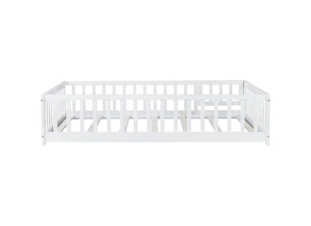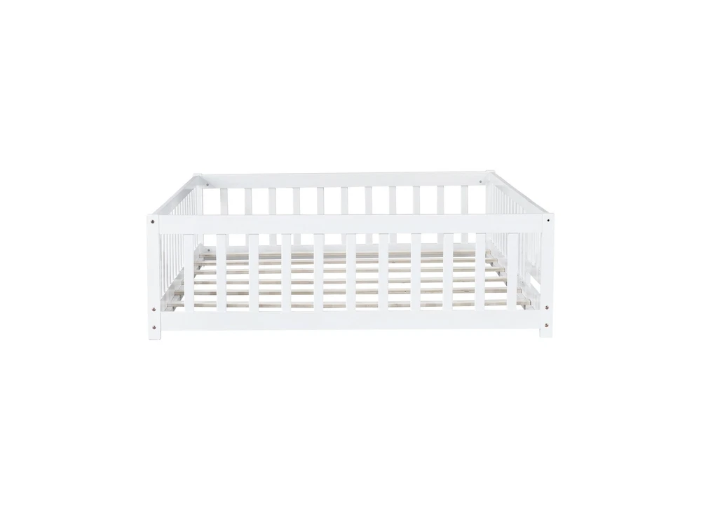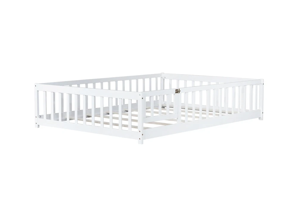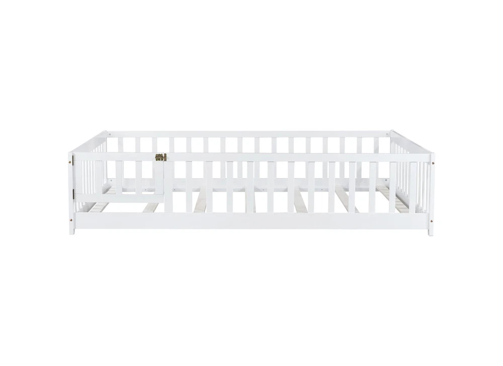 Product Information Product Type: Single Box Product Product Name: Full Size Floor Bed with Fence and Door,Rubber Wood Floor Bed with Safety Guardrails,White Place of Origin: Malaysia Main Color: White Main Material: Rubber Wood Bed Size: Full Product Dimensions Assembled Length (in.): 76.60 Assembled Width (in.): 56.50 Assembled Height (in.): 17.50 Product Weight (lbs.): 48.50 Package Size Length (in.): 78.50 Width (in.): 18.30 Height (in.): 4.50 Weight (lbs.): 55.10 Product Features [Multi-functional Design] The floor bed is designed to help the parents to look after their children and give a playground to learn walking and climbing, also it’s an ideal place for kids to sleep on it. the bed is most suitable to those compact rooms and limited space. The kids may feel they are playing in the wonderland if you can give some lovely decoration. [Perfect for Transition Period] The low-floor bed facilitates the transition from co-sleeping to an independent sleeping environment, thereby fostering children's autonomy. The fence-enclosed design promotes exploration and freedom within their personal space. [Solid and Sturdy Structure] The product is mainly crafted from premium rubber wood and quality engineered wood, thus making it sturdy and durable. The full surrounding fence will definitely give a perfect protection. The wood structure is firmly fixed and strengthened mutually by every part. [Fence Door and Platform Slats] The bed platform is constructed with 7 strengthened slats, and provides strong support and enough tenacity.The bed is equipped with a revolving door, which has 2 hinges and a steel latch.The door facilitates safe and efficient access for children entering and exiting the bed. [Easy-Assembly] The floor bed is delivered in single package, along with the manual and full set of hardware necessary to guide you through the process of assembly, and the bed will surely be assembled swiftly. Notice: Due to variations in lighting, equipment, weather conditions, and other factors, the colour tones of the products customers purchase may exhibit slight differences compared to the representations in the pictures or photos displayed in our store. Description Description It’s the best wise choice to have a full size floor bed with fence at your home. The product is crafted from quality rubber wood. The eco-friendly painting gives a safe and environmentally-friendly space. The floor bed is very convenient and quick to be fixed under the guidance of the installation manual. Description Product Type Floor Bed with Fence Size Full Color White Material (main) Rubber wood + Plywood Number of Slats 7 pcs Spring Box No need Assembly Required Yes Manual and Hardware Yes Country of Origin Malaysia Technical Details Overall Product Dimension 76.6“x 56.5”x 17.5” Overall Product Weight 48.5 lbs Package Details Please refer to the Specification Bed Weight Capacity 400 lbs Suggested Mattress Thickness 6 inches or less
