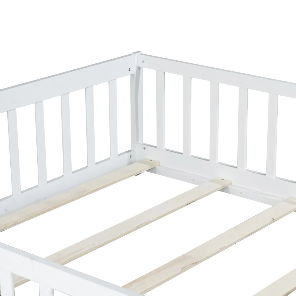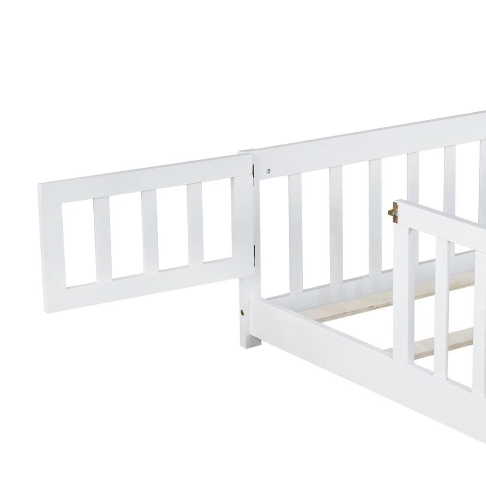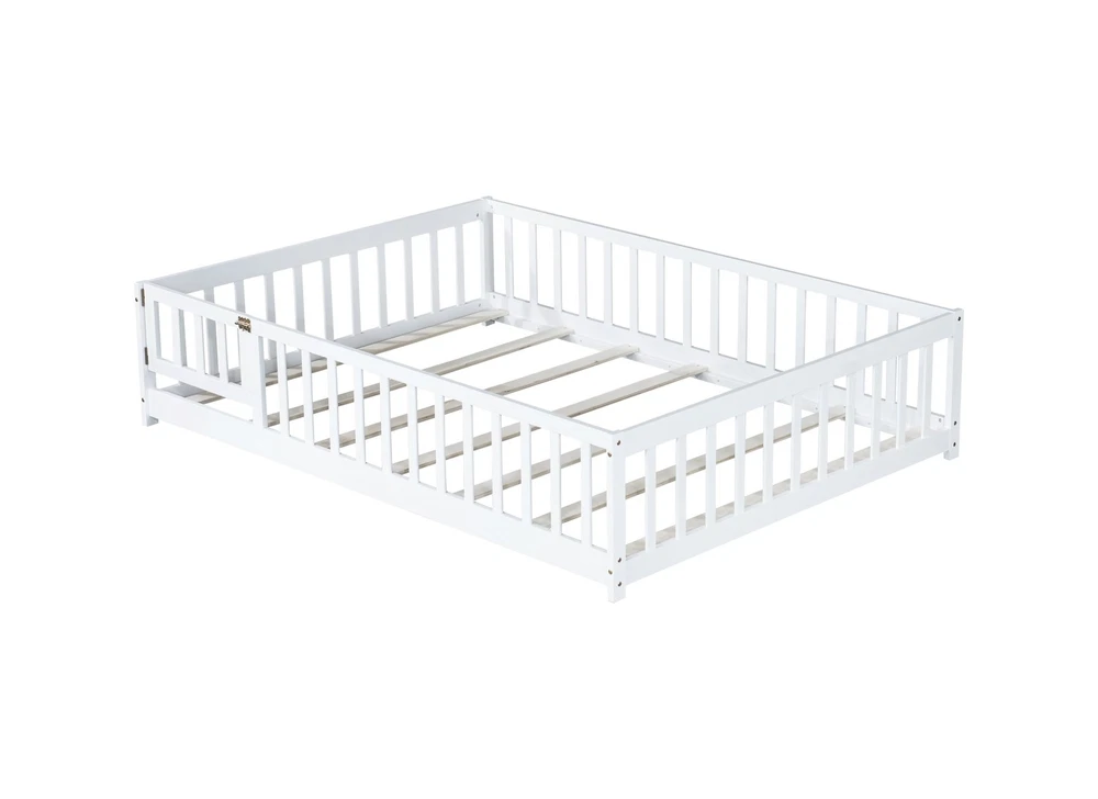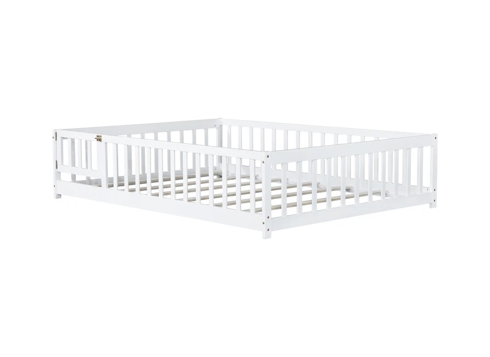 Product Information Product Type: Single Box Product Product Name: Full Size Floor Bed with Fence and Door,Rubber Wood Floor Bed with Safety Guardrails,White Place of Origin: Malaysia Main Color: White Main Material: Rubber Wood Bed Size: Full Product Dimensions Assembled Length (in.): 76.60 Assembled Width (in.): 56.50 Assembled Height (in.): 17.50 Product Weight (lbs.): 48.50 Package Size Length (in.): 78.50 Width (in.): 18.30 Height (in.): 4.50 Weight (lbs.): 55.10 Product Features [Multi-functional Design] The floor bed is designed to help the parents to look after their children and give a playground to learn walking and climbing, also it’s an ideal place for kids to sleep on it. the bed is most suitable to those compact rooms and limited space. The kids may feel they are playing in the wonderland if you can give some lovely decoration. [Perfect for Transition Period] The low-floor bed facilitates the transition from co-sleeping to an independent sleeping environment, thereby fostering children's autonomy. The fence-enclosed design promotes exploration and freedom within their personal space. [Solid and Sturdy Structure] The product is mainly crafted from premium rubber wood and quality engineered wood, thus making it sturdy and durable. The full surrounding fence will definitely give a perfect protection. The wood structure is firmly fixed and strengthened mutually by every part. [Fence Door and Platform Slats] The bed platform is constructed with 7 strengthened slats, and provides strong support and enough tenacity.The bed is equipped with a revolving door, which has 2 hinges and a steel latch.The door facilitates safe and efficient access for children entering and exiting the bed. [Easy-Assembly] The floor bed is delivered in single package, along with the manual and full set of hardware necessary to guide you through the process of assembly, and the bed will surely be assembled swiftly. Notice: Due to variations in lighting, equipment, weather conditions, and other factors, the colour tones of the products customers purchase may exhibit slight differences compared to the representations in the pictures or photos displayed in our store. Description Description It’s the best wise choice to have a full size floor bed with fence at your home. The product is crafted from quality rubber wood. The eco-friendly painting gives a safe and environmentally-friendly space. The floor bed is very convenient and quick to be fixed under the guidance of the installation manual. Description Product Type Floor Bed with Fence Size Full Color White Material (main) Rubber wood + Plywood Number of Slats 7 pcs Spring Box No need Assembly Required Yes Manual and Hardware Yes Country of Origin Malaysia Technical Details Overall Product Dimension 76.6“x 56.5”x 17.5” Overall Product Weight 48.5 lbs Package Details Please refer to the Specification Bed Weight Capacity 400 lbs Suggested Mattress Thickness 6 inches or less