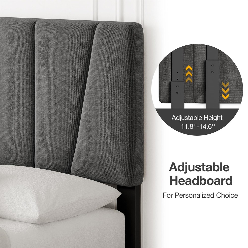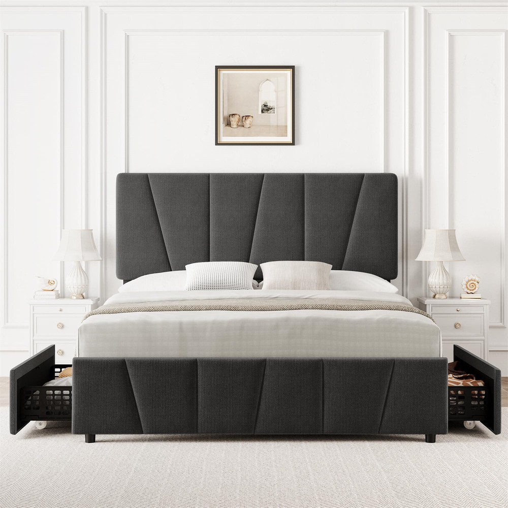 1. This full-size bed frame is a total game-changer! The four large storage drawers underneath are super practical, keeping my bedroom clutter-free while making it easy to access extra bedding and clothes. The smooth-rolling wheels and secure locks add convenience. I love the adjustable headboard—it fits my thick mattress perfectly, giving a sleek, custom look. The sturdy upholstered design feels high-end, and the platform base eliminates the need for a box spring. It was simple to assemble, and the modern style blends beautifully with my decor. Super functional and stylish—a must-have for small spaces!