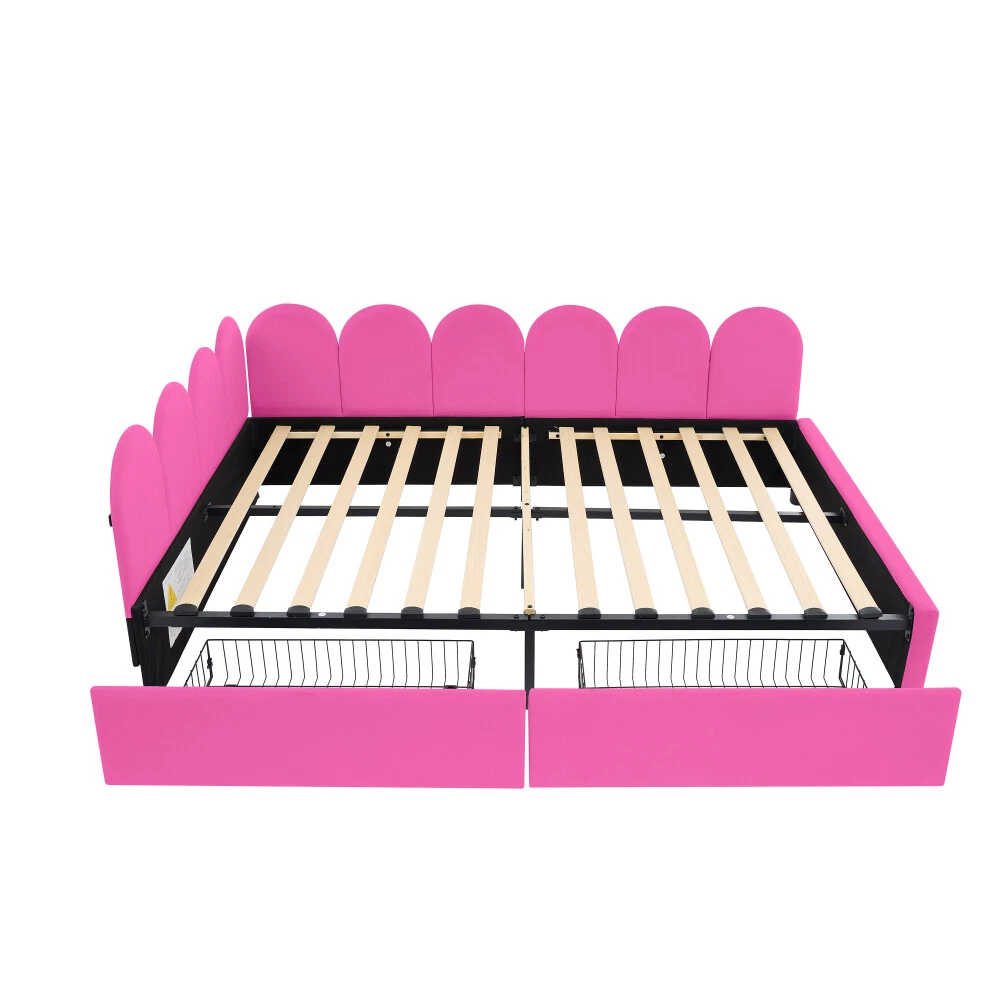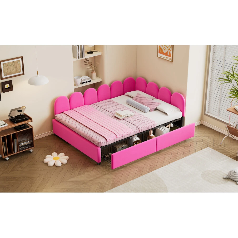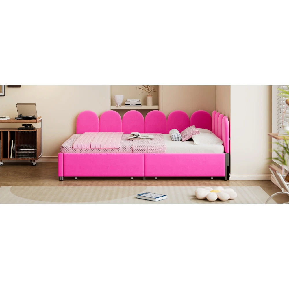 Comfortable Fabric: This upholstered daybed is made of selected velvet, soft fabric headboard provides a comfortable and warm sleeping environment. Elegant Design: This daybed is not only suitable for any home decoration, but also loved by children.The diagonal design of the headboard allows this bed to be placed in a corner, saving space and making it more comfortable. 2 Large Drawers: This daybed has 2 drawers for storing clothes, books, toys, etc. It is very practical and makes full use of the space. Solid Construction: Made of high-quality MDF, the frame of this bed is not easy to be affected by humidity change and lead to crack. The strong legs, wide boards and 12 slats for bed, not only improve the weight capacity of the bed greatly but also ensure the stability. Dimensions and Assembly: Overall Product Dimension: 78"L X56.2"W X 27.69"H. Suitable for full size mattresses. Full size Upholstered Daybed with 2 Drawers, Velvet Sofabed with Soft Fabric Headboard, Rose Red This daybed is made of selected velvet, elegant white,rose red or pink, with tufted shape headboard, elegant and cute, not only suitable for any home decoration, but also loved by children. A soft fabric headboard provides a comfortable and warm sleeping environment. This daybed is a valuable choice as it does not require a box spring or foundation. Just place your mattress on top and enjoy it. With our daybed, relaxation meets efficiency, making it the perfect addition to any modern home.