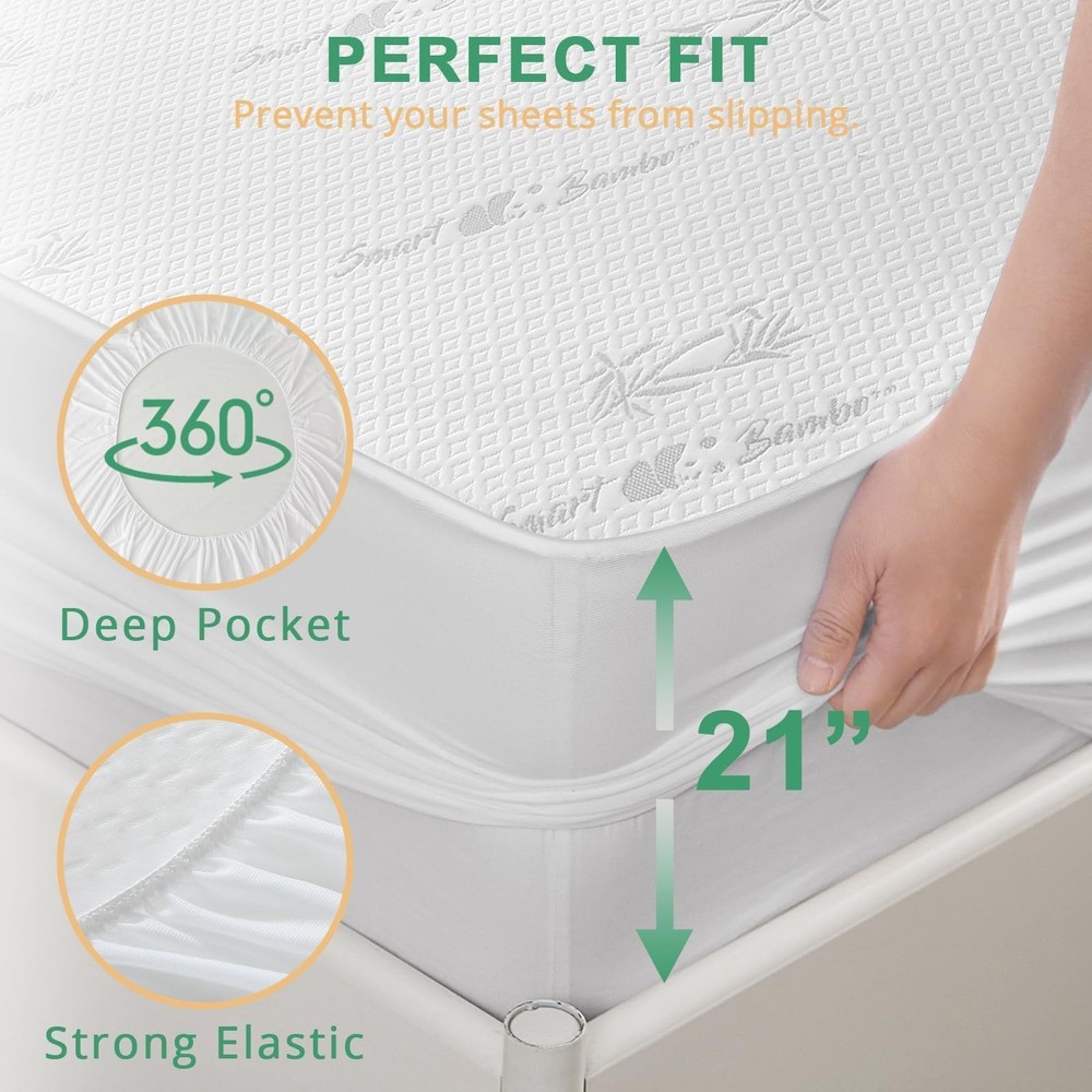Mattress Protectors Full Panda Premium Microfiber: Our mattress protector is made of 70% viscose for bamboo and 30% polyester and is fast-wicking and anti-odor. Moisture-wicking fabric keeps you cool and comfortable while you sleep to ensure an optimal night's sleep Waterproof TPU Backing: The backing of this full mattress protector is made of a premium TPU membrane that prevents stains such as spills, sweat, body fluids, and bedwetting. It keeps your mattress clean and dry Fitted Skirt: The elastic fitted skirt fits oversized 21 inches deep, and the 360° cover and sham style keep your mattress cover securely in place, easily protecting your mattress from accidental spills and soiling Versatile and Resilient: Our waterproof mattress protectors are suitable for a variety of life scenarios, including homes with children, pets, allergies, asthma, eczema, or incontinence, making your life easier Easy Care and Maintenance: Our mattress protector is designed for easy care and maintenance. Machine washable at 30 degrees centigrade and tumble dryable at low temperature for easy cleaning