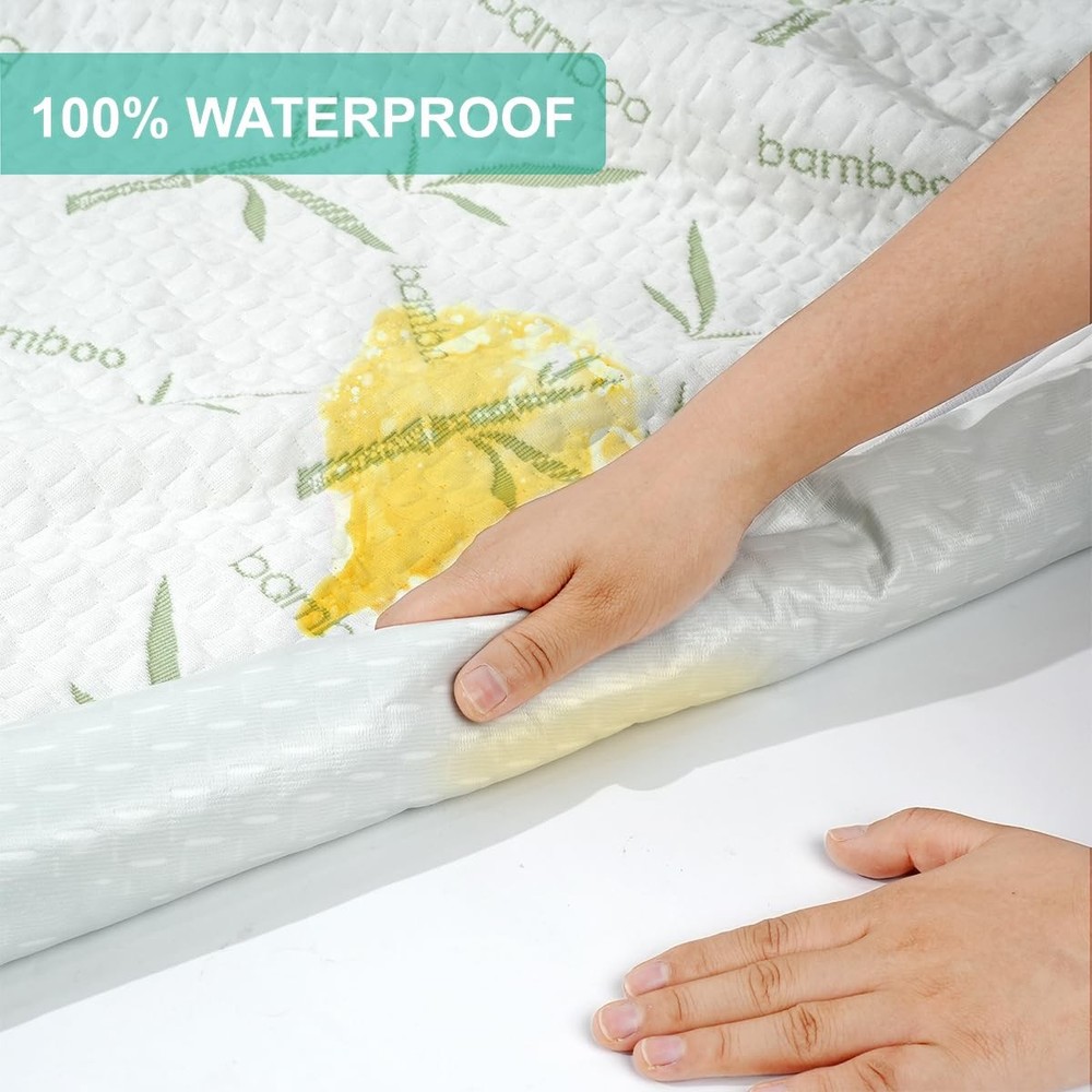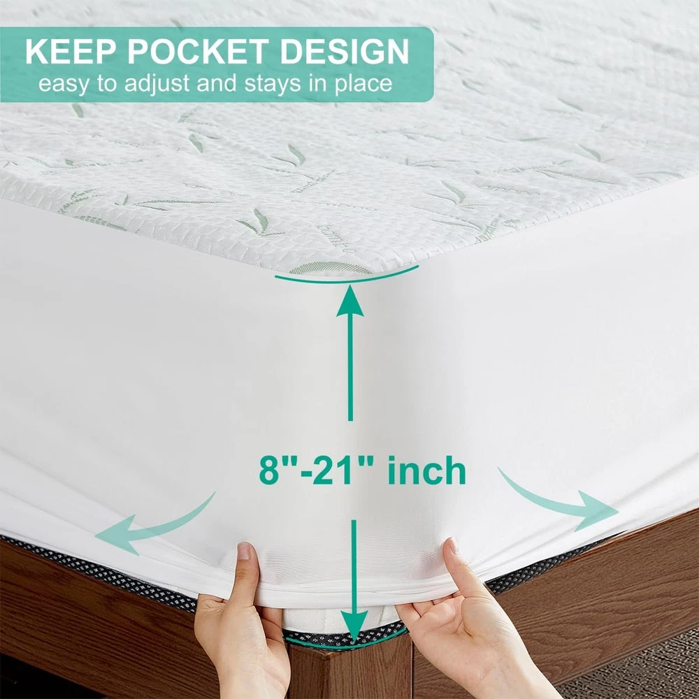 Full Size Mattress Protector 100% Waterproof Mattress Protector Bamboo Mattress Protector Full Size Deep Pocket Fitted Up to 21" Cooling Mattress Protector, Breathable, Full Mattress Cover 【100% Waterproof】Shield your mattress with complete waterproof protection using our full size mattress protector. Guard against spills, sweat, and stains with this waterproof mattress protector, ideal for families, pet owners, or anyone seeking reliable protection. This full size mattress cover and full mattress cover offer long-lasting dryness and comfort, keeping your bed fresh and clean. 【Breathable Bamboo Comfort】Enjoy a cool, airy sleep with our bamboo mattress protector that wicks away moisture and heat, perfect for warm sleepers and hot climates. This mattress protector full size bed delivers comfort and freshness, while the waterproof mattress protector full and mattress protector provide lasting protection. Wake up refreshed every morning! 【Noiseless & Soft 】Say goodbye to crinkling sounds! This full mattress protector is soft and silent, ensuring undisturbed sleep for everyone, including kids, pets, and light sleepers. Our full size mattress protector waterproof and full bed mattress protector deliver ultimate comfort and protection, while the full size mattress pad adds an extra layer of coziness. 【Deep Pocket Fit】With a snug 21” pocket, our mattress protector full stays firmly in place, providing a secure, wrinkle-free fit on any bed. Enjoy added comfort all night with this mattress cover that won't slip. Our full size waterproof mattress protector and waterproof full size mattress protector offer reliable protection and a cozy, uninterrupted sleep experience. 【Easy Care】Fully machine washable, this mattress pad full is simple to clean and maintain, perfect for hassle-free hygiene. Protect your bed effortlessly with our full size waterproof mattress cover that ensures lasting freshness. This mattress protector full size and mattress cover full size bed waterproof provide superior defense against spills, making it an ideal choice for worry-free comfort.