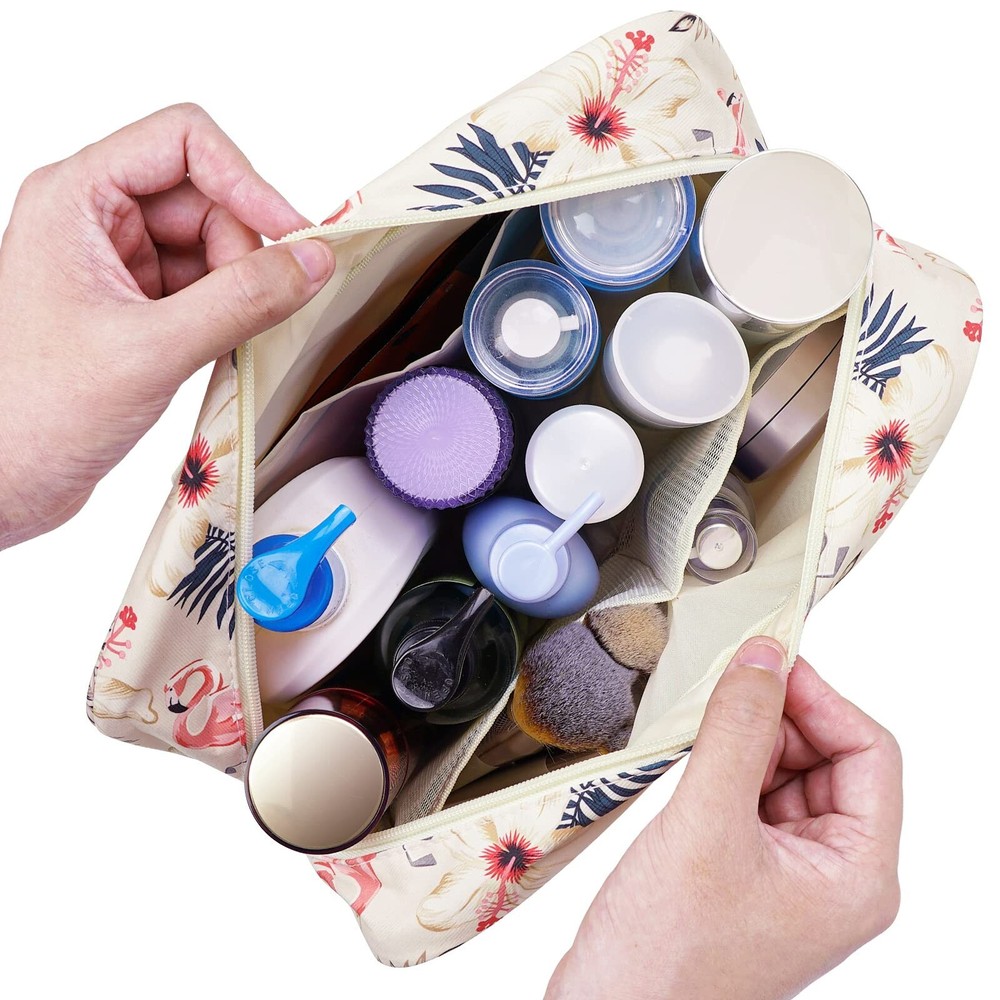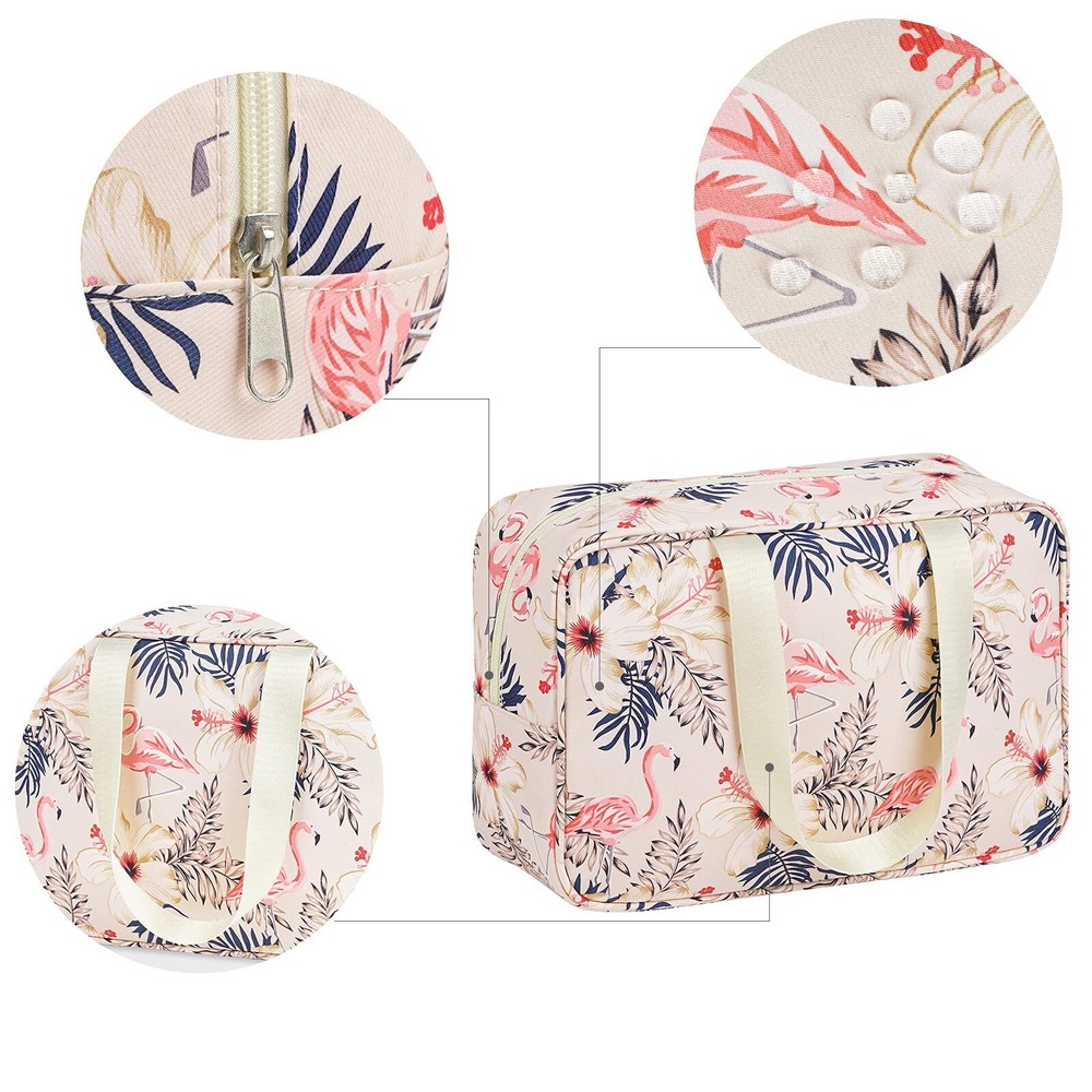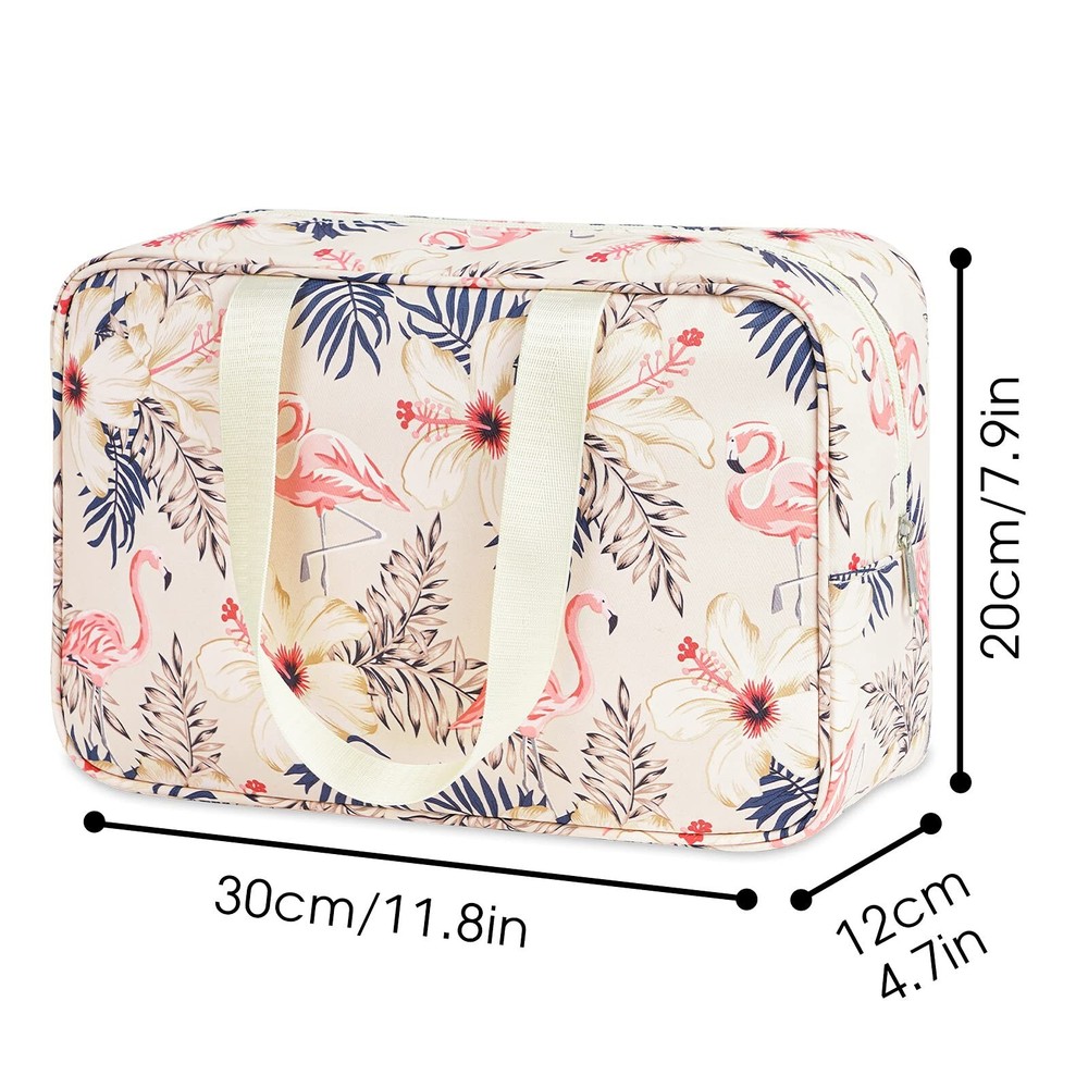 Full Size Toiletry Bag Women Large Cosmetic Bag Travel Makeup Bag Organizer Medicine Bag for Toiletries Essentials Accessories (Large, Beige Flamingo) Product Details Color: Beige Flamingo Brand: Narwey MPN: 5068 UPC: Does not apply EAN: Does not apply Product Dimensions: 11.8 x 7.8 x 4.7 inches Item Weight: 3.52 ounces Department: womens Manufacturer: narwey Country of Origin: China Item model number: 5068 LARGE CAPACITY - Size 11.8"x7.8"x4.7/30x20x12cm, one main compartment and 3 small pockets could easily fit common-size toiletries as well as makeup like shampoo, conditioner, lotion, toothpaste, toothbrushes, hair brush, shaving kit and a few extra items NOT BULKY DESIGN - large size yet compact design, weighing only 8.8 ounces WATER-RESISTENT - Water-resistent and durable fabric protects your gear from spills, easy to wipe down CONSISTENT QUALITY - Soft fabric, nice lining, reliable zipper, zip-top closure CUTE PRESENT & VERSATILE - Compact, sturdy, portable, lightweight, which makes it good for business trips, travel, gym, camping, home use and more. It would be also a very cute present for women