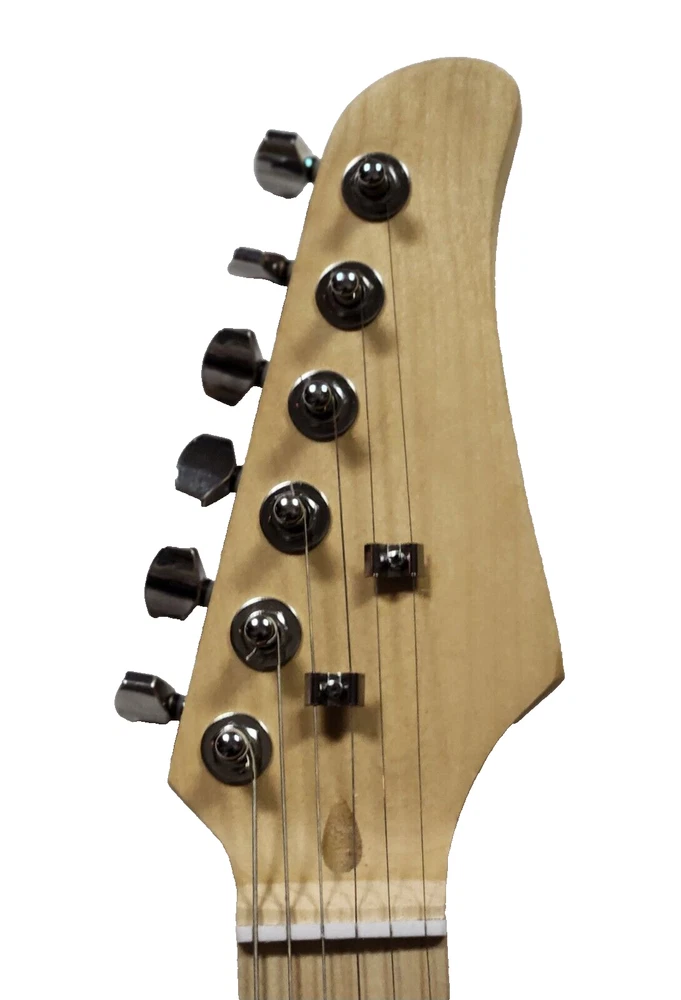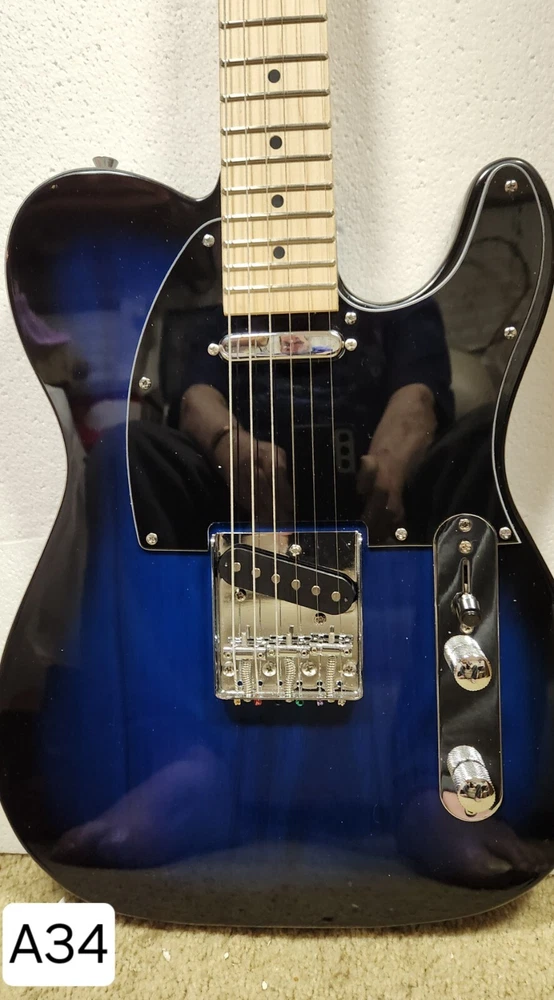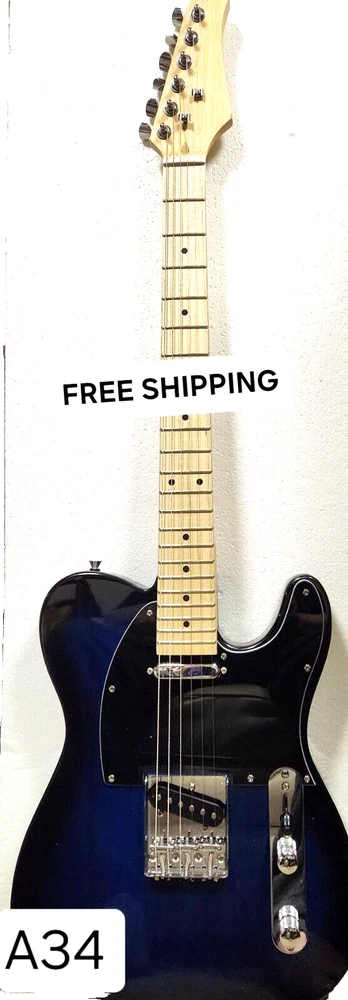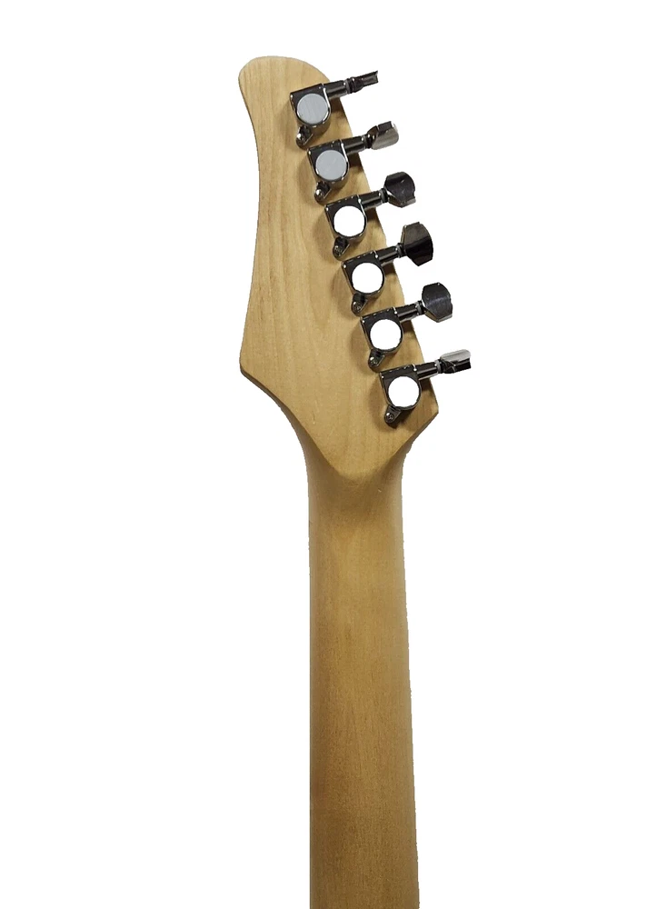 The Full Sized 39" Strat Style Electric Guitar features a solid body in a striking Blue Burst on Black finish, made of basswood with a maple neck and fretboard. This right-handed electric guitar is equipped with 22 frets and two single coil pickups in a Strat style series. Suitable for beginners to professionals, this 6-string guitar from the 2023 model year includes a gig bag, strap, and picks, making it a complete set for any musician.