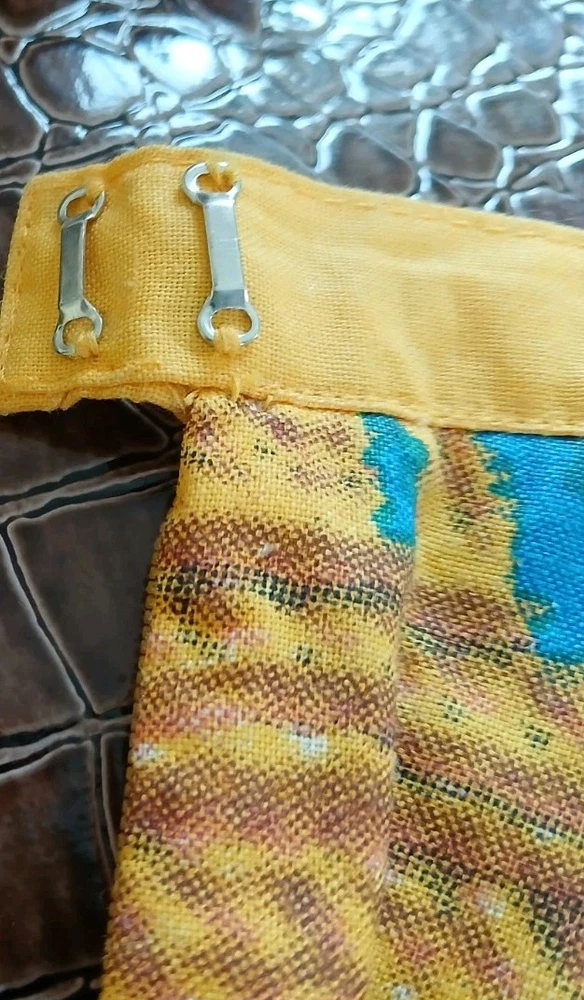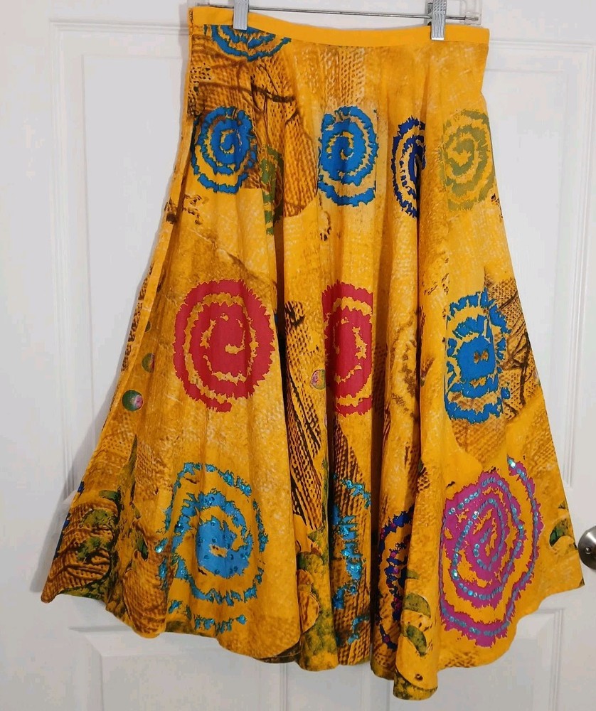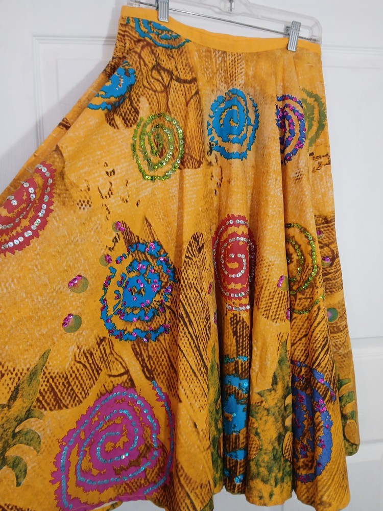 Lying flat the waist band measures 15" Length 31" The vintage beaded bright full skirt by Manuela Moore in size M is a standout piece perfect for those who love rockabilly style. The skirt is made of yellow cotton material and features intricate beadwork, adding a unique touch to your outfit. This art to wear piece is designed to make a statement and elevate your vintage clothing collection with its bold color and attention to detail.