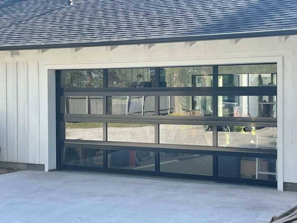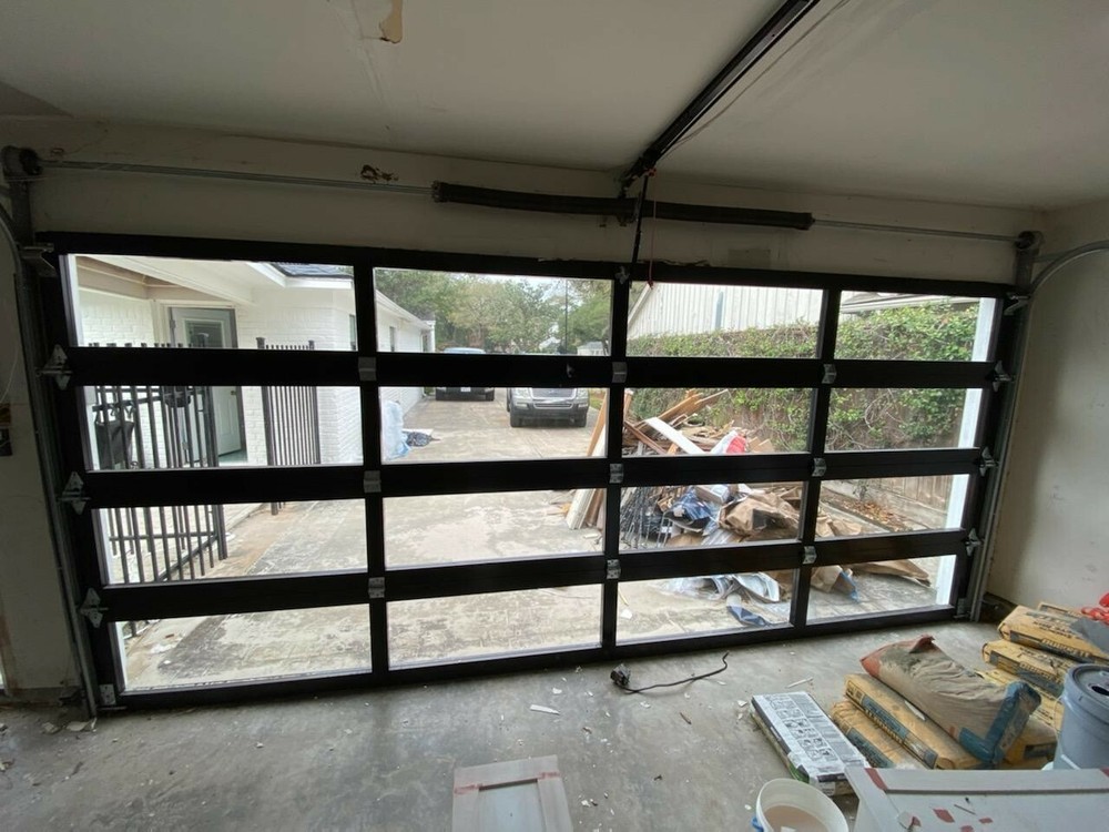 ALSO WE DO HAVE A LOCAL PICKUP FROM OUR WAREHOUSE IN FORT WORTH WHICH YOU CAN CHOOSE ON CHECKOUT PLEASE ALLOW 15 BUSINESS DAYS FOR SHIPPING ON THIS ITEM FULL VIEW MODERN GARAGE DOOR WITH 5 MM NON INSULATED CLEAR GLASS SIZE : 14 FT WIDE BY 7 FT TALL COLOR : MATT BLACK ANODIZED GLASS : CLEAR TEMPERED GLASS SECTIONS : 4 WINDOWS PER SECTION : 4 COMES COMPLETE WITH ALL MOUNTING HARDWARE TRACKS SPRINGS