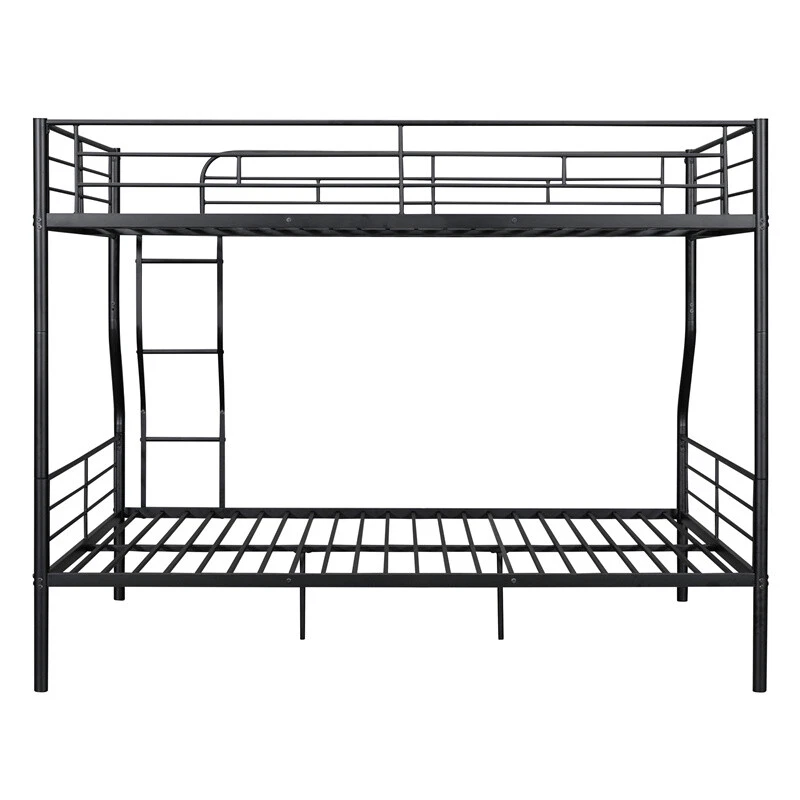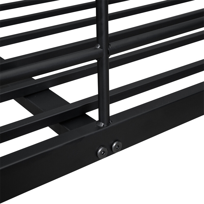 Specification Product Information Product Type:Combo Item Product Name:Full XL Over Queen Metal Bunk Bed Main Color:Black Main Material:Iron Product Dimensions Assembled Length (in.):83.00 Assembled Width (in.):62.60 Assembled Height (in.):65.30 Weight (lbs.):103.62 Package Size Package Quantity: 1 83.66 * 14.17 * 6.1 in. 88.18 lbs. Package Quantity: 2 56.5 * 14.17 * 3.94 in. 26.46 lbs. Product Features [Contemporary Build] The simple yet contemporary bunk bed is a modern classic, featuring a streamlined iron-crafted frame complimented by an eye-catching chrome finish.It will be well matched with your home decor. [Crafted For Safety] Designed with safety in mind, this bunk bed has a weight capacity of up to 250 pounds on top and 350 on the bottom that can handle multiple people at once, while also including full length gridded guardrails that run alongside the upper perimeter. [Save Space or Split Into 2 Beds] An ideal space-saver and a perfect addition for a growing family, the bunk bed efficiently accommodates little ones, and young teens, allowing them the freedom and space to host friends and also offering a sleeping solution for younger sibling that share bedroom space - split the single bunk into two individual beds with ease if you move into a bigger home or your needs change. [Easy Assembly]The bunk bed is delivered in two packages, along with the installation manual and full set of hardware necessary to guide you through the process of assembly, and the bed will definitely be assembled conveniently. [Dimensions] Overall Product Dimension: 83"L x62.6"W x65.3"H. Mattress is not included. Some assembly is required, although we have provided clear instructions and tools. Description The simple yet contemporary bunk bed is a modern classic, featuring a streamlined iron-crafted frame complimented by an eye-catching chrome finish. Manufactured with support you can rely on, the bunk bed is constructed with a sturdy Quality Tested iron frame that eliminates excess wobbling while adding solid stability and durability allowing users to sleep soundly.An ideal space-saver and a perfect addition for a growing family, the bunk bed efficiently accommodates little ones, and young teens, allowing them the freedom and space to host friends.This bunk bed will be a beautiful and practical piece in your bedroom. Weight & Dimensions Overall Product Dimension 83"L x62.6"W x65.3"H Detail Product Dimension Please refer to the Size image Number of Package 2 Package Dimension Please refer to the Specification Overall Product Weight 103.62 LBS Package Weight Please refer to the Specification Weight Capacity Upper Bed:250lbs;Bottom Bed:350lbs Recommended Mattress Thickness Upper Bed:6 inch Max;Bottom Bed:8 inch Recommended age > 6 years old Specifications Product Type Bunk Bed Size Full XL over Queen Color Black Material Iron The number of slats 22pcs+22pcs Assembly Required Yes Notes Manual measurement has been used,there may be some reasonable error.All the pictures are taken by actual samples, slight chromatic aberration may occur due to lighting or display.