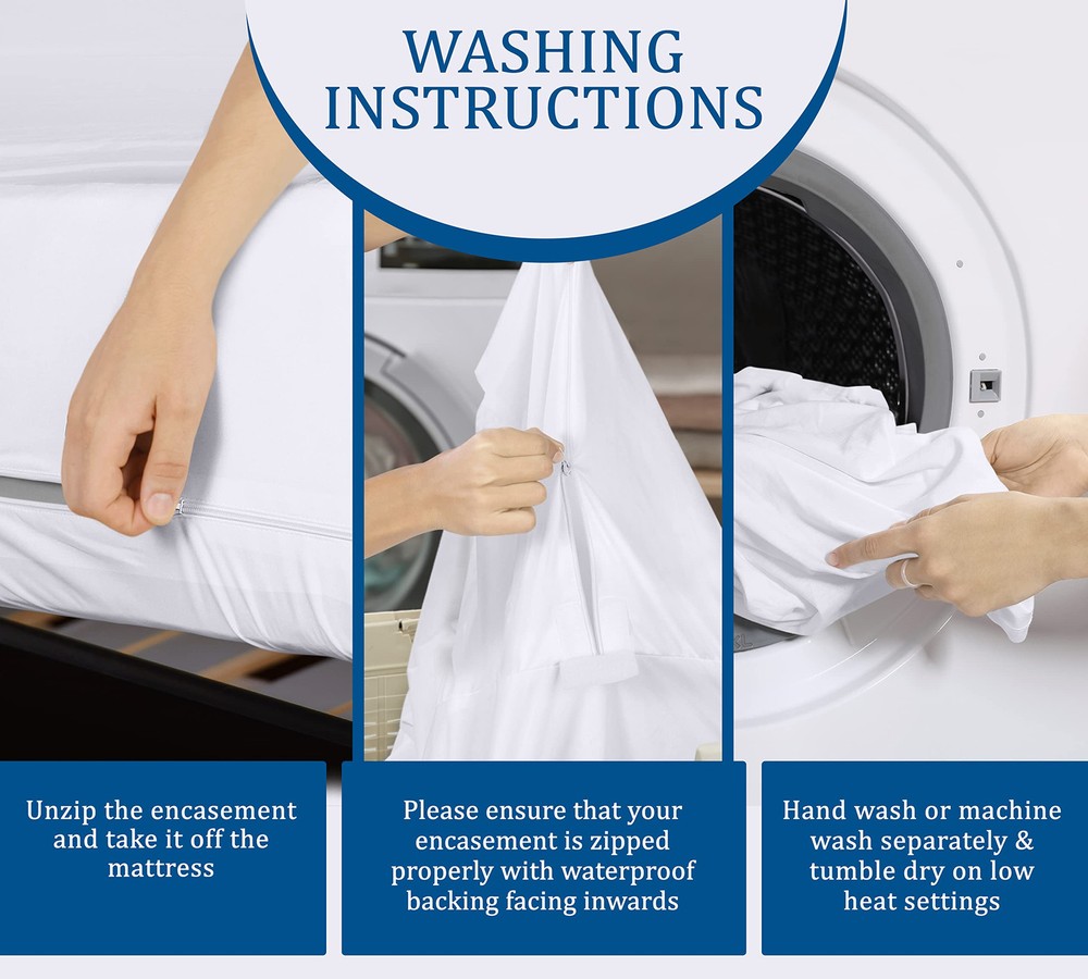 Mattress Encasement - Fits Full size mattress perfectly with dimensions 54 inches by 75 inches; 13 inches deep pocket Knitted Polyester Fabric - Stretchable knitted polyester fabric fits the mattress easily and gives a comfortable feel while you sleep Zippered Cover - Zippered cover with zip secures the mattress from 360 degrees; it protects the mattress 100% Waterproof Protection - Mattress encasement protects your mattress from unwelcome spills and keeps your mattress clean and safe. High quality TPU backing on all sides resist any leakage into the mattress. Easy Care - Machine washable; tumble dry for easy maintenance; Note: Packaging might slightly vary Bed Bug And Dust Mite Proof: High quality zipper completely seals off an encasement and protects against bed bugs and dust mites.