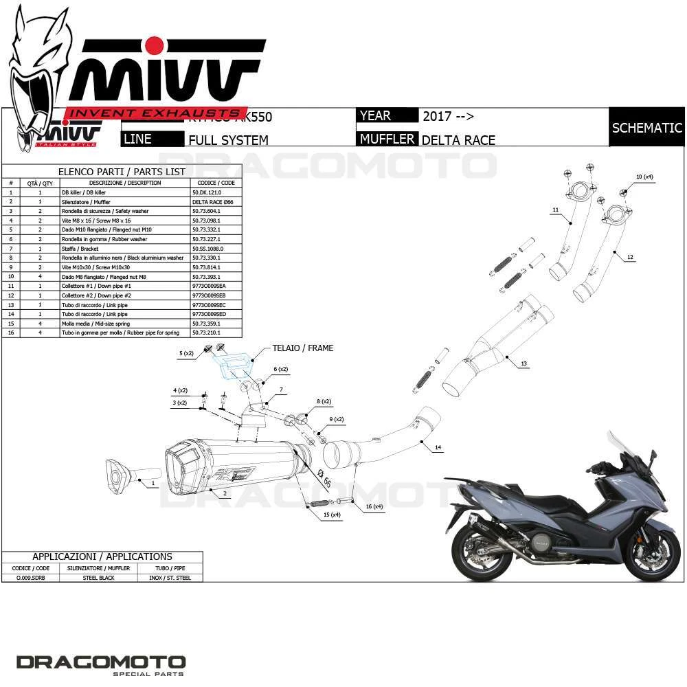 Contacts ebay shop Full exhaust KYMCO AK550 2017 2018 MIVV Delta Race RC Exhaust MIVV compatible with KYMCO AK550 2017 2018 Stainless Steel - Silver - racing - With Mivv Delta Race design and technology meet in a discharge whose shape, through a gradual transformation, passes from conic to hexagonal. Low weight and increase in output and power are the main features of this terminal, ideal for naked, motard and sport bikes. In addition to the shape, there are many details that make the style of this exhaust unique, such as the carbon pad, the band perimeter with double riveting or the inlet fitting machined from solid, to offer maximum coupling precision. On the terminal there is the characteristic Mivv logo created by laser. Exhausts Brakes Helmets Air filters RIZOMA View full image View full image View full image Full exhaust KYMCO AK550 2017 2018 MIVV Delta Race RC Exhaust MIVV compatible with KYMCO AK550 2017 2018 Stainless Steel - Silver - racing - With Mivv Delta Race design and technology meet in a discharge whose shape, through a gradual transformation, passes from conic to hexagonal. Low weight and increase in output and power are the main features of this terminal, ideal for naked, motard and sport bikes. In addition to the shape, there are many details that make the style of this exhaust unique, such as the carbon pad, the band perimeter with double riveting or the inlet fitting machined from solid, to offer maximum coupling precision. On the terminal there is the characteristic Mivv logo created by laser. Information Specifics: Model: DELTA RACE db-killer ( if applicable ) : Removable Code: O.009.SDRB Original MIVV product , include components for installation Exhaust Brakes Helmets Air filters RIZOMA Purchase rules Payments Payments with Paypal / credit card Shipping All shippings with courier and tracking number. Returns Return is possible , the rules for return are inside ebay return rules for this sale copyright Dragomoto