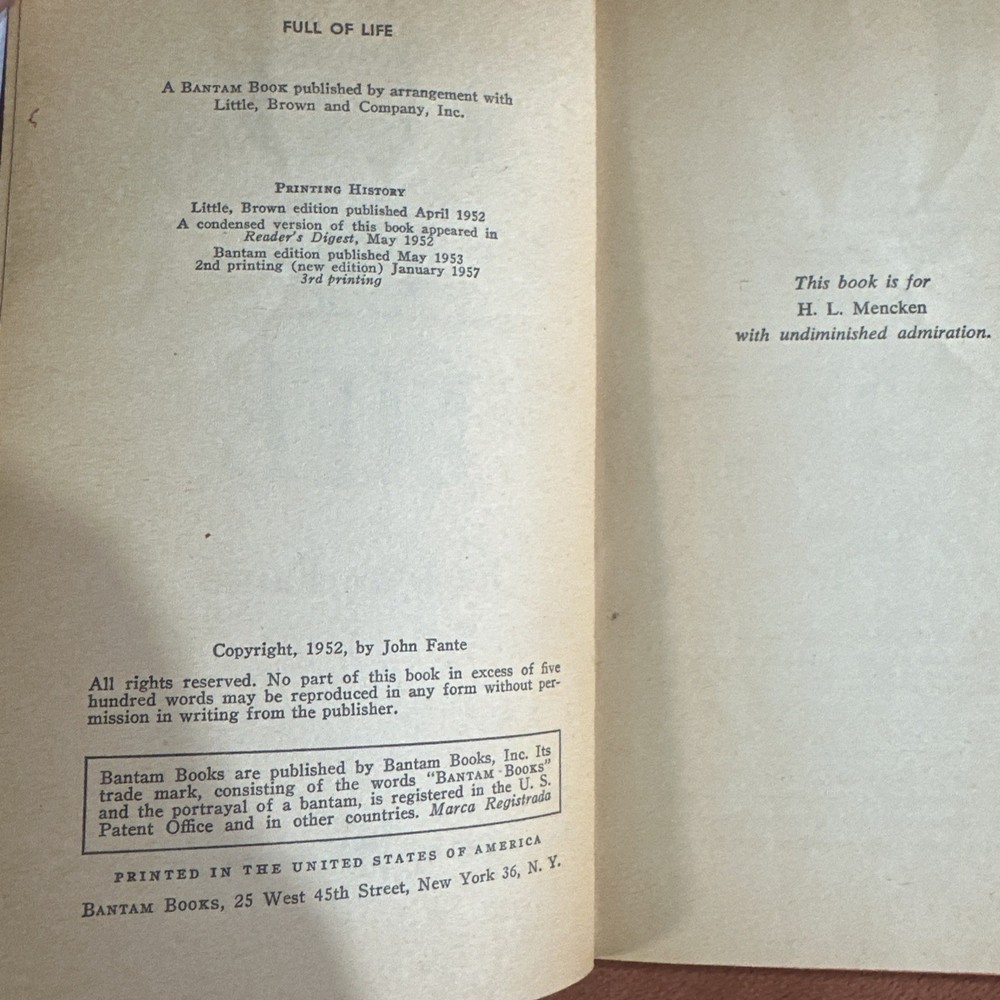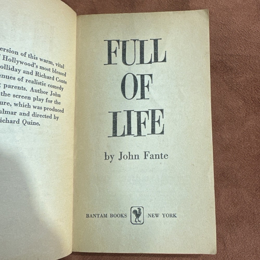 The product described is a rare paperback book titled "Full of Life" by John Fante, printed in 1952 and 1957 by Bantam Books. This collectible item is a second printing and is sure to be a valuable addition to any book collector's library. With its unique and limited availability, this book is a special find for fans of John Fante's work and collectors of rare prints.