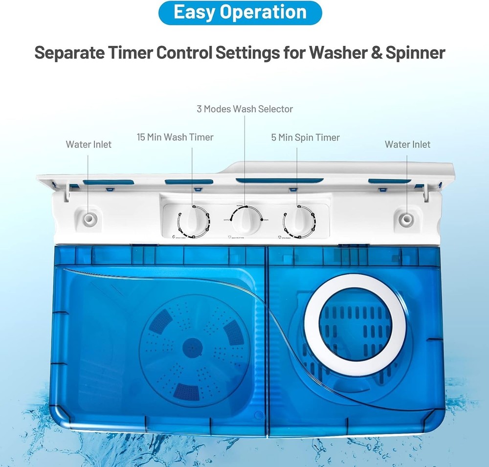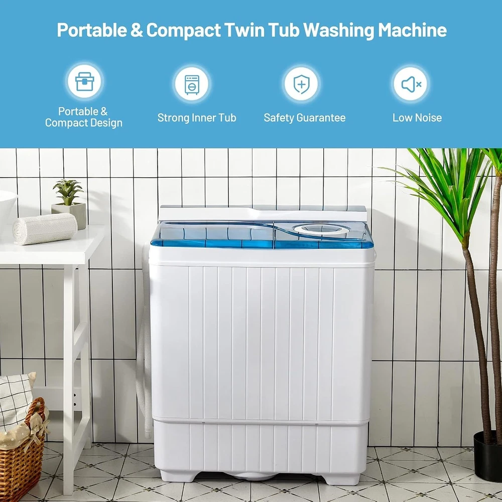 Full-Automatic Washing Machine Portable Compact, White+Blue [2-in-1 Design for Convenience]: Our practical washing machine comes with two tubs, which means you can make different settings for washing and spinning. Besides, the washing and dehydration function can be used simultaneously, providing much convenience for your daily use. This 2-in-1 machine saves space and money for an extra dehydrator. [Separate Timer & 3 Selection Modes]: 15 minutes washing time and 5 minutes spinning time can be freely set based on your laundry types. In addition, there are 3 modes for your selection. Gentle and normal are for washing. After washing, you can select drain mode to drain out water inside wash tub. For example, gentle mode takes 3-5 minutes to wash silk or floss clothing. [Enough Capacity & Easy Operation]: Designed with 18lbs capacity for washing and 8lbs capacity for drying, our washing machine facilitates convenient laundry for household use. It can accommodate your shirts, sweaters, underwear and so on. This washing machine allows you to simply put in your clothes, inlet water, set the timer, and then start washing. [Powerful Dual Motor]: Equipped with 280W washing power and 140W spinning power, the washing machine meets the performance requirements for powerful use and helps you save time as well. A powerful turbine offers high-efficient swirl washing to your clothes while the high-speed spin can spin dry the clothes quickly. [Built-in Drain Pump & Wide Application]: With built-in drain pump, the drain hose can easily drain the water and keep your floor clean. With the size of ” x ” x ”, it is suitable for spaces like dormitories, RVs, apartments, etc. Besides, featuring a clear washer lid, you can view the process of clothes and water level at any time while using the washing machine. Washer & Spinner Combo with Good Capacity and Stylish Appearance Design Portable Washing Machine Helps You Wash Clothes Clean & Fast! Don’t miss this portable laundry washer! A smart combination of washing and drying can well suit your various laundry needs. Equipped with flexible timing function and 3 selection modes, the washer can be set into various time and washing modes based on your washing requirements. Besides, its powerful motor is designed for high-efficient washing, which can clean your clothes faster. There are built-in drain pump and long tube to make it convenient to drain the dirty water out. This compact washing machine is perfect for various places, such as apartments, dorms, RVs, etc. It will be a great helper to offer a convenient and upgraded washing experience.