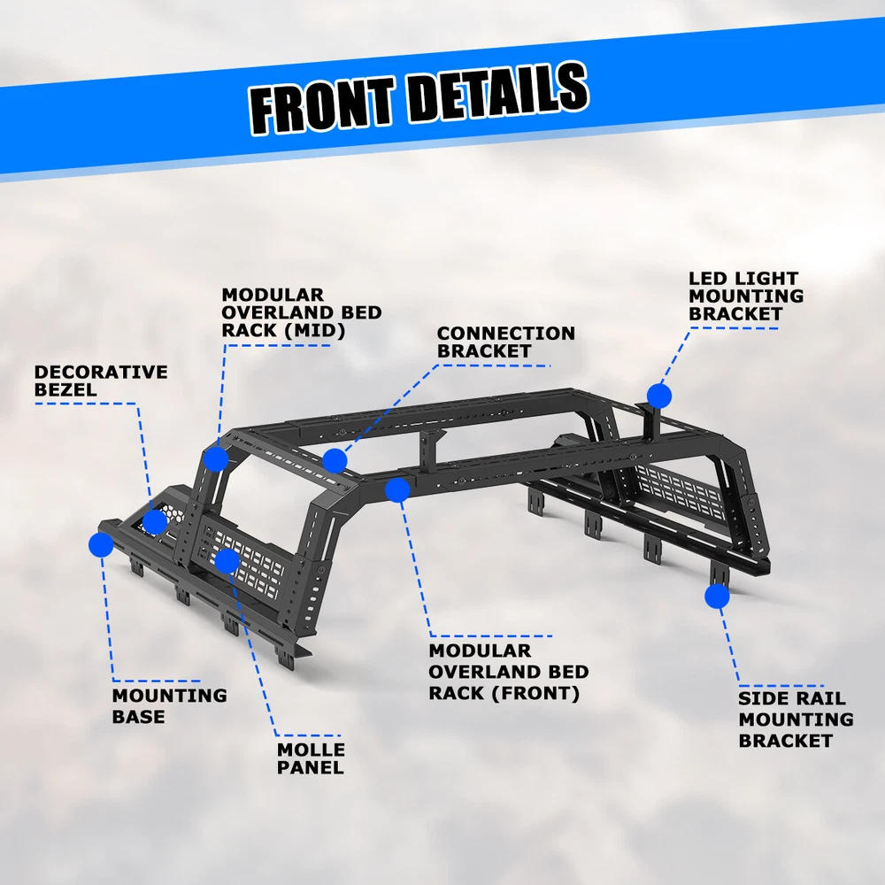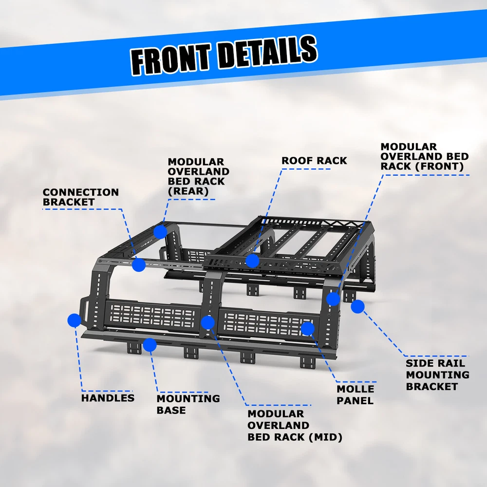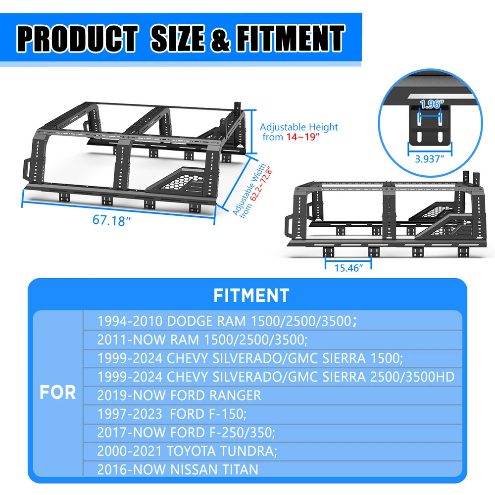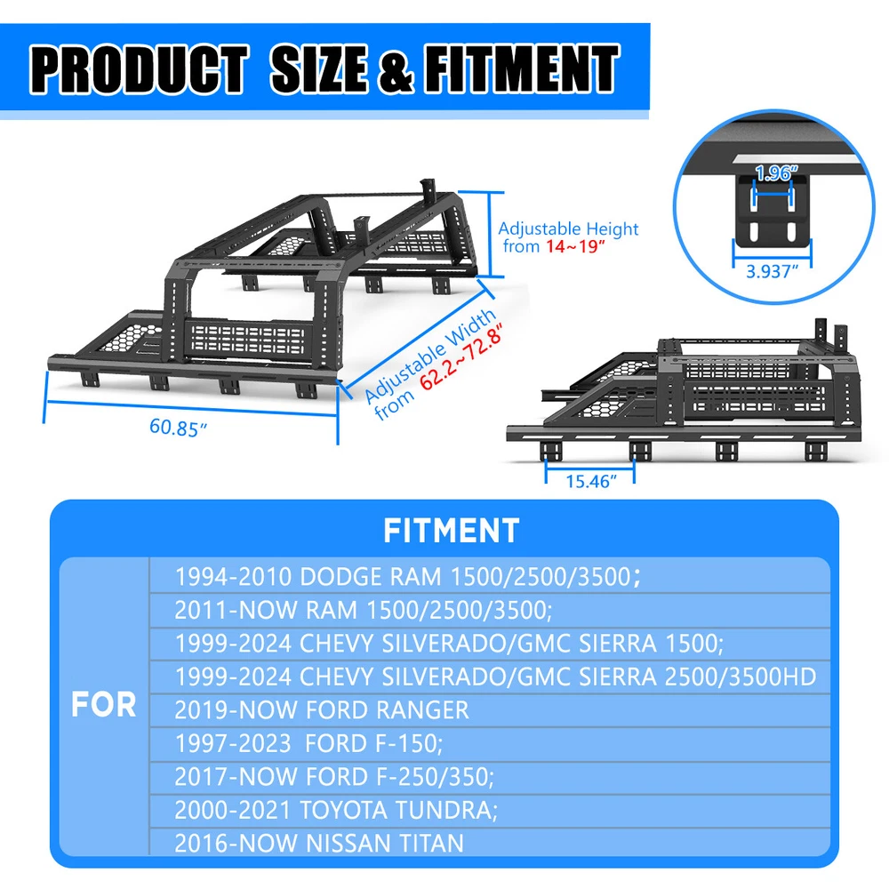 Title Other Head Lights For Jeep For Ford For Dodge For Chevy/GMC For Honda For Toyota For Nissan For Subaru For Mazda For Acura For Mitsubishi For Audi For MINI Tail Lights For Jeep For Dodge For Chevy/GMC For Toyota For Nissan For Honda For Volkswagen For Mazda For Subaru For Isuzu For Mitsubishi For Cadillac For MINI Fog Lights For Jeep For Ford For Honda For Dodge For Toyota For Chevy/GMC For Nissan For Mazda For Subaru For Infiniti For Cadillac For Scion For Lincoln For Acura For BMW For Hyundai For Volkswagen For Buick For Chrysler For Lexus For Mercedes Benz For Kia For Audi For MINI Turn Signal Lights For Jeep For Ford For Dodge For Chevy/GMC For Toyota For BMW For Subaru For Nissan For Cadillac For Lincoln Full-Size Pickup Overland Bed Rack Adjustable Truck Cargo Carrier For Dodge Chev Note: This link belongs to a variety of combinations, you can choose your favorite style to purchase. Specification: 100% Brand New & High Quality Material: Steel Type: Modular Overland Bed Rack Mounting Hardware: Included Finished Surface: Anti-corrosion Textured Powder Coating Adjustable Width: 62.2-72.8 inches Adjustable Height: 14-19 inches Fitment: Fits 1994-2010 Dodge Ram 1500/2500/3500 Fits 2011-2024 RAM 1500/2500/3500 Fits 1999-2024 Chevy silverado/GMC sierra 1500 Fits 1999-2024 Chevy silverado/GMC sierra 2500/3500HD Fits 2019-now Ford Ranger Fits 1997-2024 Ford F-150 Fits 2017-now Ford F-250/350 Fits 2000-2021 Toyota Tundra Fits 2016-now Nissan Titan Feature: Roll Bar (Front): LED Light Mounting Bracket: 1. Pod light or Light Bar can be installed. 2.Adjustable position of mounting bracket. 3.Adjustable height range of 4.84-7.6inches. Decorative Bezel: 1.Honeycomb Mesh Allows DIY colour spraying Roll Bar (Mid): Connection bracket: Connect to the Bed Rack (Front) Side Rail Mounting Bracket: Compatible with factory bed rail SpareTyre Carrier:Can be installed above the base. Roll Bar (Front and Mid )Mounting Base : 1.Compatible with most retractable, roll-up, and folding bed covers. 2.bed covers will not be able to fold completely back. 3.Can be secured by punching holes in the bed shoulders or Locked to factory side rails. Roll Bar (Rear) : Connection bracket: Connect to the Bed Rack (Front). Mounting Base: Compatible with most retractable bed covers. Handles: Easy access to the bed. Spare Tyre Carrier : 1.Can be mounted directly on the bed, but requires pre-punched holes and installation of the rivet nut. 2.Compatible with most off-road tire. 3.Available in 5mm steel plate. 4.Width adjustment range 66.2-74.8 Inches. Off-road tools mounting kit : 1. Recovery tracks mounting kit. 2. Jerry can mounting kit. 3. Farm jack mounting kit. Roof Rack : 1.Equipped with brackets for Modular Overland Bed Rack(Front),Otherwise, no bracket is required. 2.Enhances cargo management by providing additional storage options,holds cargo weighing up to 660lbs. Molle Panel: Side panels w/ plenty of long holes cutouts for adding accessories. Mount anything from lights, recovery tracks,jerry can,farm jack, fire extinguisher, bike mounts, etc...2. 2mm steel Construction. Package Include: 1.Roll Bar -Front :Roll Bar -Front Roll Bar -Front+All Mounting Accessories. 2.Roll Bar -Front+Mid :Roll Bar -Front+Mid +All Mounting Accessories. 3.Roll Bar -Front+Mid+Rear:Roll Bar -Front+Mid+Rear +All Mounting Accessories. 4.Roll Bar -Front+Mid+Side Panels:Roll Bar -Front+Mid+Side Panels:Roll Bar -Front+Mid+Side Panels +All Mounting Accessories. 5.Off-Road Tools Mounting Kit:Off-Road Tools Mounting Kit +All Mounting Accessories. 6. Molle Panel:Molle Panel +All Mounting Accessories. 7. Spare Tyre Carrier:Spare Tyre Carrier +All Mounting Accessories. 8.Roof Rack:Roof Rack +All Mounting Accessories. Payment Delivery details Terms of sales About us Contact us Payment 🤟 We accept PayPal (Recommended), credit card, VISA, Google Pay & Discover etc. 🤟 Please submit your payment within 7 days after your purchase. 🤟 If not, eBay will automatically open an Unpaid Item Dispute on our behalf if the item(s) are not paid within 7 days. Delivery details 🤟 Please double check your delivery address and contact information. 🤟 All items will be shipped within 1 business days after payment received. 🤟 Tracking numbers will be easily accessible ASAP they are created and processed. Terms of sales 🤟 Free 60 days Return, we will cover the return post fee. 🤟 If a defective product was received, please do not hesitate to message us via eBay message. 🤟 We will response in 24 hours in business to resolve the problem 🤟 We stand behind our products. Items can be returned for exchange or full refund within 60 days from the date you receive. About us 🤟 Winjet has a huge warehouse and office located in the United States. 🤟 All US domestic 48 states customers are able to benefit from the FREE SHIPPING services. 🤟 Our experienced, professional customer service representatives offers prompt and courteous service. 🤟 Best quality products, outstanding services and professional experience keep our customers. Contact us 🤟 Please feel free to contact us if you have any problems. 🤟 Emails will be replied within 24 hours in working days. 🤟 After hours emails will be replied on the next business day. Brand Winjet Type Sport Bar Color Black Attachment Type Bolt-On Items Included Mounting Hardware Manufacturer Part Number NI104 Material Steel Vintage Part No Manufacturer Warranty 1 Year Features Easy Installation, Adjustable, Removable, Waterproof Country/Region of Manufacture United States OE/OEM Part Number / Roll Bar Adjustable Height 14-19 inches Roll Bar Adjustable Width 62.2-72.8 inches Roll Bar -Front LED Light Mounting Bracke/Allows DIY colour spraying Roll Bar -Front+Mid Connect to the Bed Rack (Front) Roll Bar -Front+Mid+Rear w/ Handles Easy access to the bed Roof Rack Holds cargo weighing up to 660lbs Molle Panel Plenty of long holes cutouts for adding accessories. Spare Tyre Carrier Width adjustment range 66.2-74.