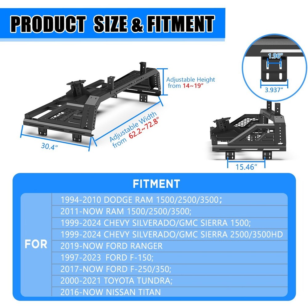 Home Payment Shipping Return Policy About Us Contact Us Feedback Store Categories Other Fog Lights For Ford For chevy For Toyota For Honda Headlights OEM Headlights For Ford For chevy For Toyota Tail Lights For Ford For chevy For Toyota Jeep Wrangler JK Ford F150 Bumper Ford Bronco Bumper Mini Refrigerator Jeep Wrangler JL Jeep Gladiator JT Fender Black Full-size Modular Adjustable Bed Rack Roll Bar For Ranger/ Silverado/f-150 Selling Point: Modular Overland Bed Rack (Front) LED Light Mounting Bracket: 1. Pod light or Light Bar can be installed 2. Adjustable position of mounting bracket 3. Adjustable height range of 4.84-7.6 inches Decorative Bezel: 1. Honeycomb Mesh Allows DIY colour spraying Side Rail Mounting Bracket: 1. Compatible with factory bed rail Mounting Base: 1. Compatible with most retractable, roll-up, and folding bed covers 2. bed covers will not be able to fold completely back 3. Can be secured by punching holes in the bed shoulders or Locked to factory side rails Spare Tyre Carrier: 1.Can be mounted directly on the bed, but requires pre-punched holes and installation of the rivet nut 2.Compatible with most off-road tire 3.Available in 5mm steel plate 4.Width adjustment range 66.2-74.8 Inches Specification: Material: Steel Type: Truck Bed Roll Bar Mounting Hardware: Included Surface Finish: Black Powder Coated Finished Surface: Anti-corrosion Textured Powder Coating Adjustable Length: 62.2-72.8 inches Height:14-19 inches Fitment: for 1994-2010 Dodge Ram 1500/2500/3500 for 2011-2024 RAM 1500/2500/3500 for 1999-2024 Chevy silverado/GMC sierra 1500 for 1999-2024 Chevy silverado/GMC sierra 2500/3500HD for 2019-now Ford Ranger 1997-2024 Ford F-150 for 2017-now Ford F-250/350; 2000-2021 Toyota Tundra for 2016-now Nissan Titan Package Includes: 1*Modular Overland Bed Rack (Front) 1* set of Mounting Accessories 1*Spare Tyre Carrier ABOUT US CONTACT US SHIPPING PAYMENT RETURN ABOUT US Me2motorsports was started in 2007 with the goal to provide products to consumers at an affordable price while providing excellent customer service. We specialize in the design and production of automotive lamps. Headlights, tail lights, fog lights, Jeep exterior parts Etc. Brand: Ford,Chevy, Dodge, Toyota, Jeep,Nissan,Honda Etc More good things are welcome to enter the my store to buy ! ! ! We are located in Southern California. Our office hours are Monday through Friday from 9 AM to 5 PM PST. CONTACT US We have a customer service team that can answer any questions or concerns during our hours of operations, Monday through Friday from 9 AM to 5 PM PST. You can reach us via messages. SHIPPING Orders placed before 2 PM PST will be processed the same day. All orders after 2 PM PST will be processed the following business day. We ship our packages out via UPS for most customers excluding PO/APO Box and international addresses in which we use USPS. We offer expedited services via UPS Next Day Air and UPS 2nd Day Air. Tracking numbers are provided within the following business day. Please note that we are located in Southern California. We offer free shipping for the 48 contiguous states. Additional shipping fees apply to Hawaii, Alaska, Puerto Rico, Virgin Islands, Guam, American Samoa, and the Northern Mariana Islands. Additional shipping fees are applicable for PO/APO Boxes, International, and expedited. PAYMENT We accept PayPal, Google Pay, Credit Cards, and Debit Cards. - International Buyers are responsible for any customs and duties fees for their country. - Please note that packages shipped to a PO BOX are shipped via USPS. RETURN We offer a 30-day return policy, from the date of purchase, if for any reason you are not satisfied with the product. There will be a 20% stocking fee and the original cost of shipping may be charged for all returns. Please note that all returns must have a return request approved. Based on the situation, a return label may be provided by us. Non-Domestic Product No Fitment Type Direct Replacement Color Black Manufacturer Part Number Does not apply Mounting Hardware Included Yes Material Steel Compatible Roof Type Raised Roof Rails Adjustable height-range 14-19 inches Placement on Vehicle Rear and Upper Brand WolfX Type Roll Bar Adjustable width-range 53-62.5 inches Manufacturer Warranty 1 Year Style Modular Features Adjustable, Heavy Duty Country/Region of Manufacture China