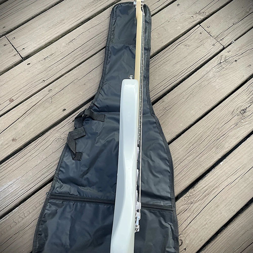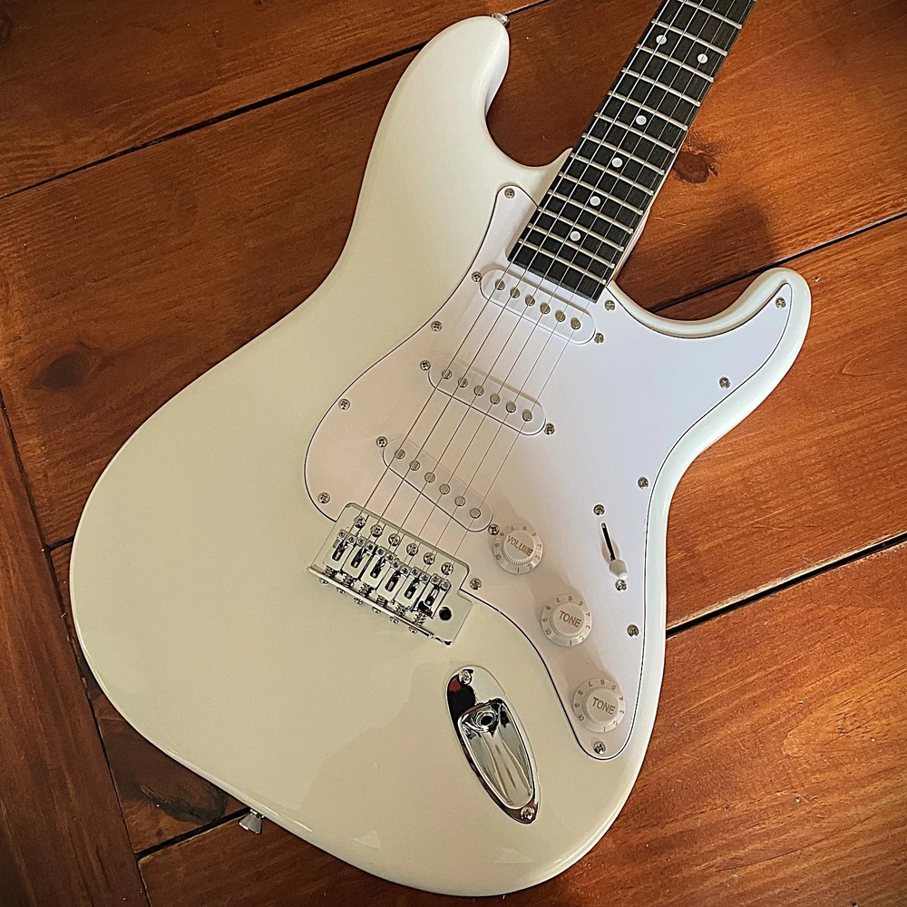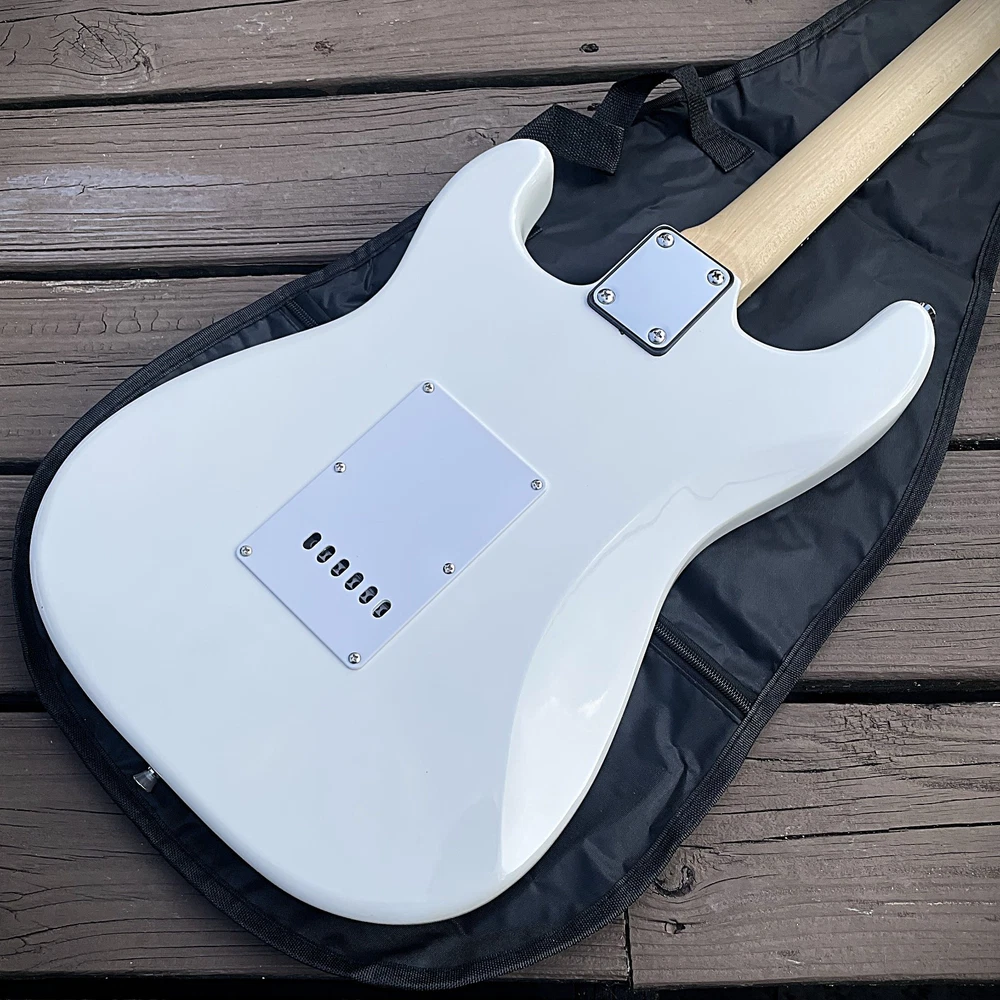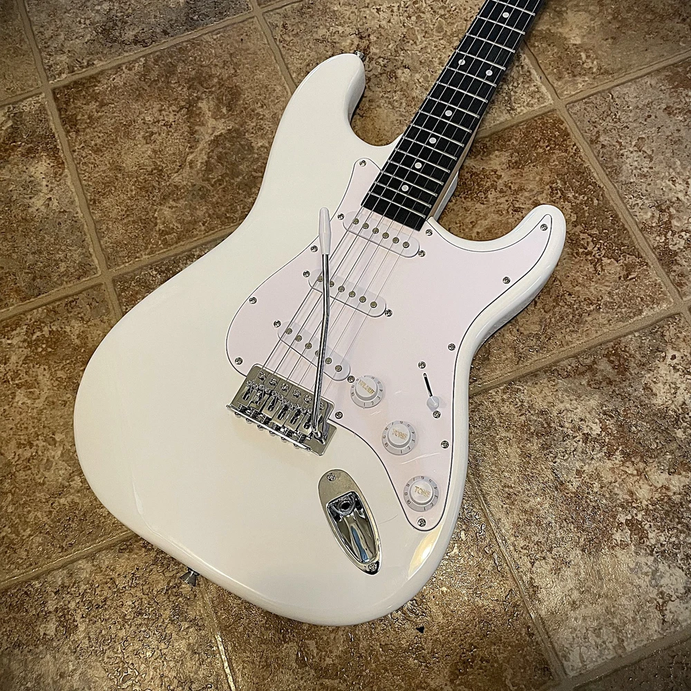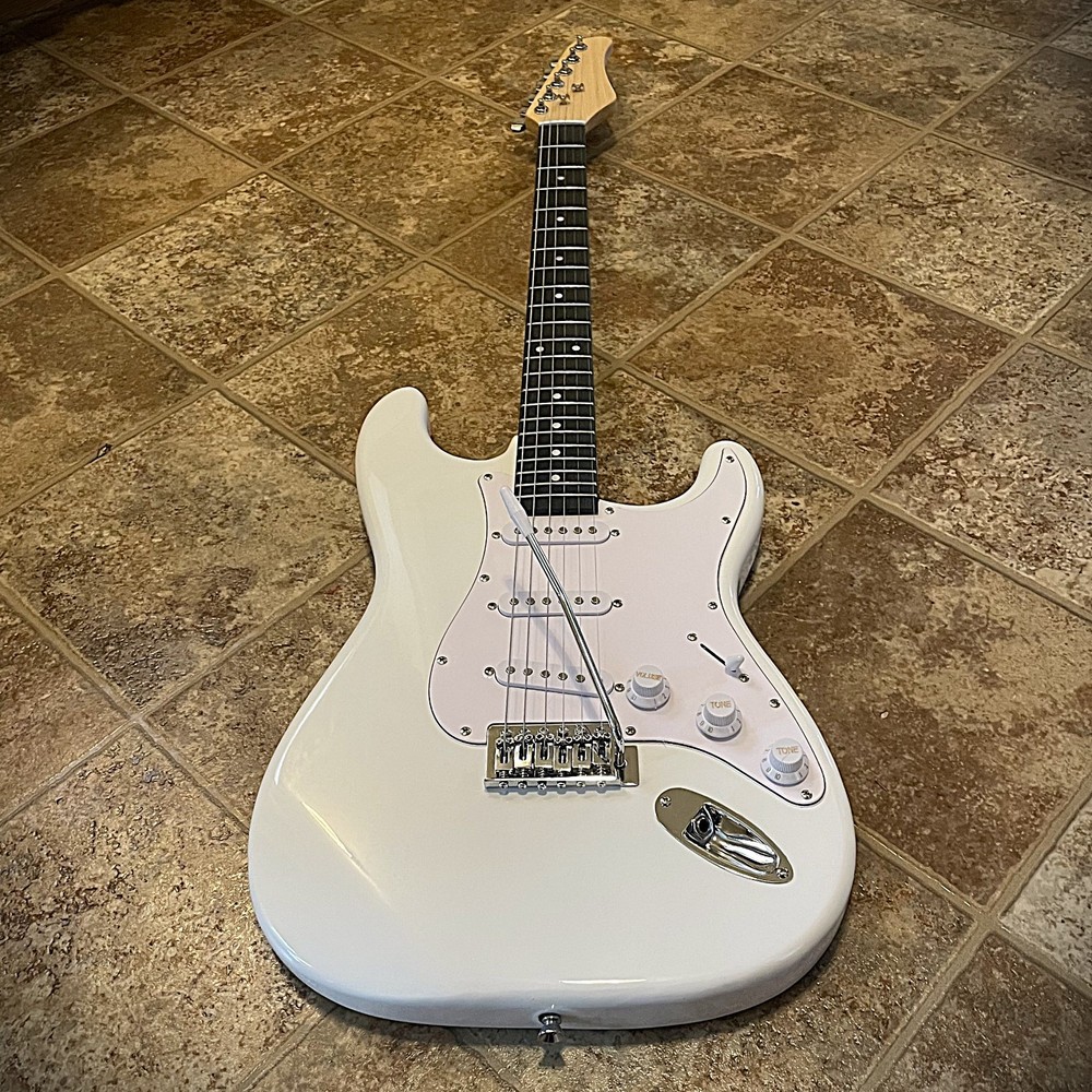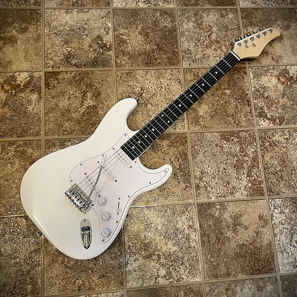 This eye-catching full-size Olympic white Unbranded Strat style electric guitar plays, looks, and sounds great. The solid basswood body with a double cut iconic design looks great and is very comfortable to play. The guitar has a 22-fret rosewood fretboard and maple neck. The guitar is extremely versatile with the S-S-S pickups, 5-way pickup selector, and two tone and one volume knob. It is great for playing everything from blues, rock, metal, jazz, pop, and much more. The guitar comes complete with with gig bag, strap, instrument cable, whammy bar, pick, and tools for adjustment. The guitar is not only affordable but well crafted and eye-catching and really can't be beat for the price. Specifications: Overall Guitar Length: 39.4" Lower Bout: 11.8" Color: White Weight: 5.9 lb Body: Solid Basswood Fingerboard Material: Rosewood Number of Frets: 22 Nut Width: 1.656 in. (42 mm) Scale Length: 25.5" Orientation: Right Handed Number of Strings: 6 Package Includes: 1 x Electric Guitar 1 x Strap 1 x Instrument Cable 1 x Gig Bag 1 x Whammy Bar 1 x Pick 2 x Allen Wrenches