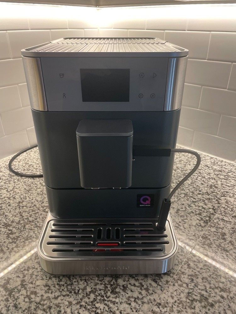 The KitchenAid KF7 fully automatic espresso machine is a versatile and convenient appliance for making a variety of coffee beverages such as espresso, latte macchiato, and cappuccino. With features like a built-in grinder, frother, programmable controls, and adjustable coffee spouts, this machine offers convenience and precision in every cup. The machine also includes useful components like a self-cleaning mode, water level indicator, and removable drip tray, making it easy to use and maintain. Perfect for coffee enthusiasts looking for a high-quality and efficient espresso machine for their home. Has only been used once for testing. Works great but I want a manual machine. Comes with a warranty.