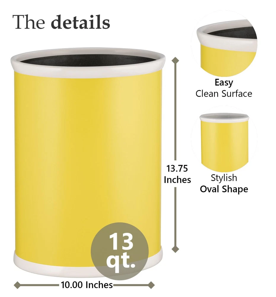 With a large 13-quart capacity, the Fun Colors Waste Basket in Lemon can accommodate any need and room. The internal metal construction of this waste basket is perfectly adorned with lovely leatherette covering. Attractive, easy to clean, and functional definitely describe this item. The Fun Colors Collection also includes an ice bucket and round waste basket in black, blue, green, orange, red, and white. This yellow waste basket measures 13.75" H x 7.75" L x 10" W and is sold individually. With a large 13-quart capacity, the Fun Colors Waste Basket in Lemon can accommodate any need and room.